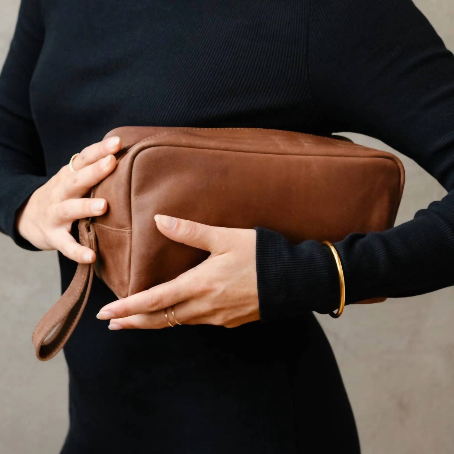 A stylish bag to use for makeup, skincare, or anything else you might want to travel with in style. Introducing the Women's Avery Dopp Kit Case by ABLE in a rich Whiskey hue, a perfect companion for organizing your travel essentials. Crafted from our signature full grain pull up leather, this case combines style and functionality with a convenient hang strap. Measuring 5.5 inches in height, 9 inches in length, and 4.5 inches in width, it provides ample space for your items. Proudly made in Ethiopia, this leather accessory is both durable and chic.