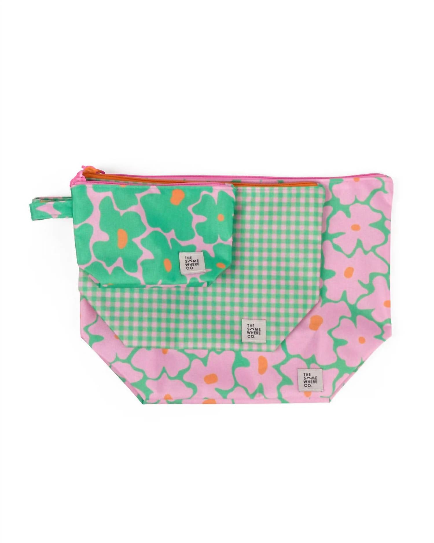 The perfect makeup bag for all your essentials. Introducing the Handy Pouch Trio by The Somewhere Co., a vibrant and practical accessory in Blossom Pink/Green designed to add fun to organization. Crafted from 100% nylon, these pouches feature a water-resistant coating and zip closures, complete with fabric hooks for convenient hanging. Dimensions are impressively varied with the large pouch at L 24cm x W 34cm x D 15cm, medium at L 18cm x W 26cm x D 11cm, and small at L 10cm x W 17cm x D 5.5cm, offering versatile storage options. For care, simply spot clean with a makeup wipe or detergent and rinse.