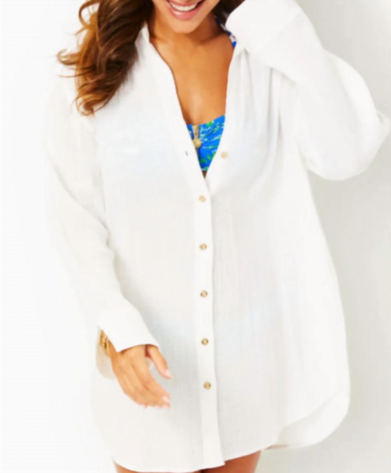 You're go-to coverup for pool parties, beach days and long weekends. Elevate your beachside style with the Kwitney Long Sleeve Cotton Cover-Up by Lilly Pulitzer, now available in a classic white. Designed with a full-length sleeve and solid pattern, this chic cover-up offers full coverage to protect you from the summer sun. Crafted from soft and breathable cotton, it includes a classic collar and button front for a comfortable fit. Care is straightforward with machine wash instructions, making it an easy choice for your warm-weather wardrobe.