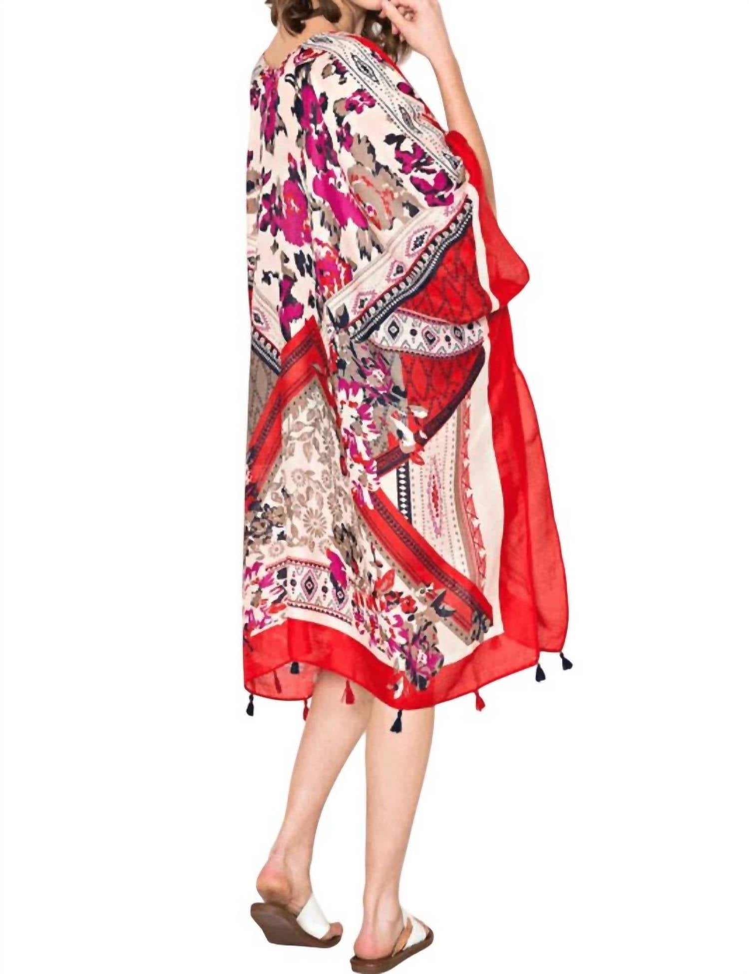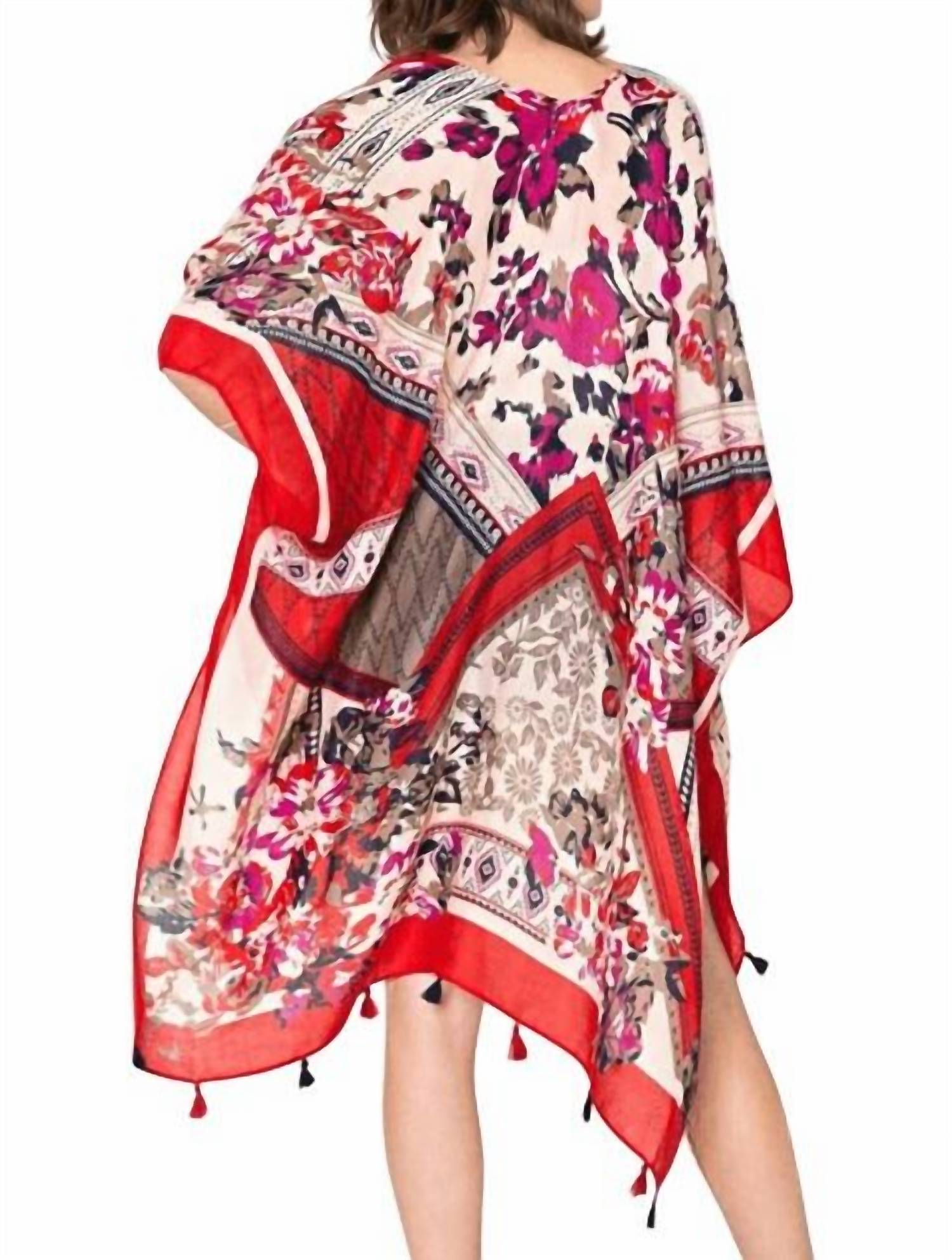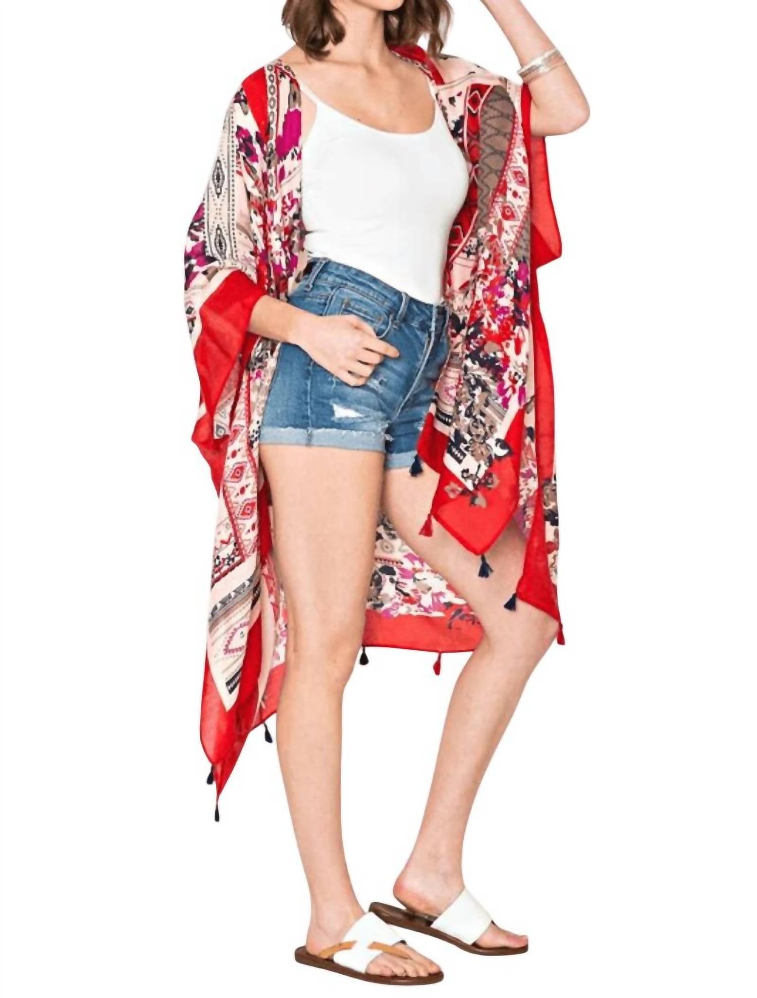 Discover the Antalya Scarf by Justin & Taylor, a vibrant accessory that brings the essence of the beaches to your wardrobe. Featuring a bright red multi color palette, this scarf boasts an oversized silhouette perfect as a shawl, scarf, or swimsuit cover-up. Made from 100% polyester with arm tacks and decorative corner tassels, it is imported and designed for women. For care, simply hand wash in cold water and hang dry, or opt for dry cleaning.