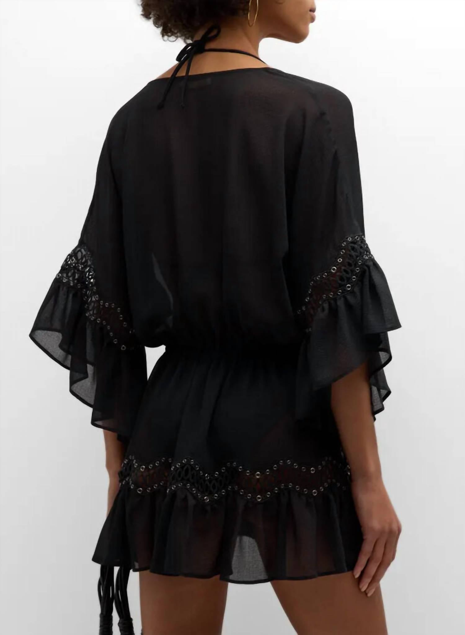 A comfy-all-day coverup that works just as good at dinner as it does by the pool. The Amalia Lace-Trimmed Caftan Cover-Up by Ramy Brook is perfect for beach days and summer getaways. Made from soft, semi-sheer 100% Polyester, this black solid cover-up features relaxed kimono-style sleeves and a plunging V-neckline adorned with delicate lace. The flattering drawstring waist with tassel ties ensures a comfortable fit, while the tiered flounce hem adds a playful touch. A boho-chic essential, this piece effortlessly blends sophistication and ease.