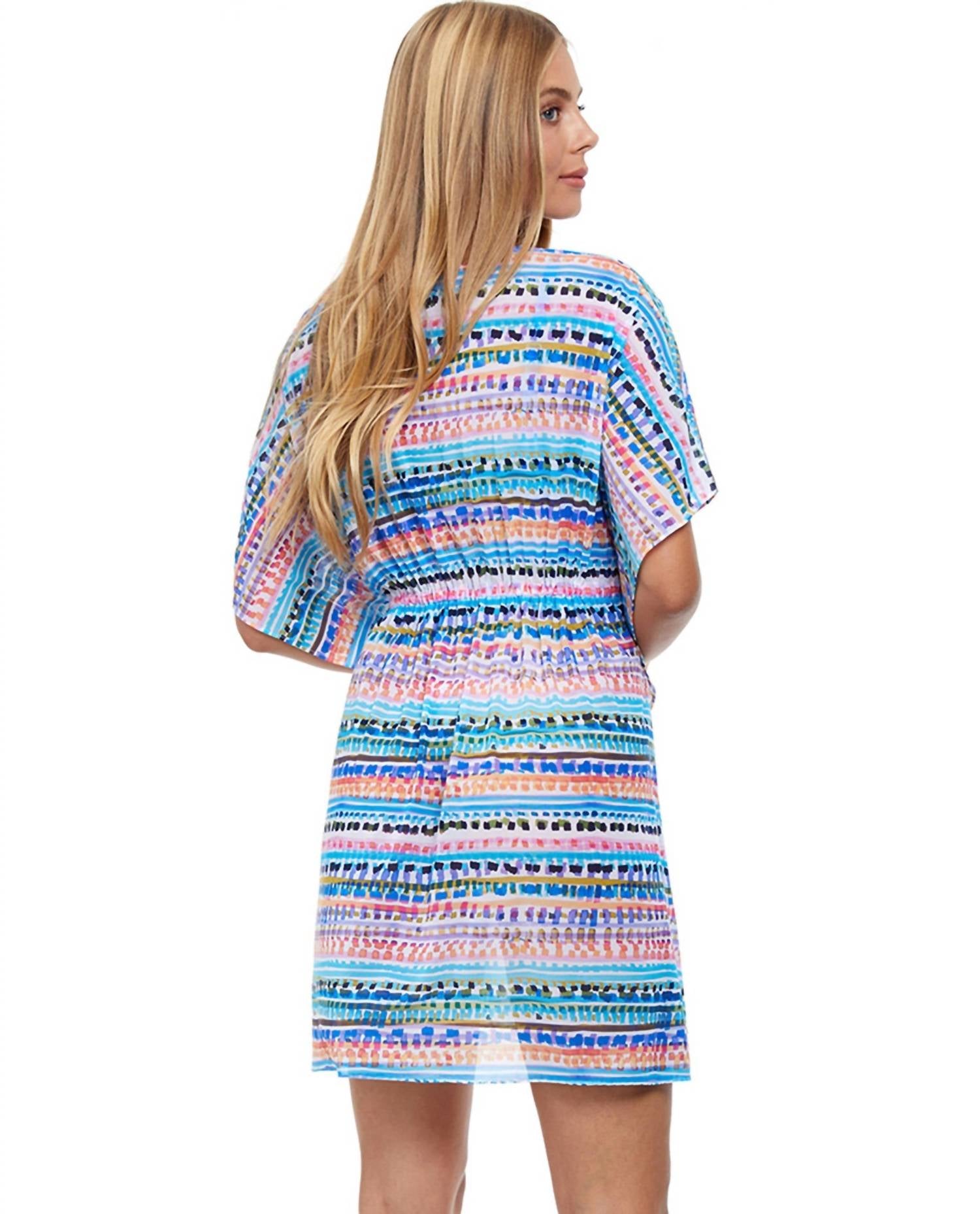 This Tunic Cover Up features a Plunging V-neck. Short sleeves. Drawstring waist. Side slits. Semi-sheer. Imported. 90% polyamide, 10% elastane. Hand wash.