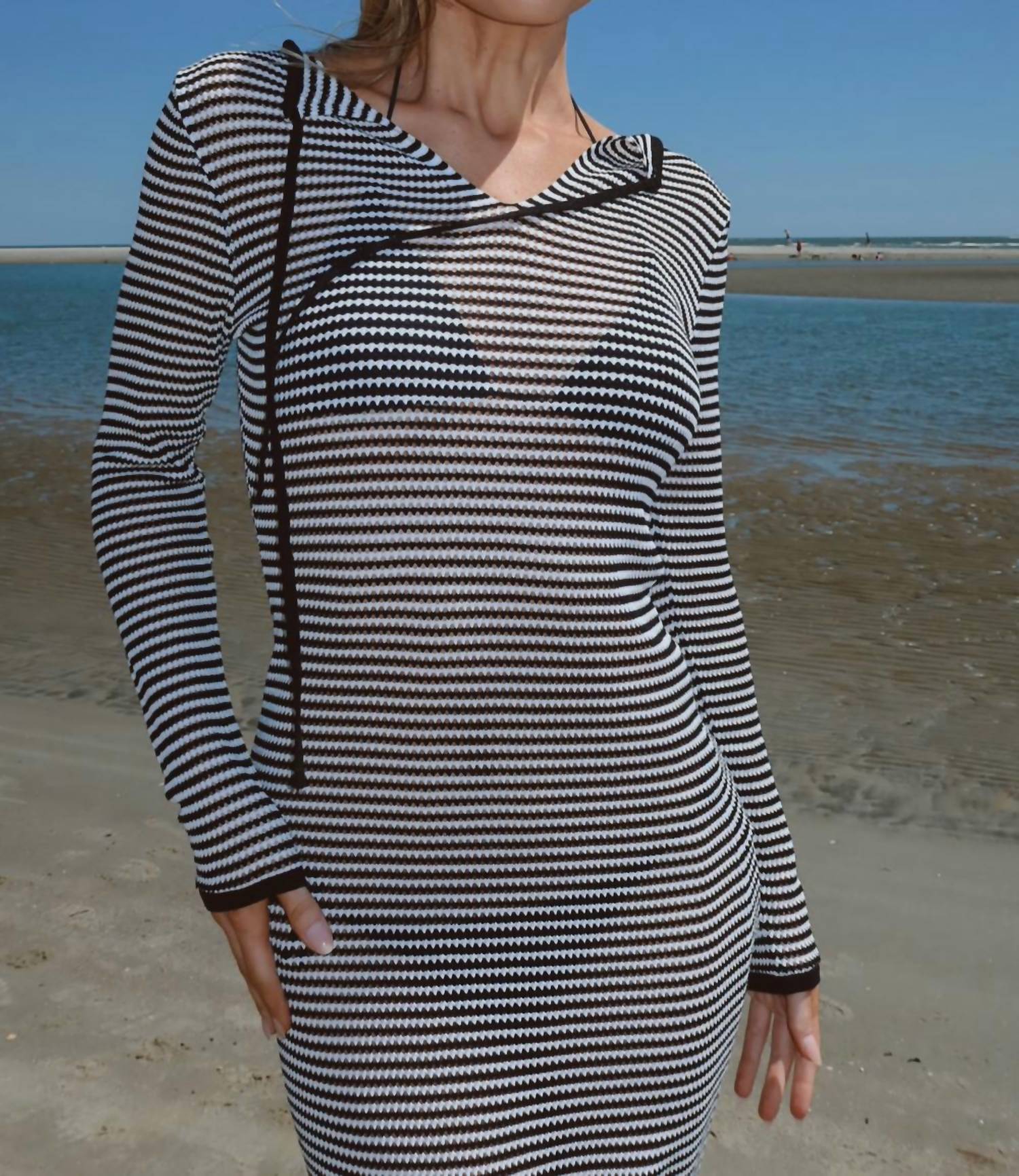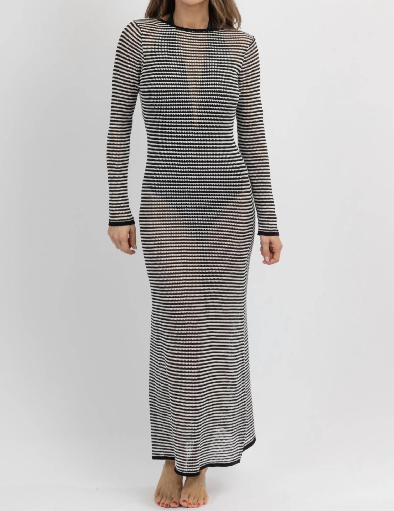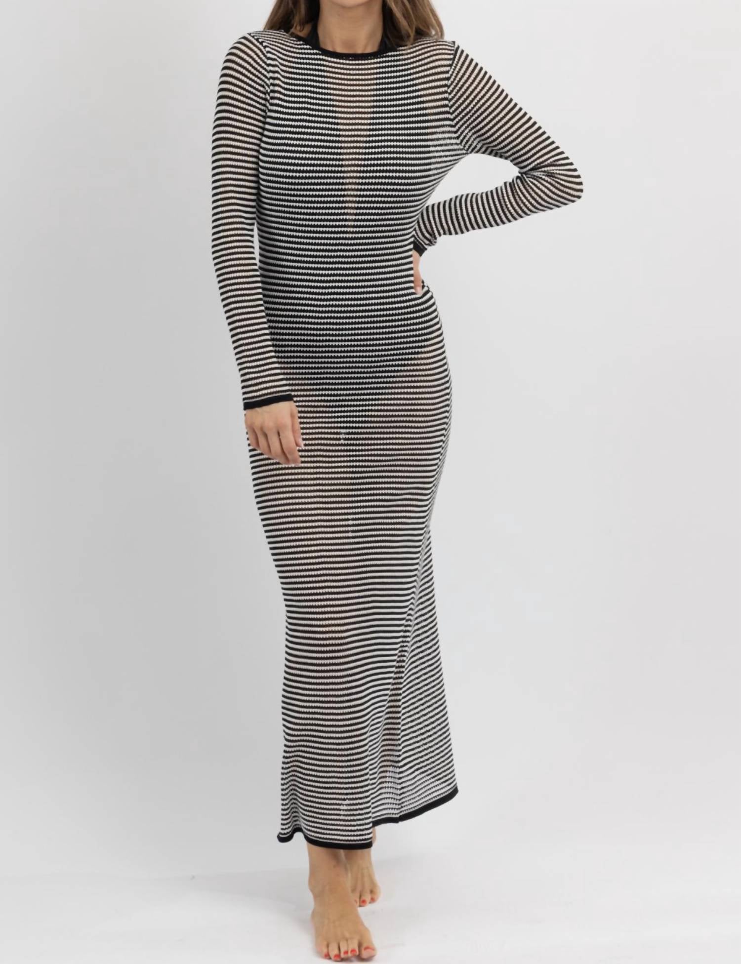 You're go-to coverup for pool parties, beach days and long weekends. Meet the Rhea Stripe Knit Cover Up by Sweetkama, a chic addition to your swimwear ensemble in classic black and white stripes. Crafted entirely from 100% Polyester, this cover up flaunts long sleeves and a maxi length for full coverage. It boasts a sheer, unlined design with wide ribbing and a captivating open back with tie detail, perfect for layering over your swimsuit. Model, standing at 5'8" and typically wearing size 2, is pictured in a size small.