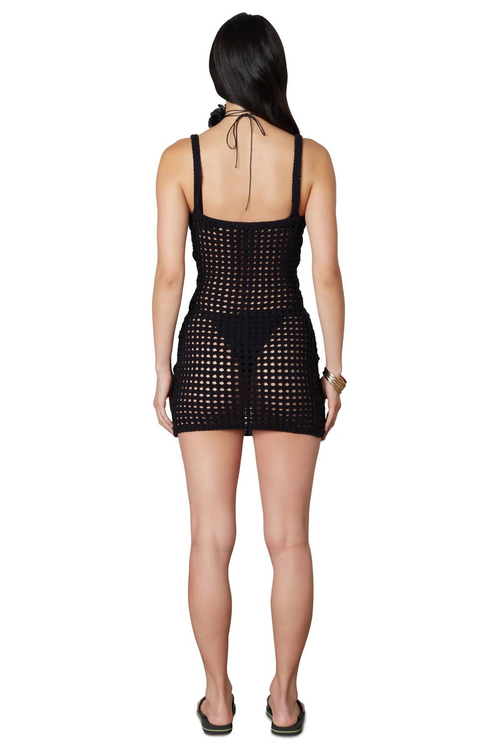 A comfy-all-day coverup that works just as good at dinner as it does by the pool. Elevate your beach day attire. Chic and flirty mini dress designed to captivate. Features an open-knit pattern and a daring plunge neckline, offering medium coverage with a bodycon fit. Crafted in a bold black hue. Unlined and perfect for sunny summer days. Hand wash recommended.