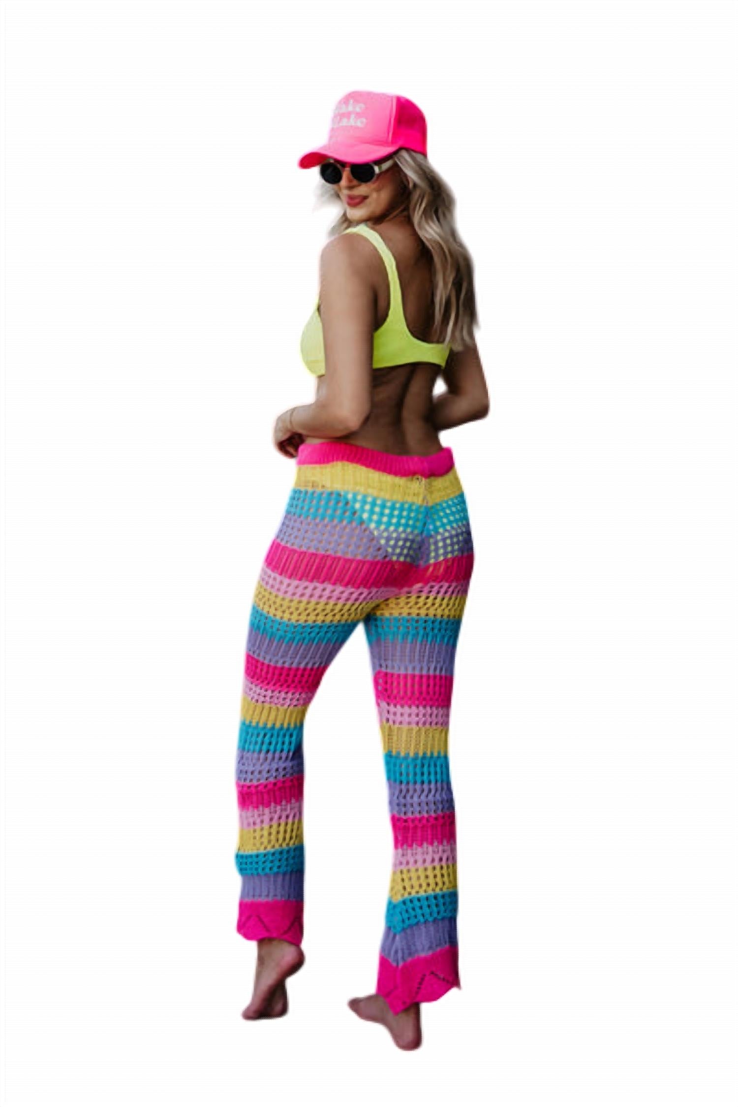 A comfy-all-day coverup that works just as good at dinner as it does by the pool. Crafted from 100% polyester, these lightweight pants feature a stylish crochet knit and a playful scalloped hem. Perfect for catching the sun's glow, they are a straight leg fit ideal for carefree summer moments. For easy maintenance, simply machine wash cold and dry flat.
