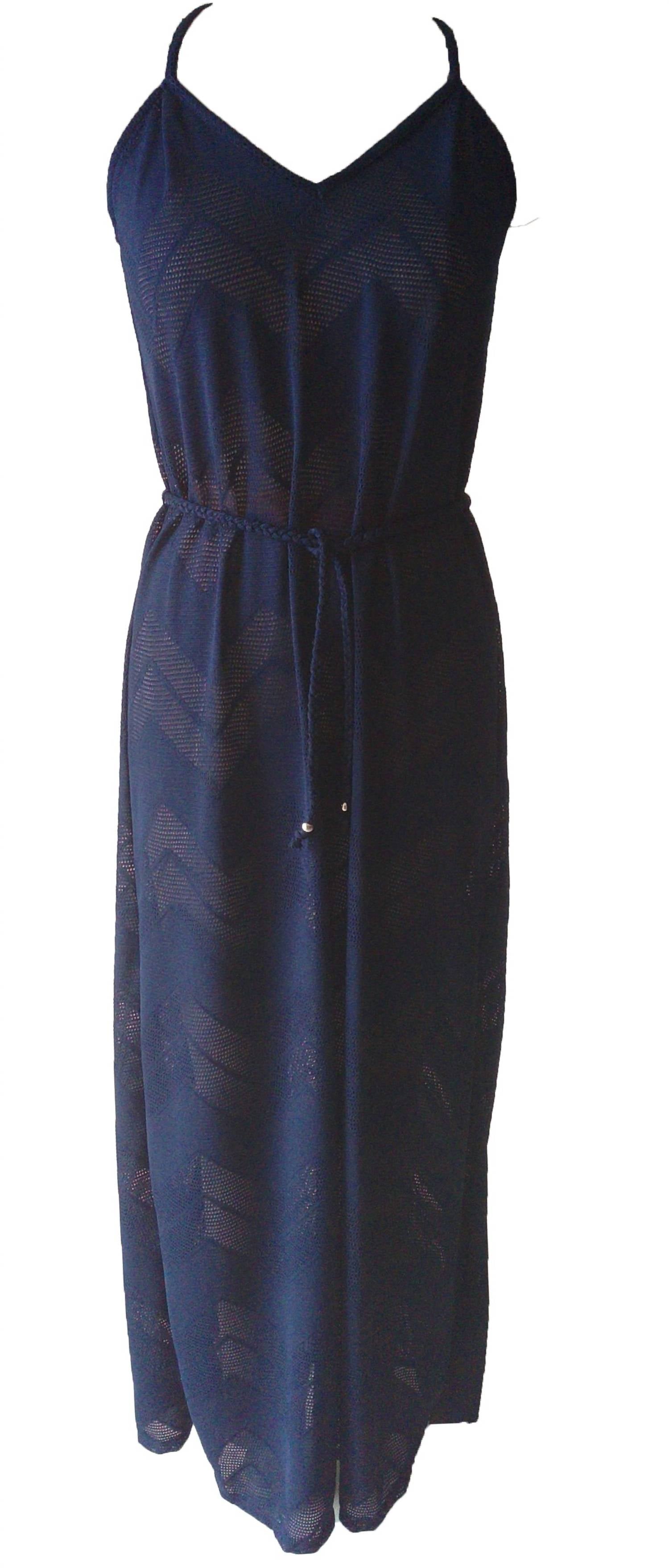 You're go-to coverup for pool parties, beach days and long weekends. Introducing the Paula Maxi Dress Cover-up by Malibutique, a chic addition to your beachwear collection in a sophisticated navy blue. This maxi-length cover-up is crafted from a solid mesh fabric, providing full coverage. It features a stylish braided belt at the waist, accentuating your silhouette with ease. Care instructions include hand wash and lay flat to dry, ensuring long-lasting wear.