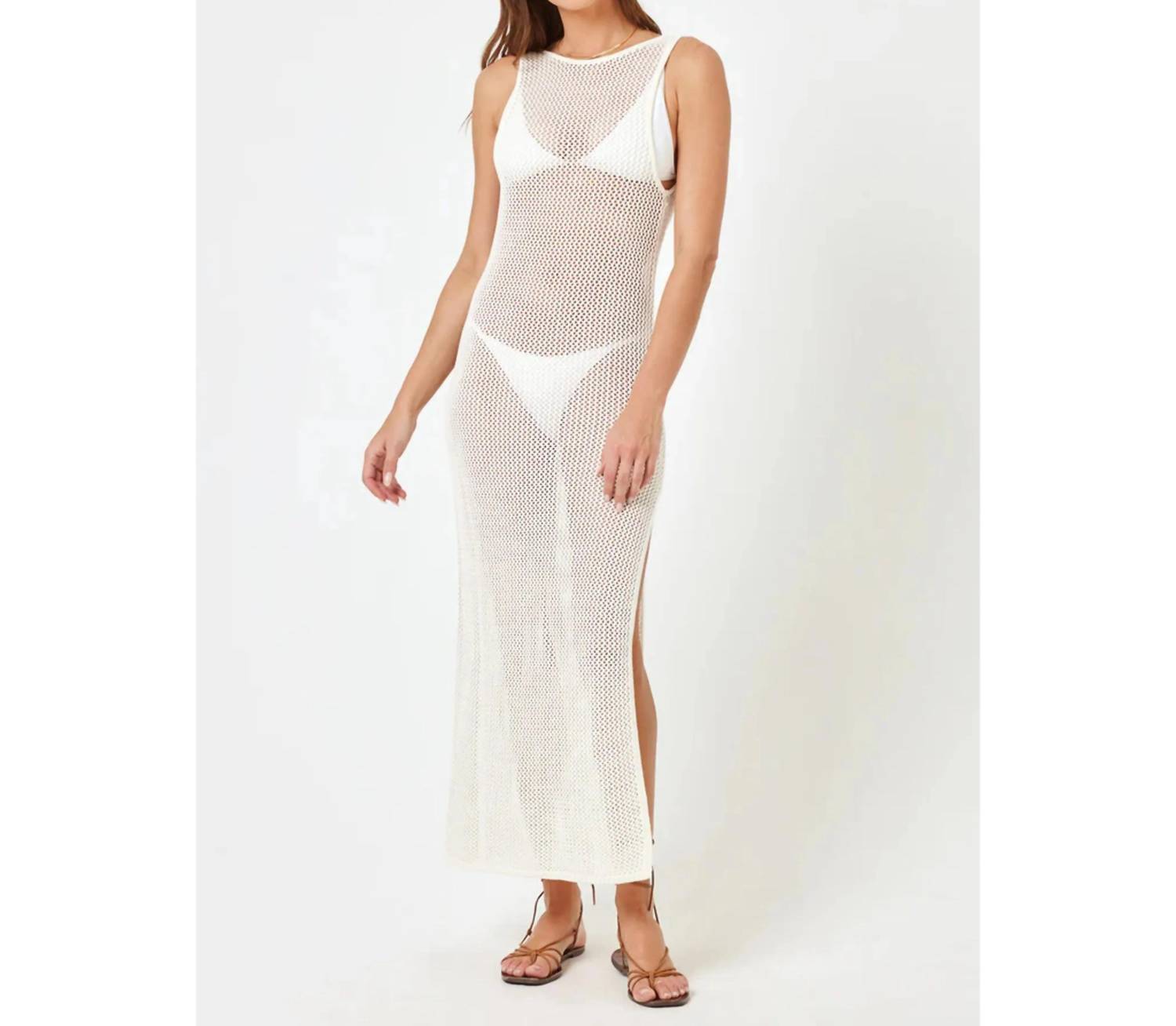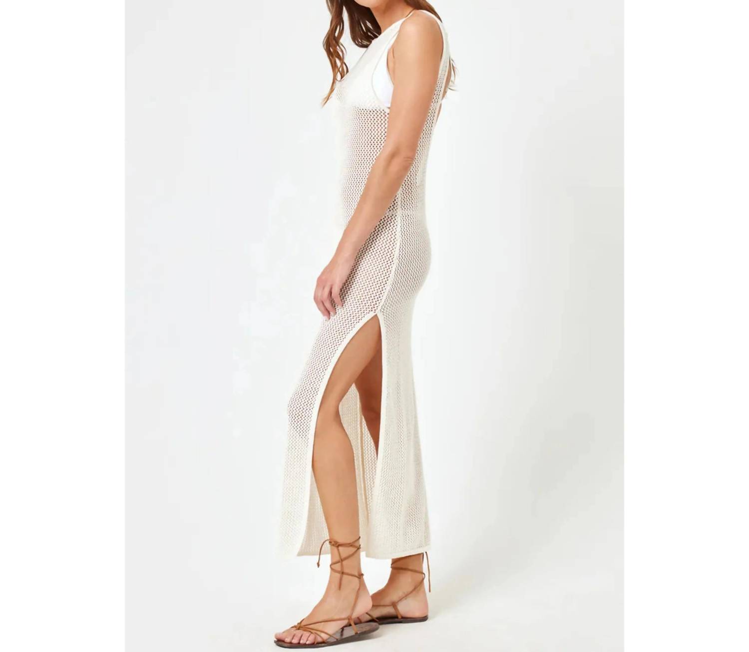 You're going to want to pack this for your next vacation! Introducing the Villa Nova Cover Up by L*SPACE, a must-have for your summer beach days in a chic beige hue. This crochet fabric dress is crafted from 100% cotton and showcases a flattering boat neck, low back, and stylish tank straps. Its midi length and leg slit add a touch of elegance for a preppy beach-ready look. Hand wash in cold water and lay flat to dry to maintain its delicate shape and color. Available in sizes XS-XL.
