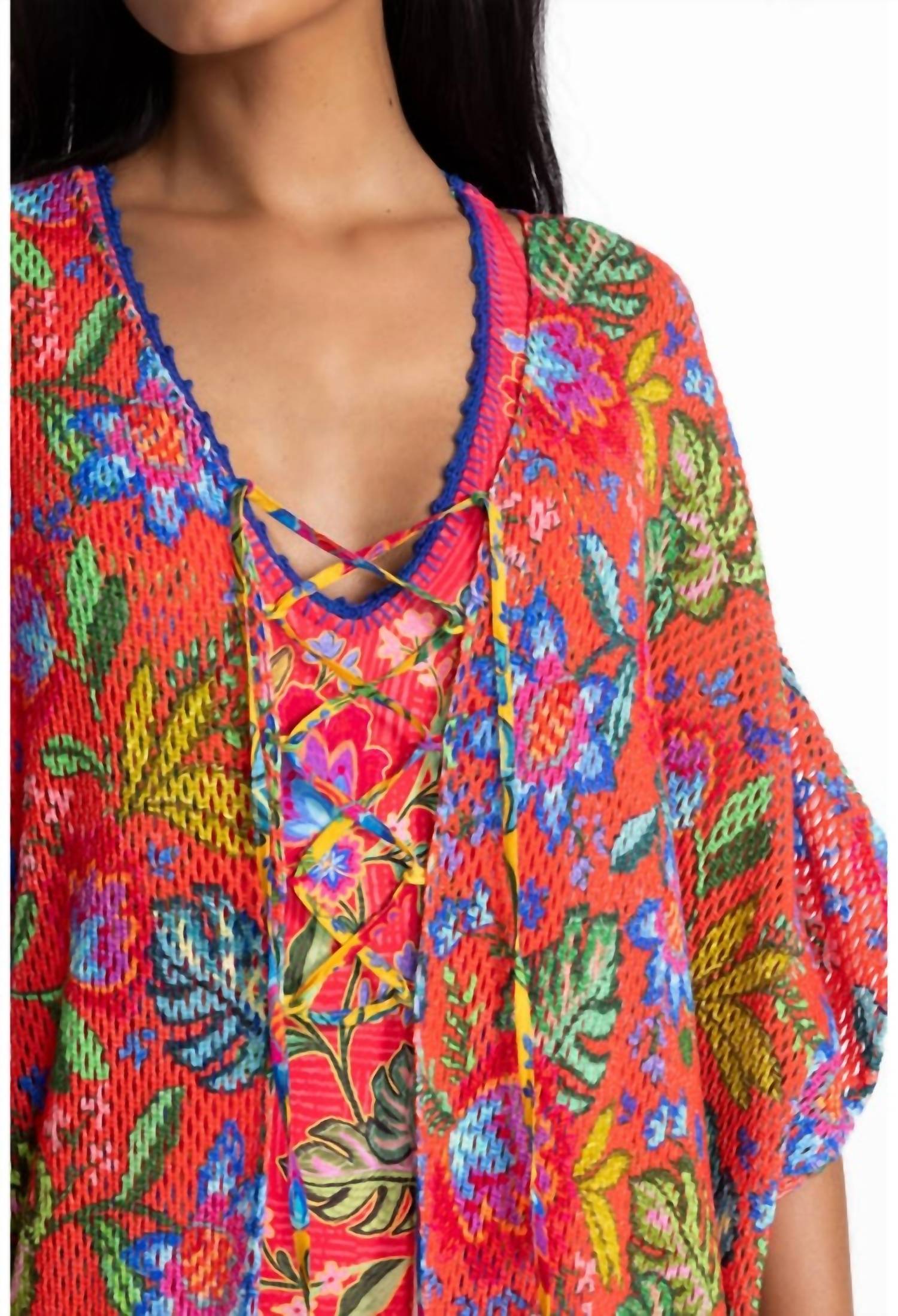 You're going to want to pack this for your next vacation! Made from 100% breathable cotton, the Maxi Crochet Kimono features a lively combination of vibrant florals and bold colors. Designed with a loop closure at the front, this flowing, maxi-length kimono is accented with dramatic Dolman sleeves. It layers beautifully over the Rumba Cross Back One Piece and Rumba Wrap One Piece for a polished, resort-ready look. Model is 5'10 1/2" and wearing a size S/M.