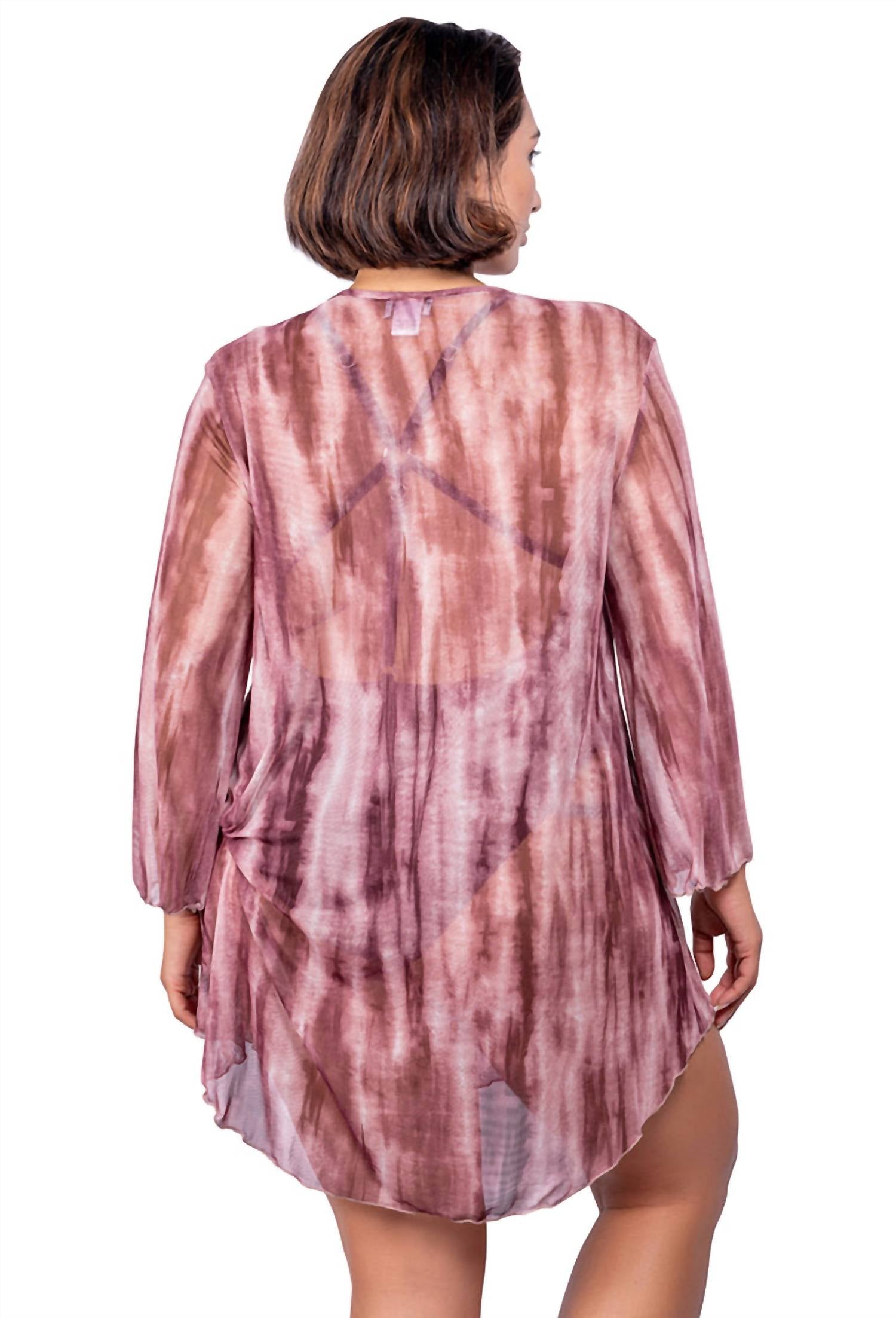 A comfy-all-day coverup that works just as good at dinner as it does by the pool. Elevate your wardrobe with the V-neck Bell Sleeve Tie Dye Tunic by Jordan Taylor, a statement piece. Featuring elegant bell sleeves, this tunic is crafted from a durable blend of 92% Polyester and 8% Spandex. Made in the USA, it highlights a striking tie-dye pattern and a shirt-tail hem, perfect for maximalist style aficionados. Enjoy easy wear with its pull-on closure and maintain its allure with hand washing care.
