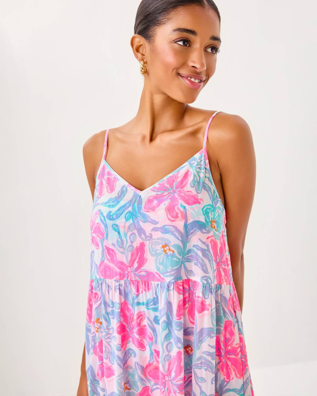 A comfy-all-day coverup that works just as good at dinner as it does by the pool. Embrace vibrant elegance with the Women's Mazarine Maxi Coverup by Lilly Pulitzer, a perfect choice for a beach day. This Coverup in the captivating Multi Beachside Haven color features a floral pattern that aligns perfectly with a maximalist trend, offering full coverage for a relaxing summer occasion. Designed without lining for a breezy feel, this dress invites comfort on warm days.