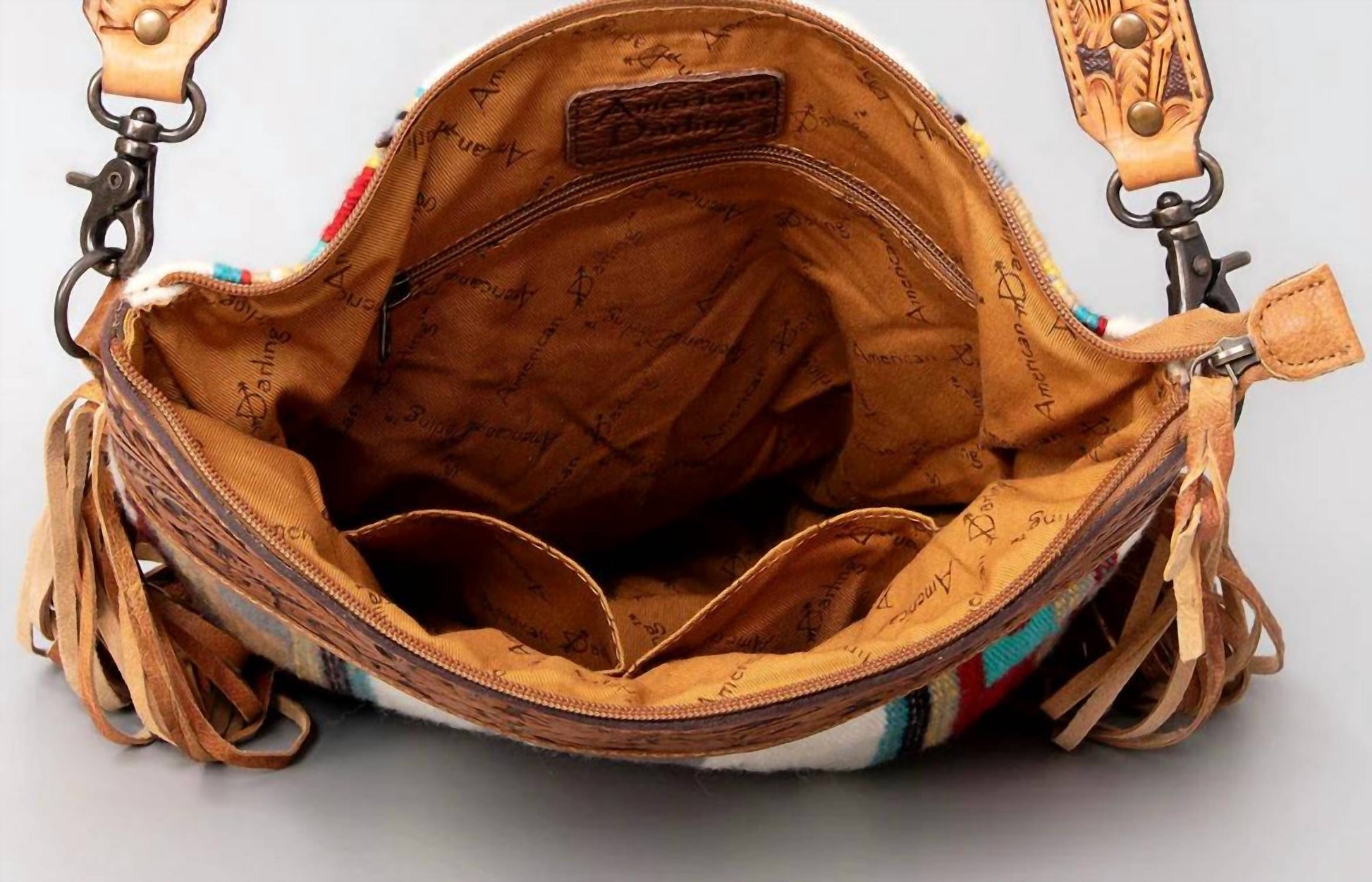A casual and cute take on everyone's favorite crossbody bag. Introducing the Women's Large Crossbody Messenger Bag by American Darling, a masterpiece of craftsmanship in multi-color. This bag features meticulously hand-tooled and carved details on genuine full-grain leather, enriched with a hand-weaved wool saddle blanket for a trendy yet traditional look. It includes an adjustable leather strap with hand-tooled patterns and is adorned with elegant leather fringes, adding a distinctive western flair. Secured with durable YKK zippers and antique-finish metal fittings, the bag provides longevity and style. Size: 15in (H) X 15in (W) X 3in (D).