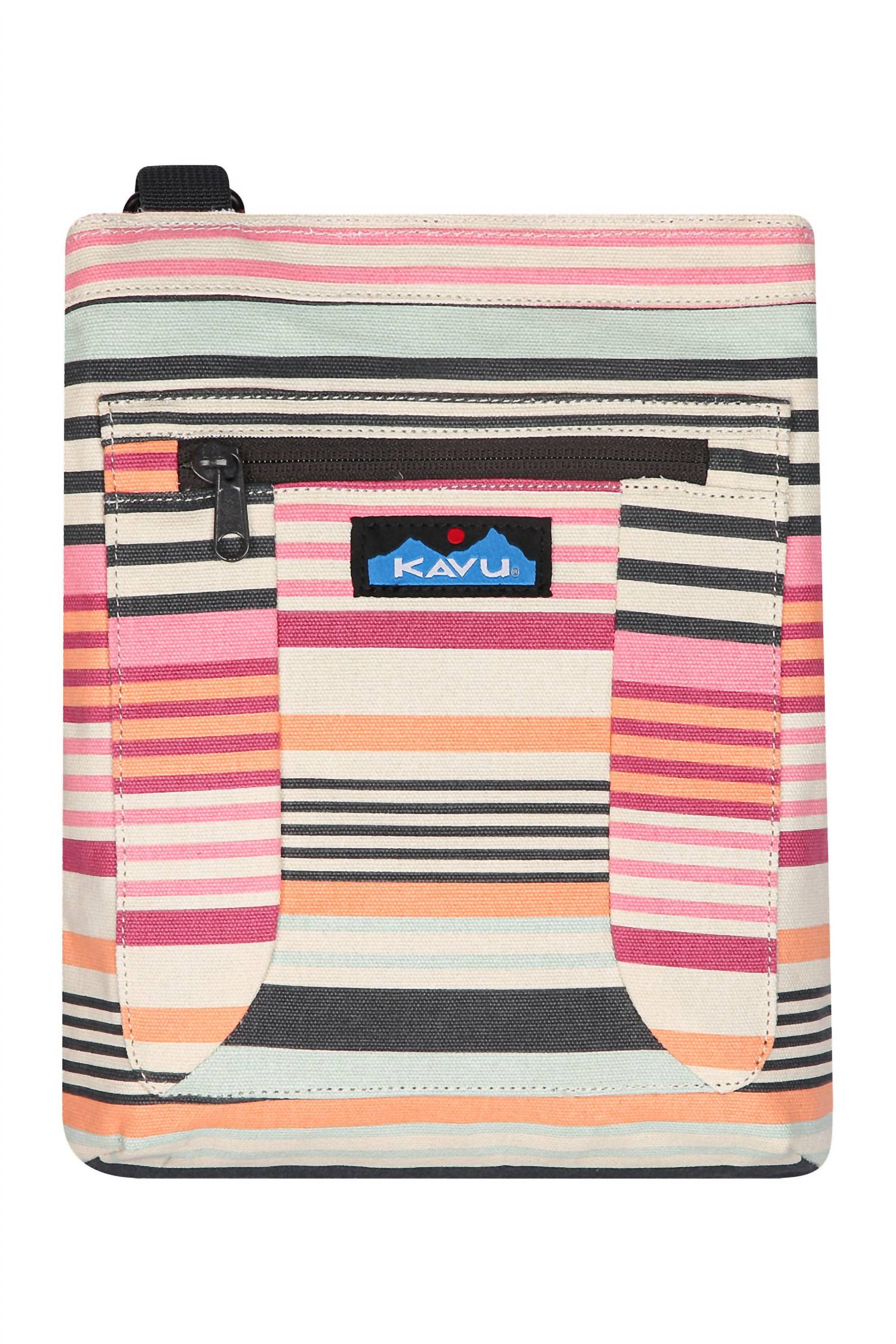 This crossbody bag will be your go-to bag of the season. Discover the KAVU Keepalong Bag in a vibrant Midsummer Stripe, perfect for adding a touch of outdoorsy flair to your look. Crafted from durable 12oz 100% cotton canvas, this crossbody bag features an adjustable rope shoulder strap with a plastic side release buckle and metal hardware. It includes convenient compartments—a main compartment with a snap closure, a front zip pocket, back flat pocket, and a padded internal pocket—along with a plastic key clip. With dimensions of 11” x 9” and a strap length of 44" - 50", it's perfectly sized for everyday essentials.