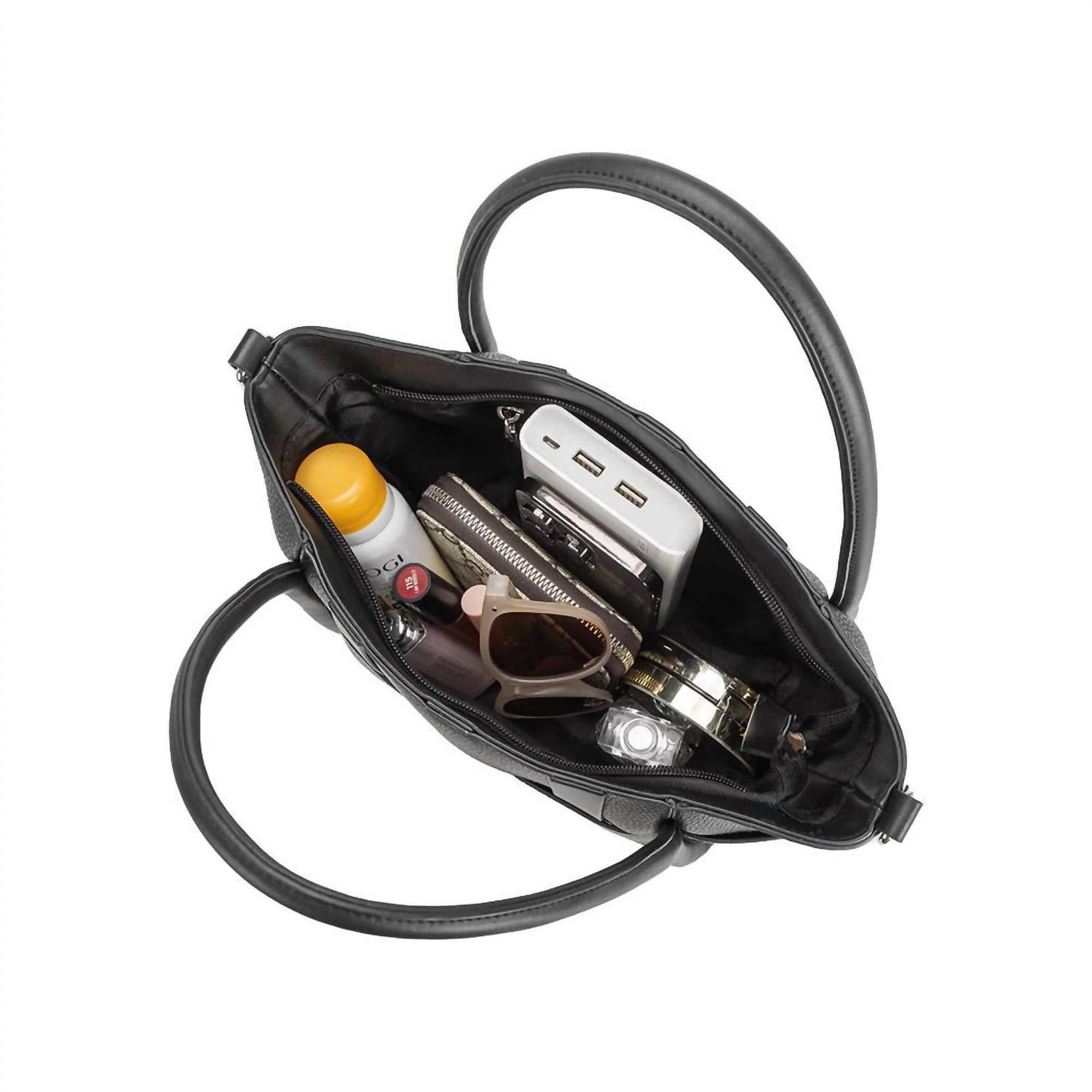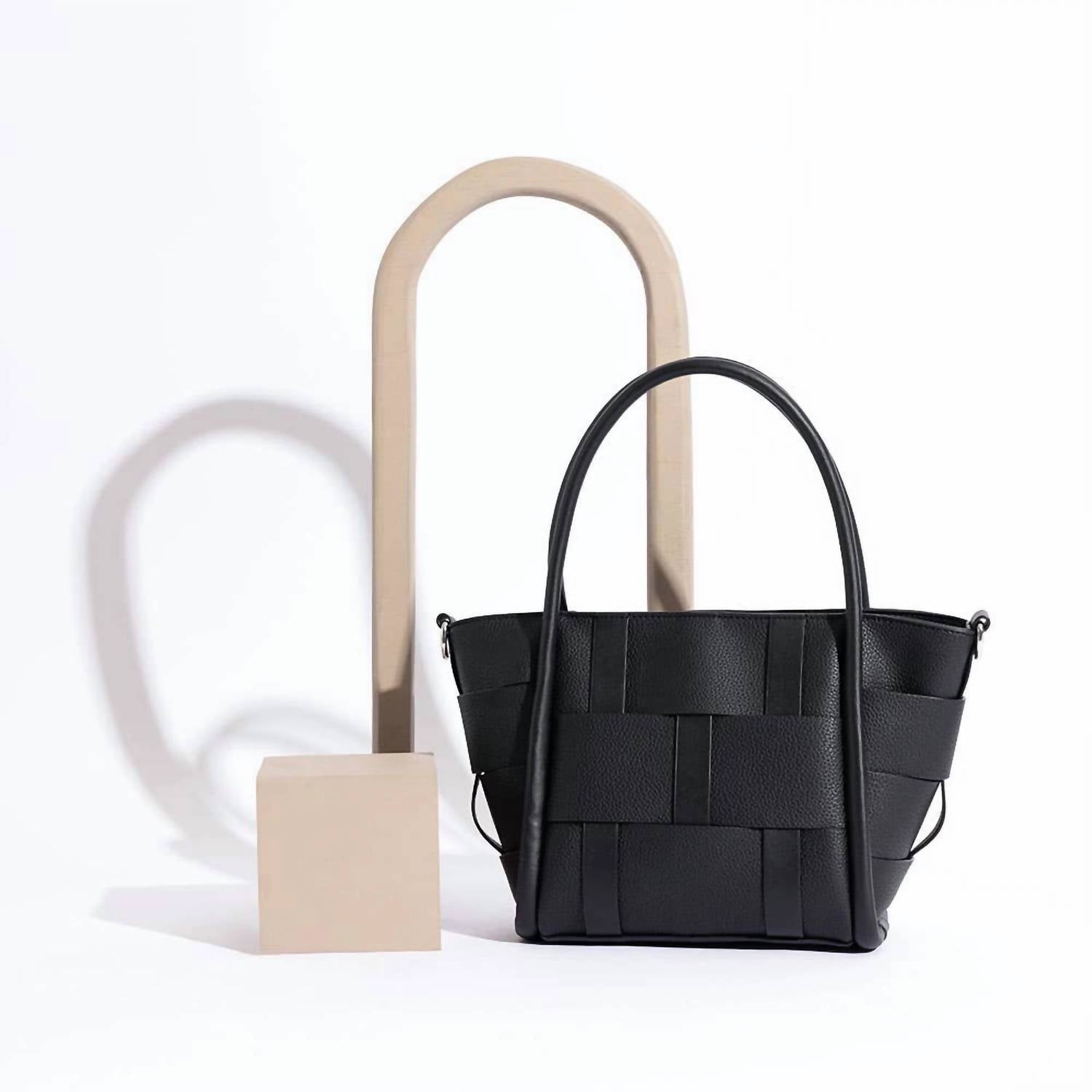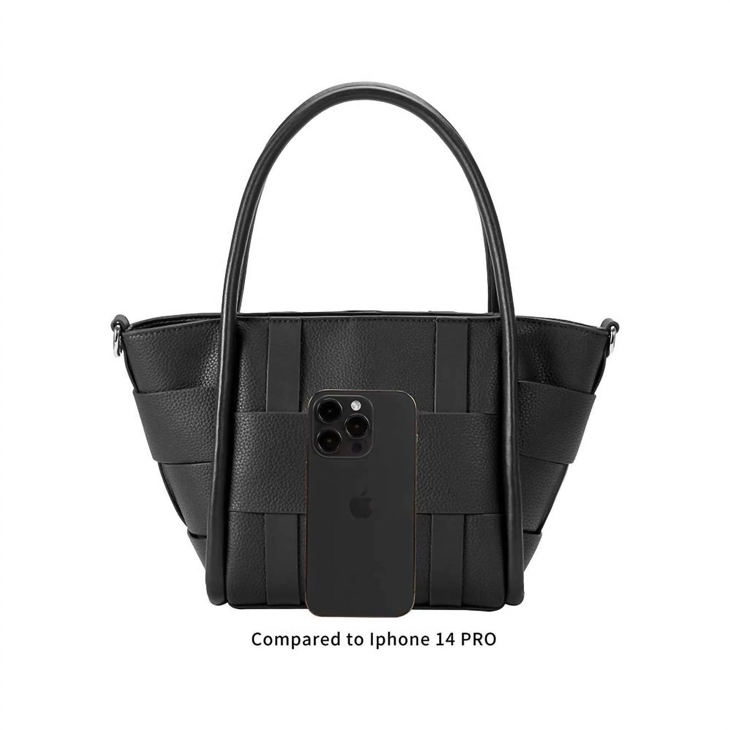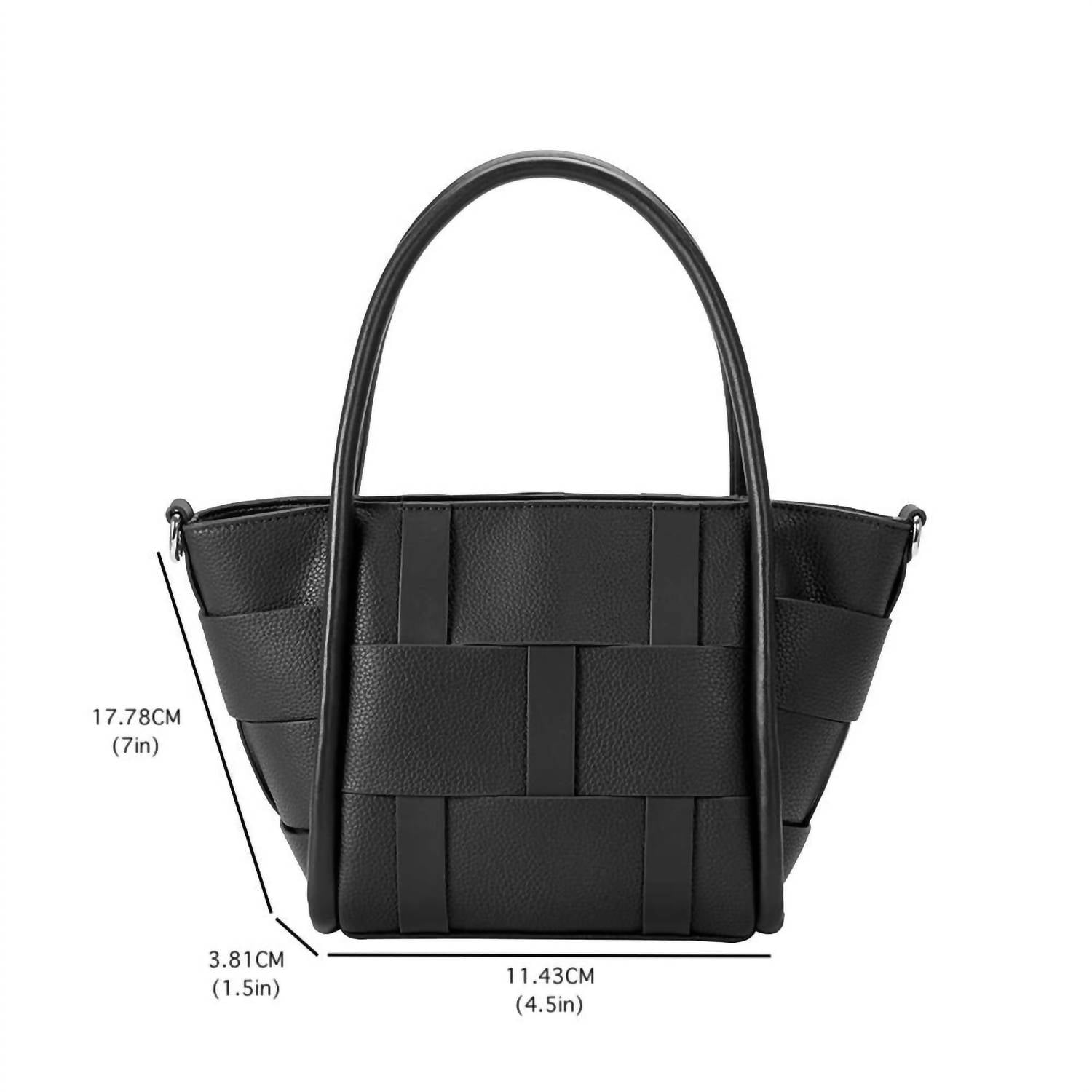The crossbody bag is a trend that is here to stay and we especially love this style. Discover the Women's Lanie Recycled Vegan Crossbody Bag by Melie Bianco, a harmonious blend of sustainability and elegance. This refined black crossbody is crafted from recycled vegan leather, featuring meticulous weaving and a convenient zipper closure. Measuring 12" in width, 7" in height, and 4.5" in depth, it includes a handle drop of 6" and an adjustable strap length ranging from 45" to 51". The bag's interior boasts an OEKO-TEX certified lining with a zip pocket, complemented by sleek silver hardware and designed to fit up to an iPhone 14 Pro.
