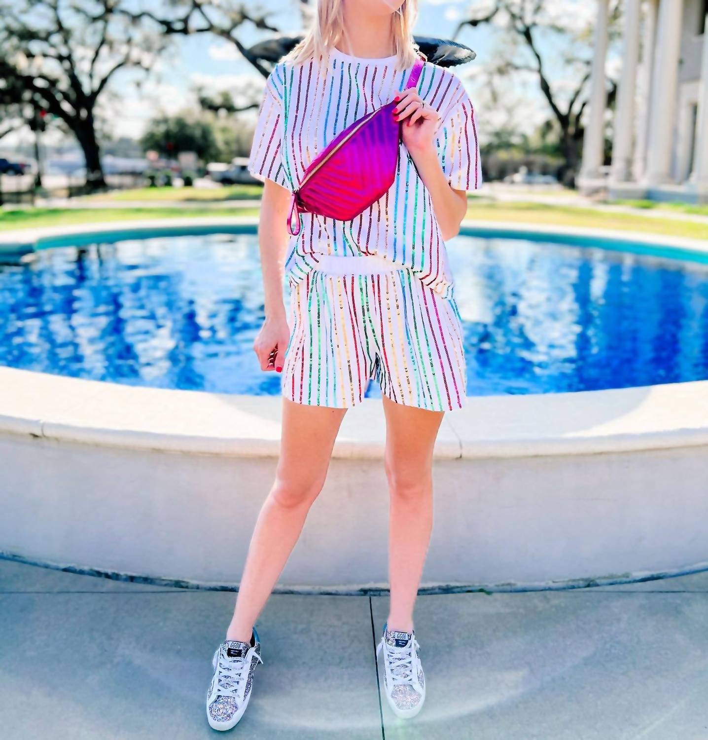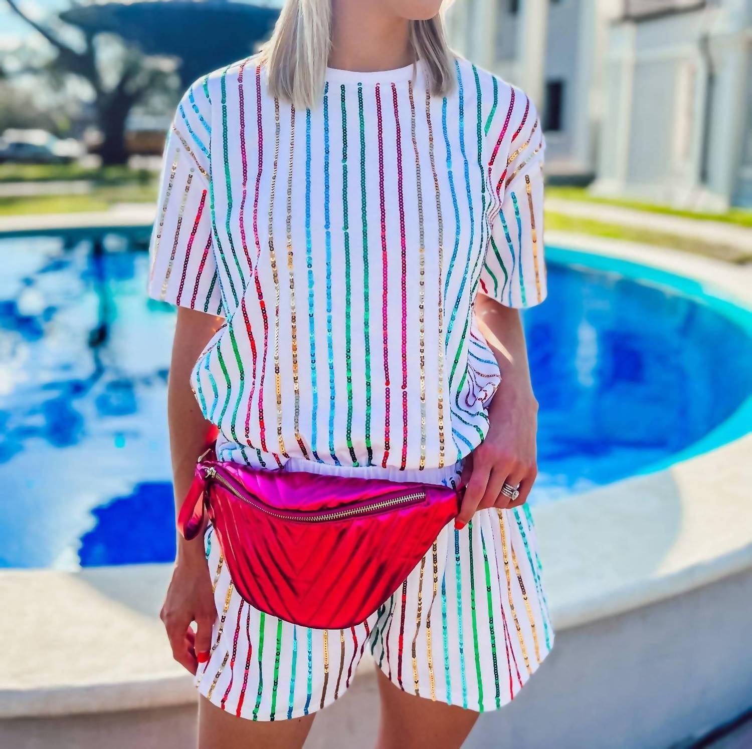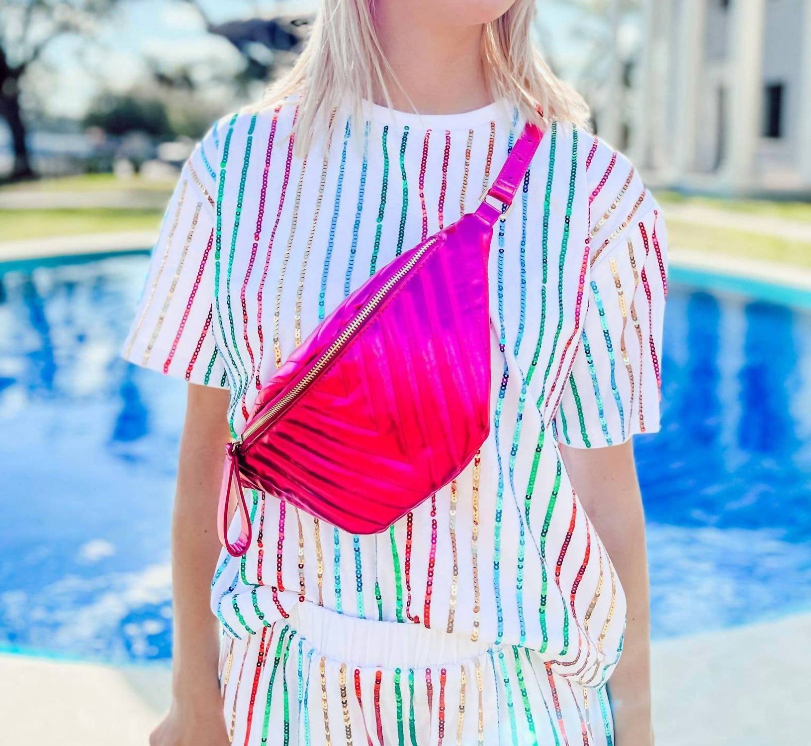 The crossbody bag is a trend that is here to stay and we especially love this style. Introducing the Caroline Hill Charlotte Quilted Sling Belt Bag Fanny Pack in a trendy metallic fuchsia hue. Crafted with luxurious faux fur, this versatile crossbody bag adapts seamlessly from a belt bag to an across-the-body style. It features a convenient zipper closure for the main compartment and an adjustable buckle-style closure for secure wear. Dimensions: 13" wide by 6.75" tall, the perfect size for your travel and errand needs.