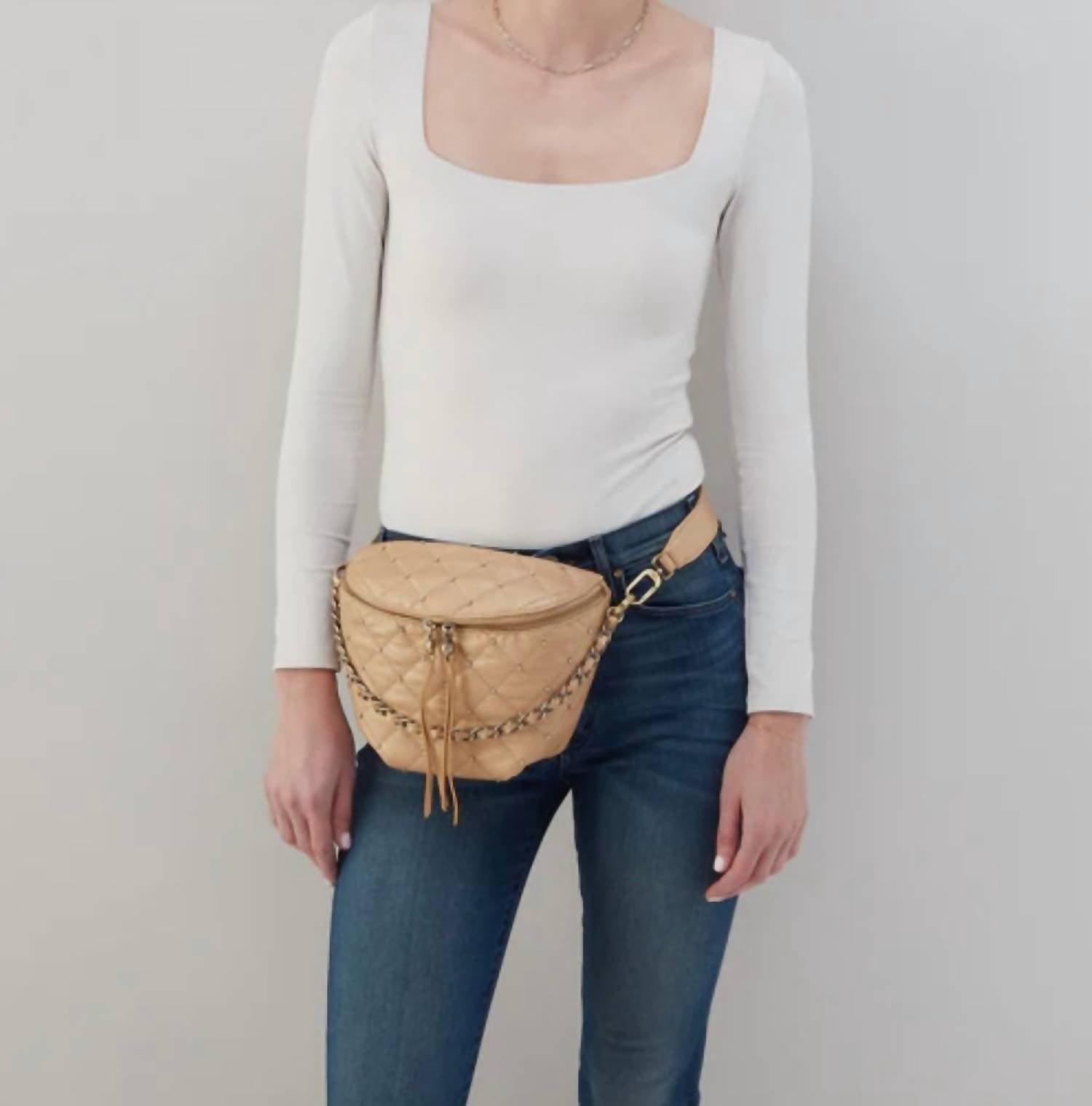 This crossbody bag will be your go-to bag of the season. Meet the Miri Belt Bag by HOBO in Dusty Gold, a versatile accessory crafted from luxurious leather with exquisite chain details. With dimensions of 9" W x 6" H x 2.5" D, this bag offers both style and functionality, featuring a sandlewood-lined interior with organized card slots and a zip pocket. The removable strap allows multiple wearing options, from a belt bag with a 34"–42" strap length to a crossbody with a 15"–20" strap drop. It closes securely with a zip closure and is adorned with Old English Brass hardware. Care instructions recommend using a suede & leather protector, leather spot cleaner, and leather dressing.