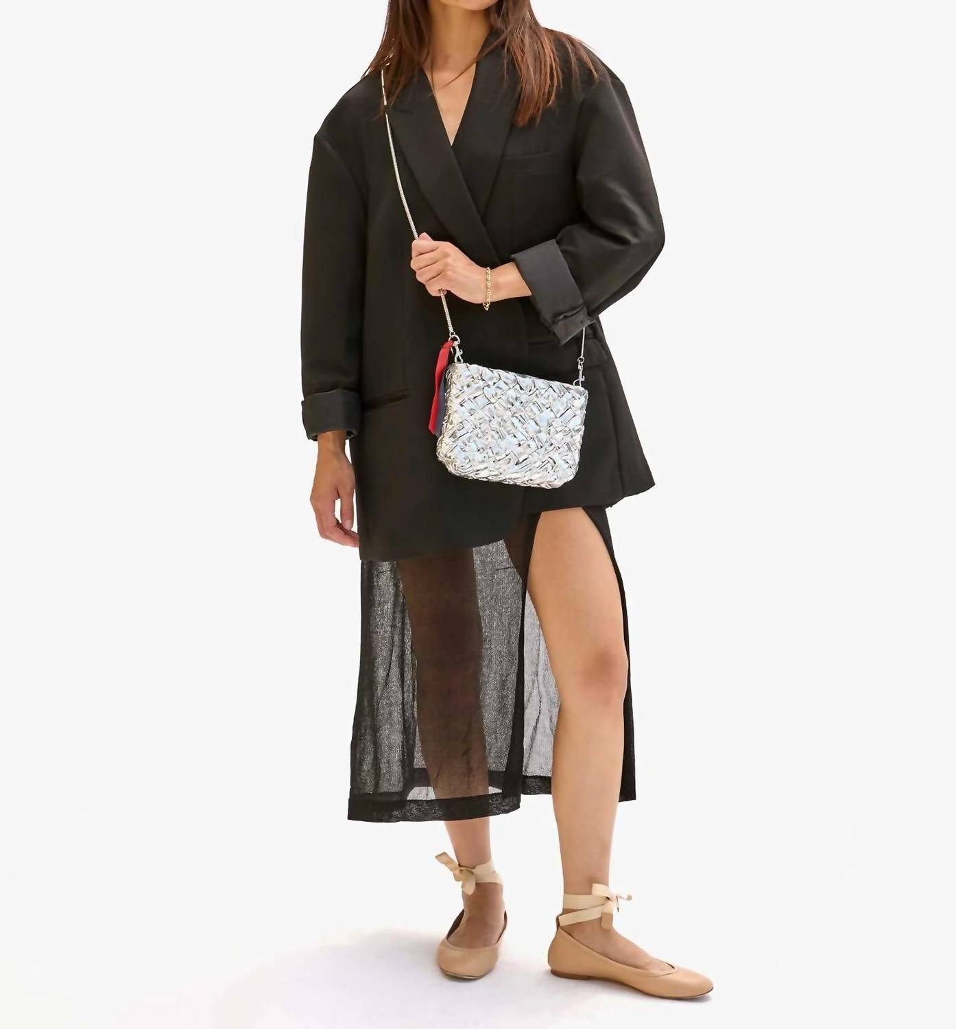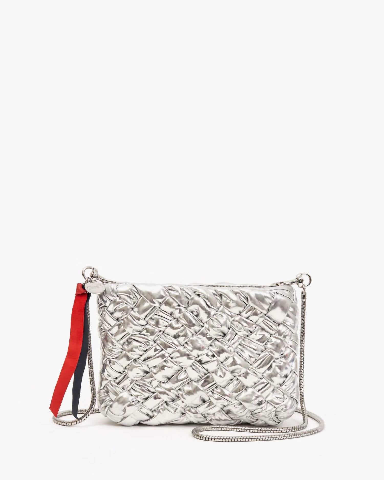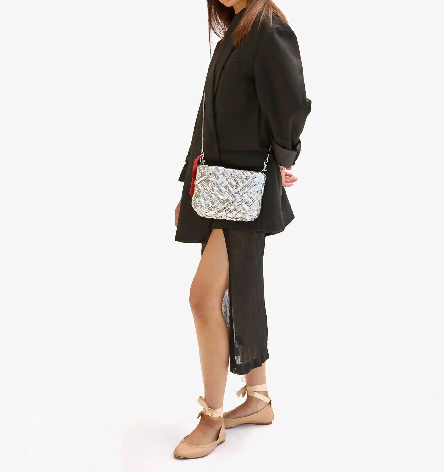 This crossbody bag will be your go-to bag of the season. Add a touch of fun to your ensemble with the Clare V. Women's Estelle Specchio Puffy Woven Bag in a striking silver hue. Crafted from luxurious puffy woven nappa leather, this crossbody bag is designed to carry your essentials like your phone, keys, cards, and lip gloss with style. The practical snap closure ensures your belongings stay secure while you're on the go. Make a statement with this chic and playful accessory.