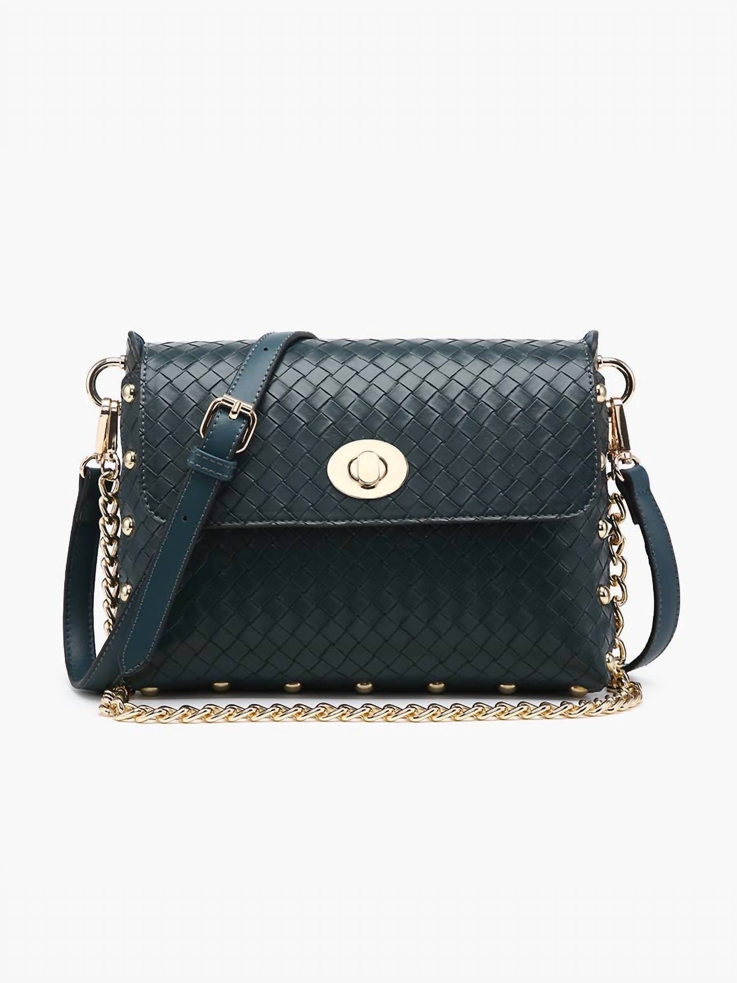 This crossbody bag will be your go-to bag of the season. Introducing the Women's Yazmin Faux Woven Crossbody Bag by Jen & Co. in a sophisticated Dusk Blue. Crafted with a faux woven leather design, this bag features edgy side stud detailing for an added chic touch. Its versatility is unmatched with a removable chain strap and an adjustable/removable crossbody strap, complete with a secure twist lock closure. Perfectly compact with dimensions of 9 inches in length, 7 inches in height, and 3.5 inches in depth, it ensures your essentials are carried in style and organized fashion.