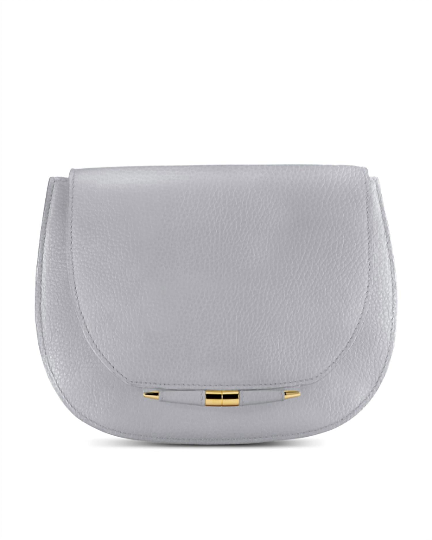 A casual and cute take on everyone's favorite crossbody bag. Experience a modern twist on a classic design with the Women's Jane Saddle Small Crossbody Bag by Tyler Ellis. This elegant grey leather bag features a sophisticated Infinity Bar with a concealed magnetic snap closure. Measuring 8.7 inches in width, 7 inches in height, and 3 inches in depth, it is designed for both style and functionality. Enhance versatility with a detachable chain strap that allows for cross-body or shoulder wear, lined with signature Thayer Blue for a touch of luxury.