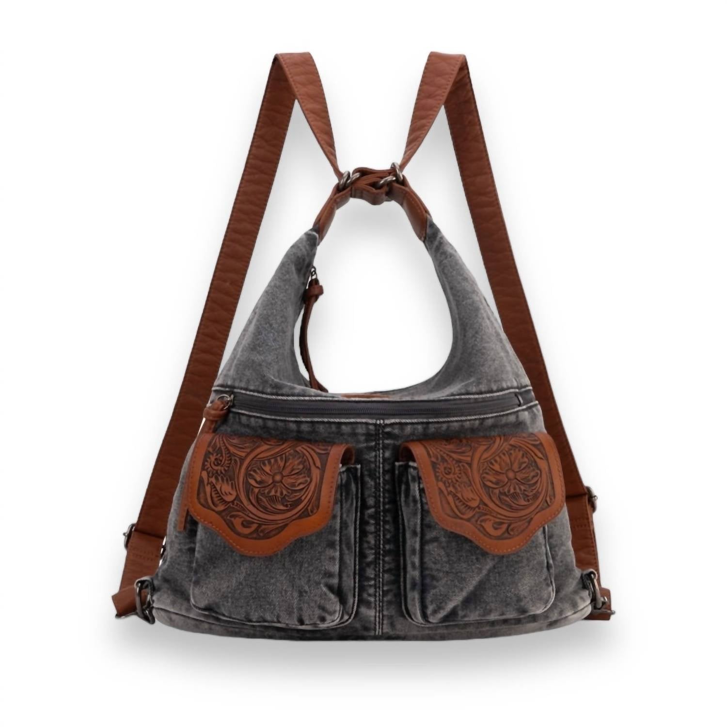 A casual and cute take on everyone's favorite crossbody bag. Embrace versatility with the Women's Crossbody Bag by Wrangler, designed to suit any occasion with convertible straps for multiple carrying options. This stylish blue bag is crafted from denim jean and PU leather, with floral tooling on the flap and a magnetic button closure. Featuring multiple pockets, including front and back zippered options, and a secure top zipper closure, it provides ample storage for your essentials. Measuring 15" x 5" x 13" with a 16" drop, this bag includes an adjustable strap for comfortable wear.