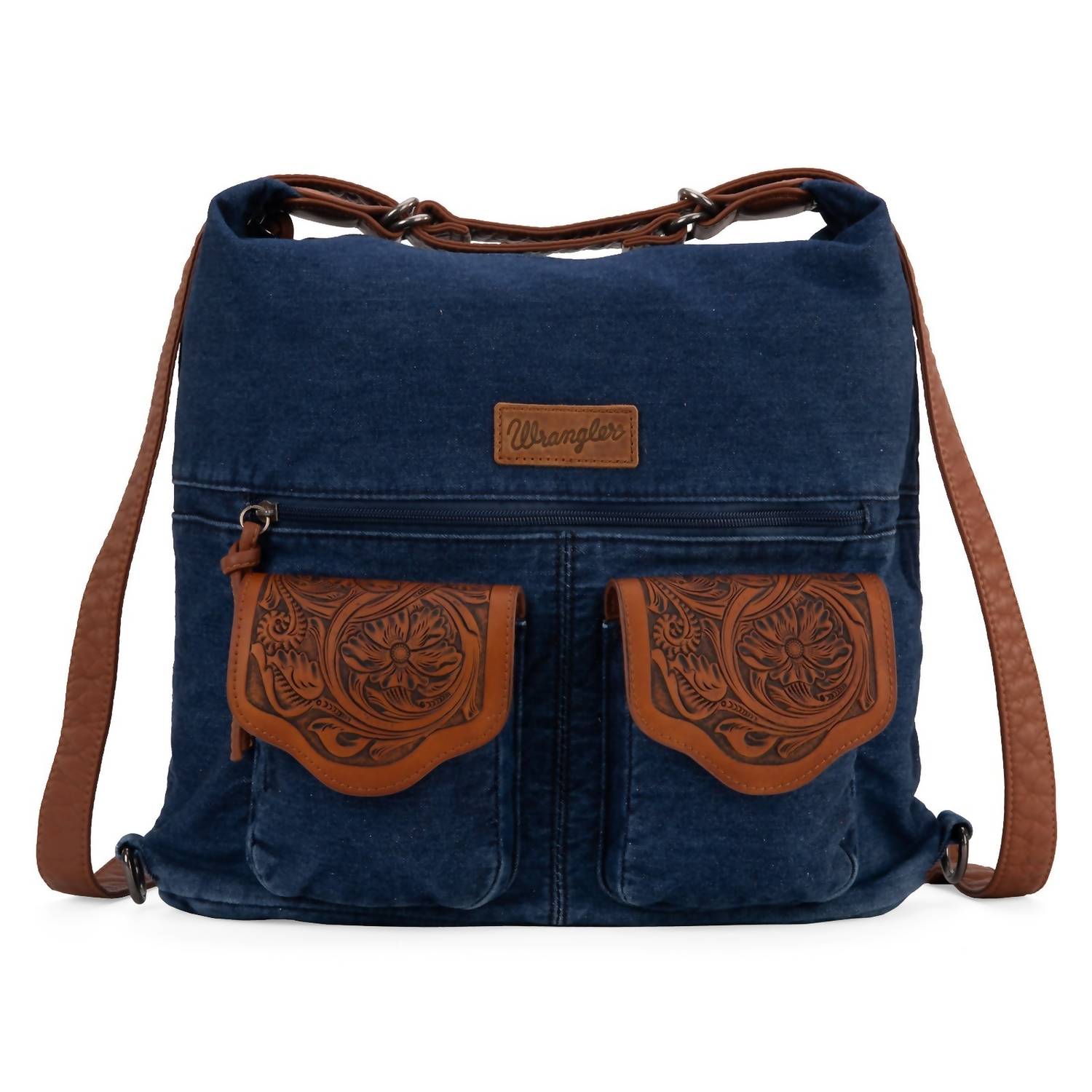 A casual and cute take on everyone's favorite crossbody bag. Embrace versatility with the Women's Crossbody Bag by Wrangler, designed to suit any occasion with convertible straps for multiple carrying options. This stylish blue bag is crafted from denim jean and PU leather, with floral tooling on the flap and a magnetic button closure. Featuring multiple pockets, including front and back zippered options, and a secure top zipper closure, it provides ample storage for your essentials. Measuring 15" x 5" x 13" with a 16" drop, this bag includes an adjustable strap for comfortable wear.