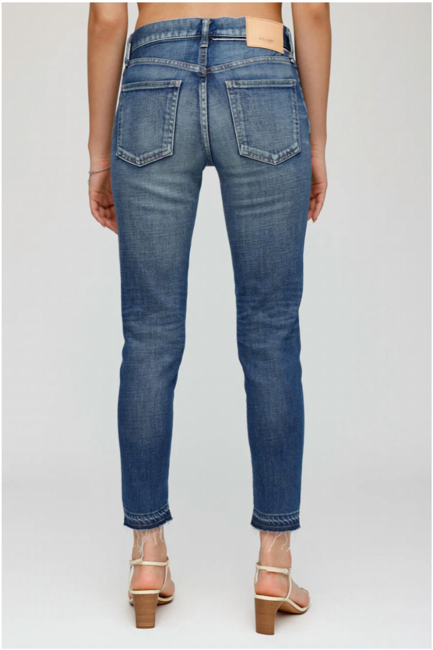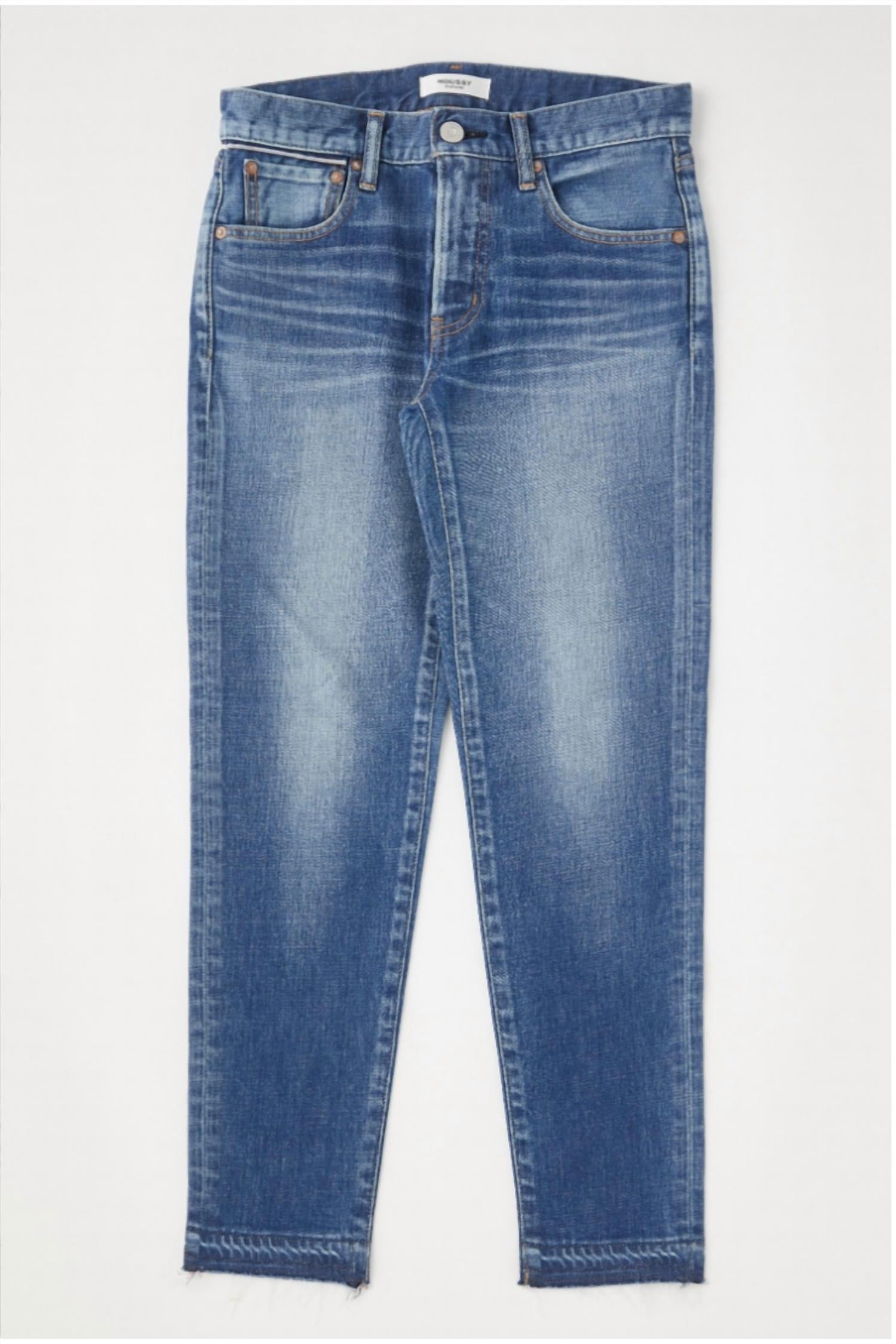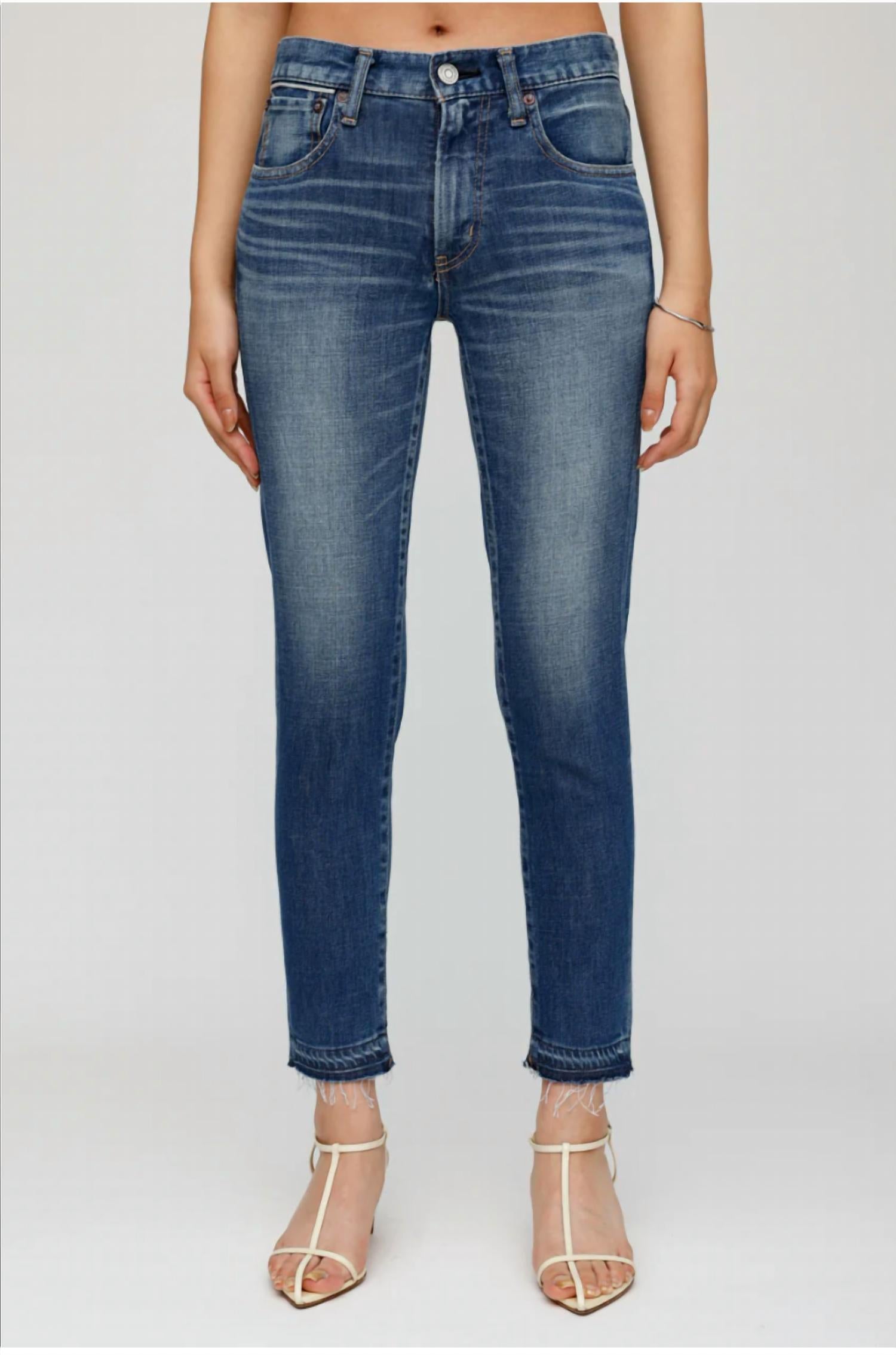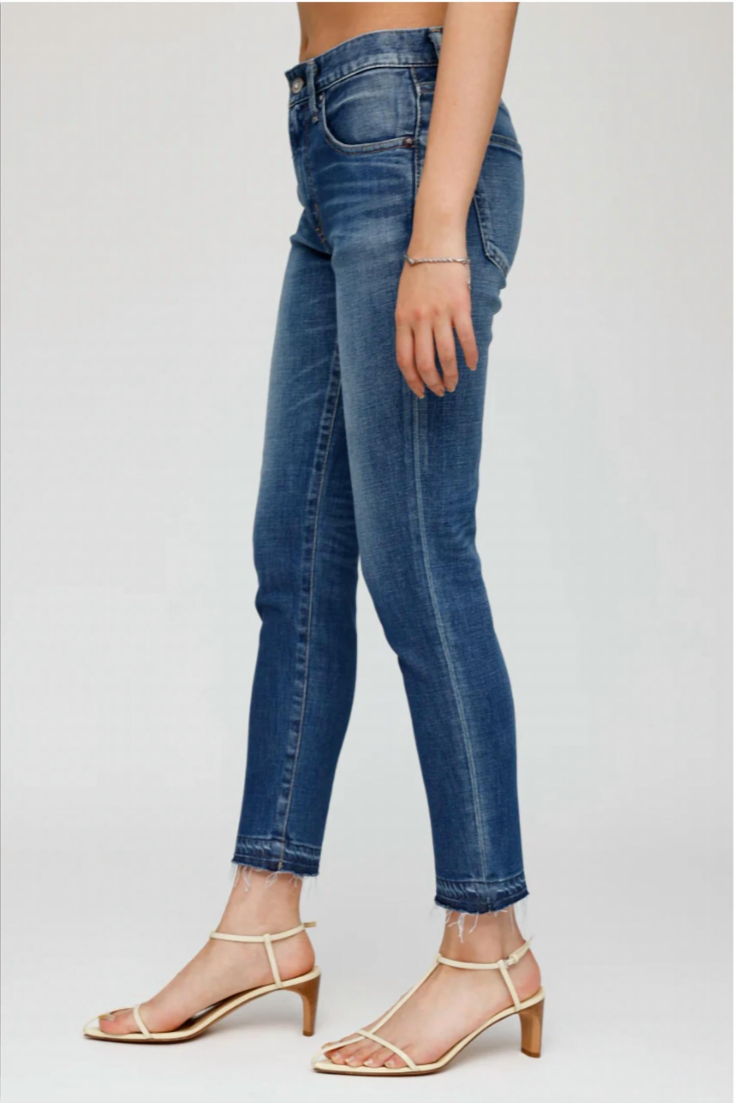 Everyone needs a good pair of skinny jeans and this is a style you'll keep reaching for no matter the season. Elevate your denim collection with the Clarence Skinny Jean by Moussy, designed in a textured blue finish with fading details. Crafted for a slim fit, these jeans feature a high-rise waist and a skinny leg style with an undone hem for a modern touch. Composed of 95% cotton, 4% polyester, and 1% spandex with a cowhide leather label, these jeans are imported from Japan and include convenient pockets. Closure: Button closure. Care: Machine wash. Model is 170 cm/5'6" and wearing size 26.