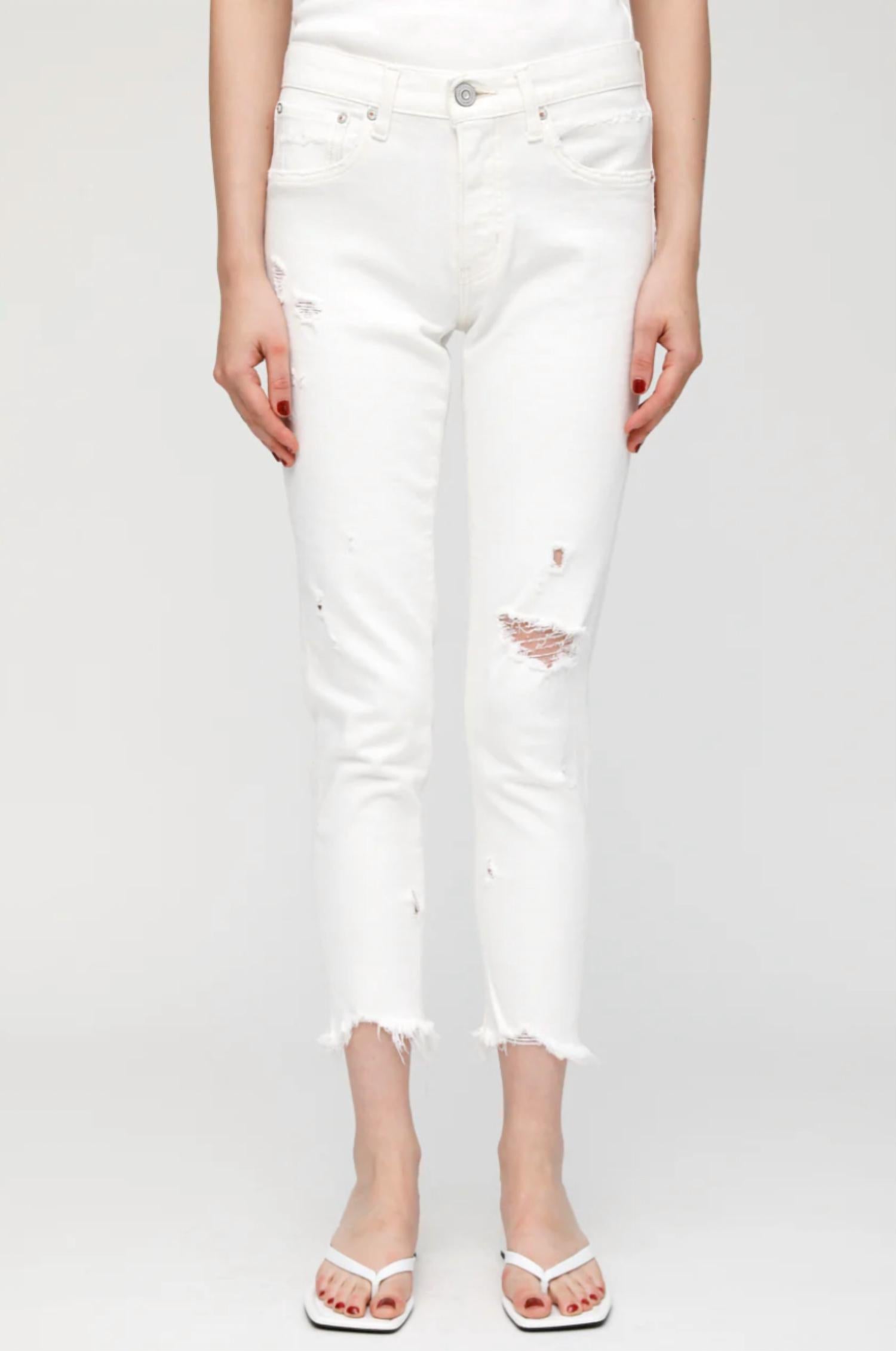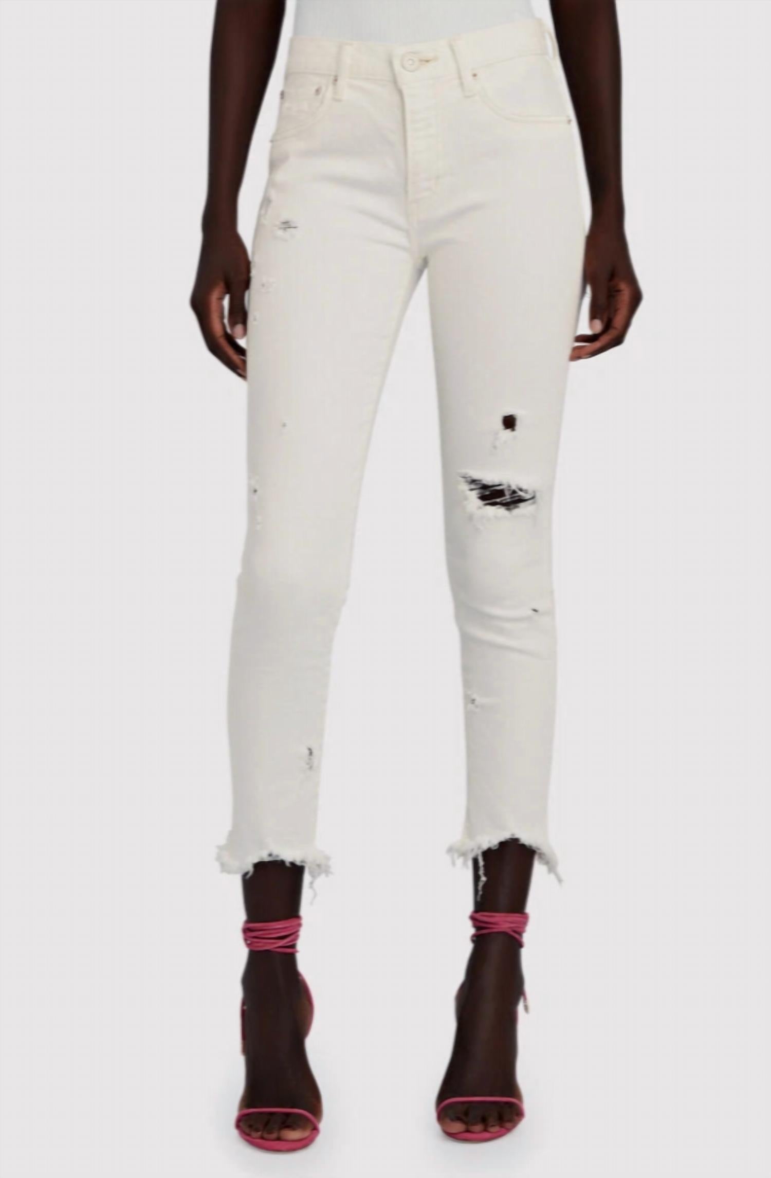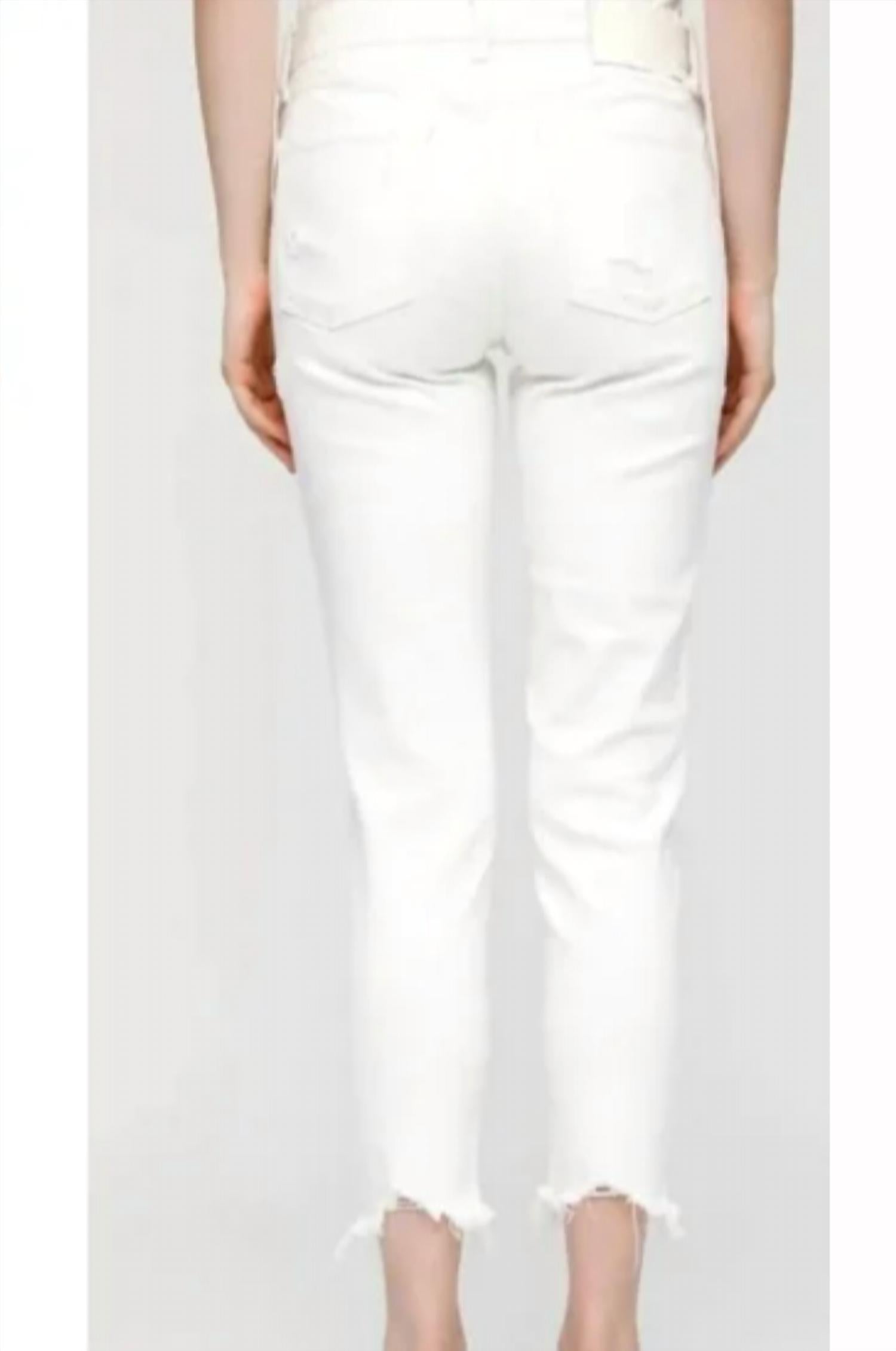 A skinny jean that is both flatering and comfortable. We love this style because it works great with boots, or without! Presenting the Glendele Skinny Jean by Moussy, a stylish choice for a fitted look in a chic white hue. Featuring a mid-rise waist, raw hem, and ripped knee detailing, these jeans are crafted from lightweight denim with a composition of 95% Cotton, 4% Polyester, and 1% Spandex. Originating from Japan, they are designed with a zipper fly closure and enhanced with cowhide leather accents. Care is simple with machine wash cold on a delicate cycle; avoid bleaching, tumble drying, and dry cleaning, while ironing with a press cloth on a cool setting.