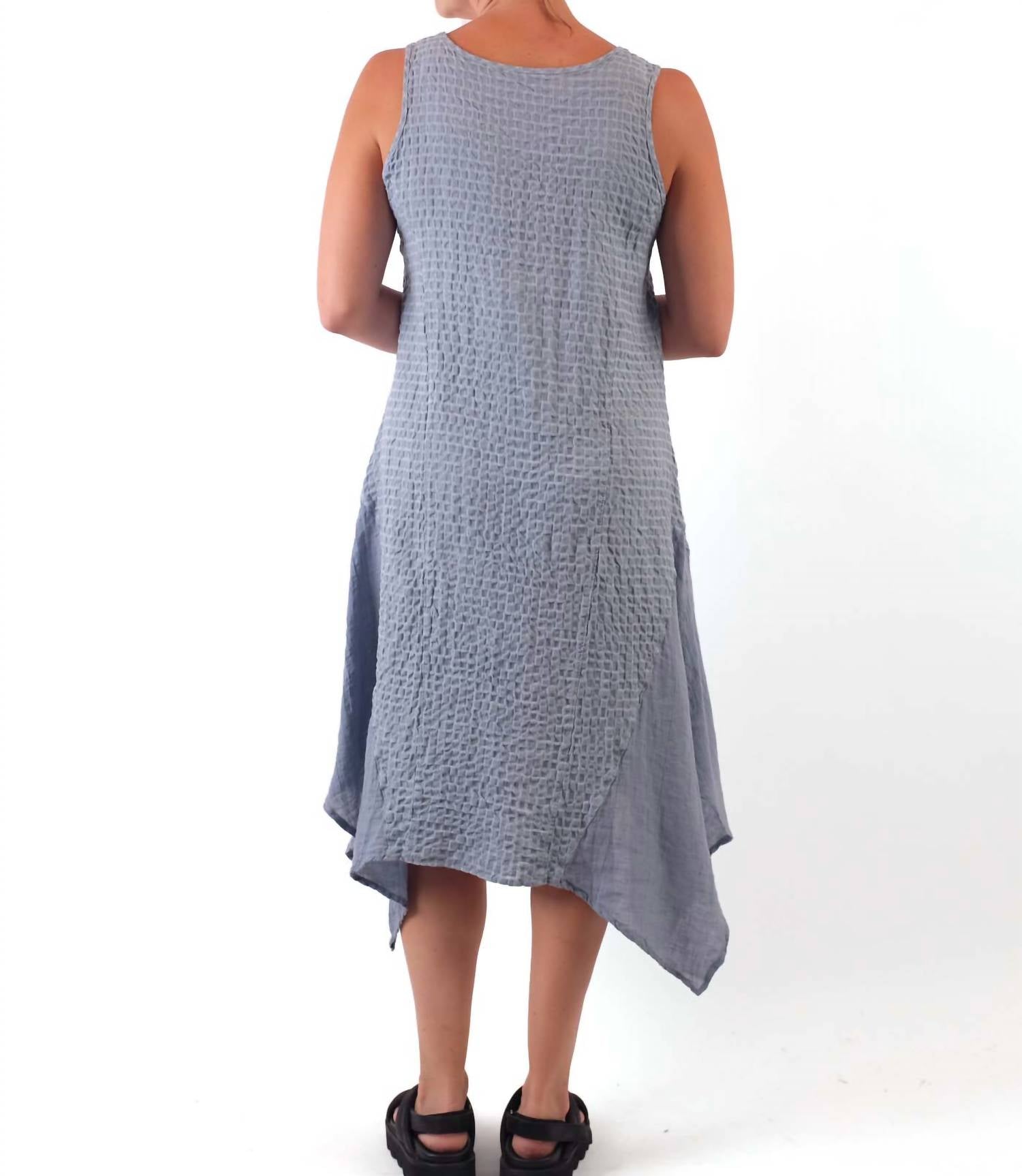 A dress you'll be reaching for season after season. Pair it with your favorite denim jacket for a more laid-back look. Elevate your wardrobe with the Seersucker Dress by Luna Luz in an alluring Blue Haze. This sleeveless, asymmetrical A-line dress showcases a modern scoopneck and a textured linen blend for a chic yet comfortable fit. It's crafted for easy wear with a pull-on design and offers the convenience of machine wash care. Enjoy precise sizes with XS featuring a bust of 36" and length of 39.5", ranging to an XL bust of 45" with a length of 42".