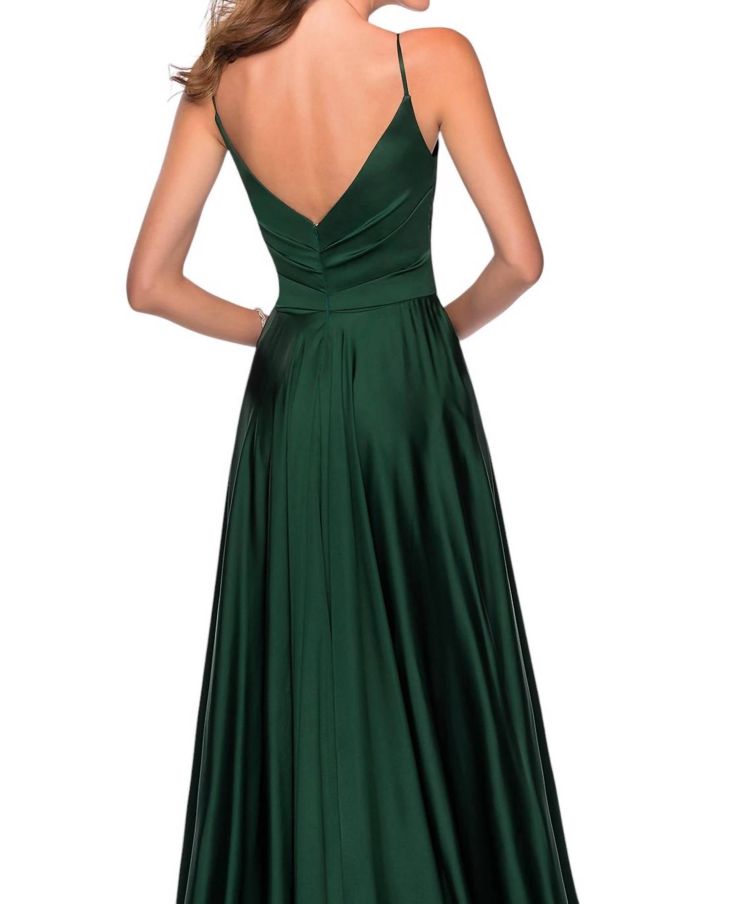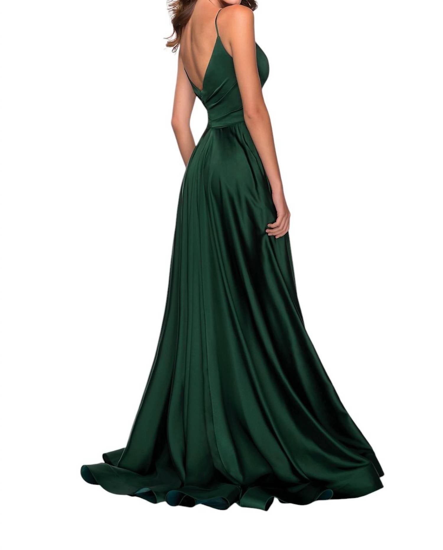Elevate your prom look with the V-Neck Long A-Line Prom Dress by La Femme, a stunning ensemble designed for those special occasions. This emerald satin gown features elegant spaghetti straps and a captivating deep V neckline, complemented by a high slit for a dramatic flair. Its silhouette is classic A-line, offering a flattering fit with the convenience of a zip closure at the back. Care for this gorgeous piece by dry cleaning it to maintain its luxurious feel.