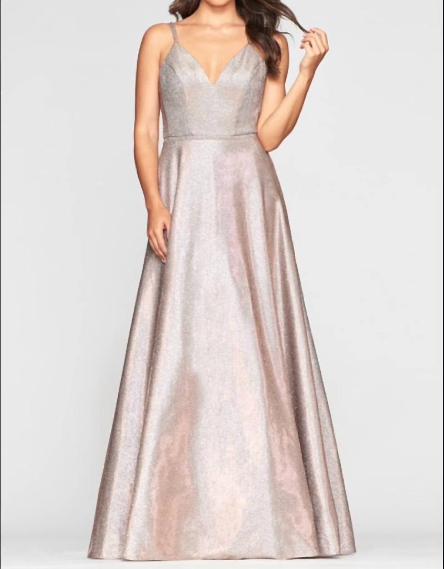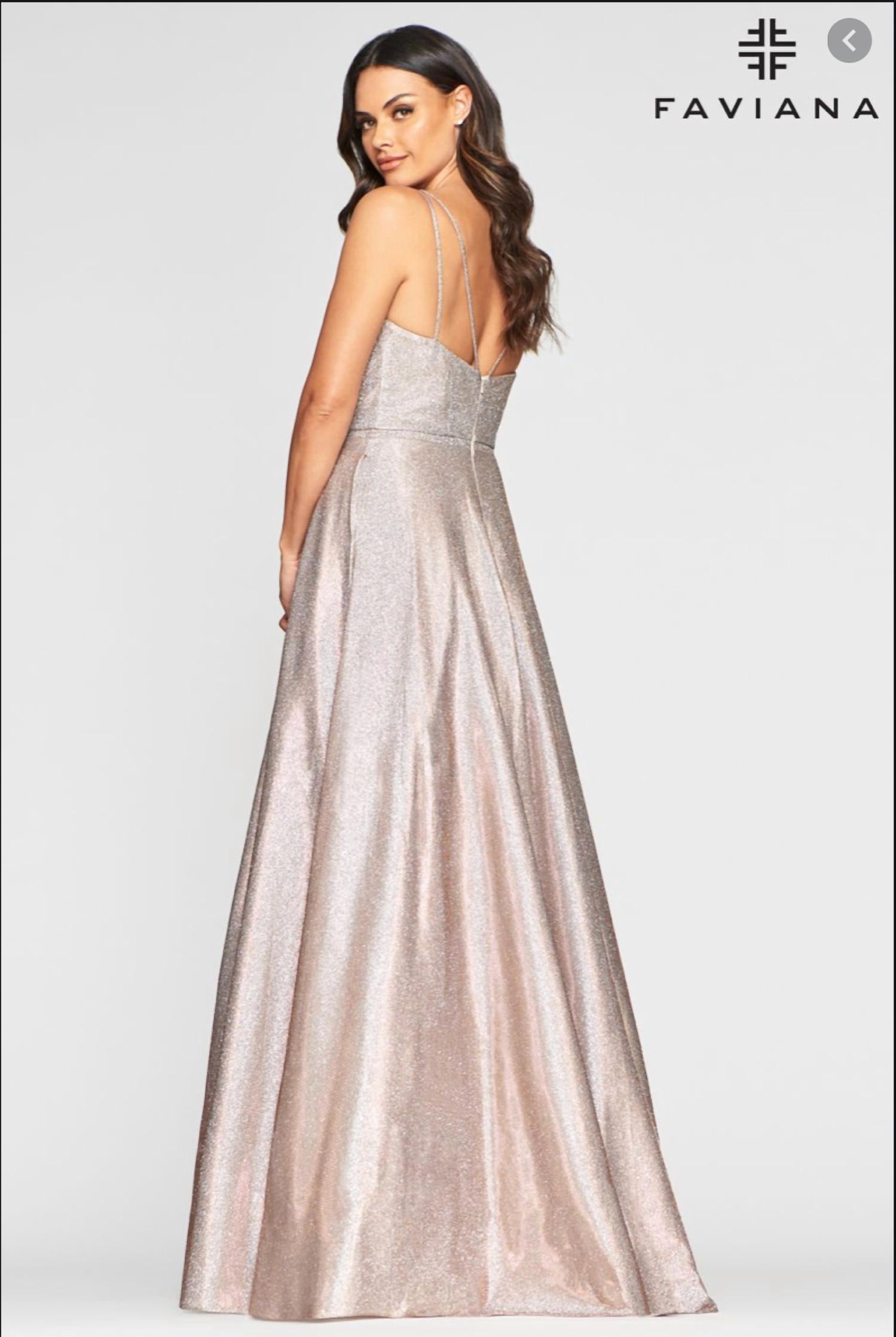 Turn heads in the cutest and most flattering evening dress. Shimmer the night away in Faviana Style S10424. This sparkly favorite is a metallic v-neck dress with double shoulder straps and a full skirt with pockets. Wear this eye catching dress to your next event and stun the crowd! Back zipper closure.