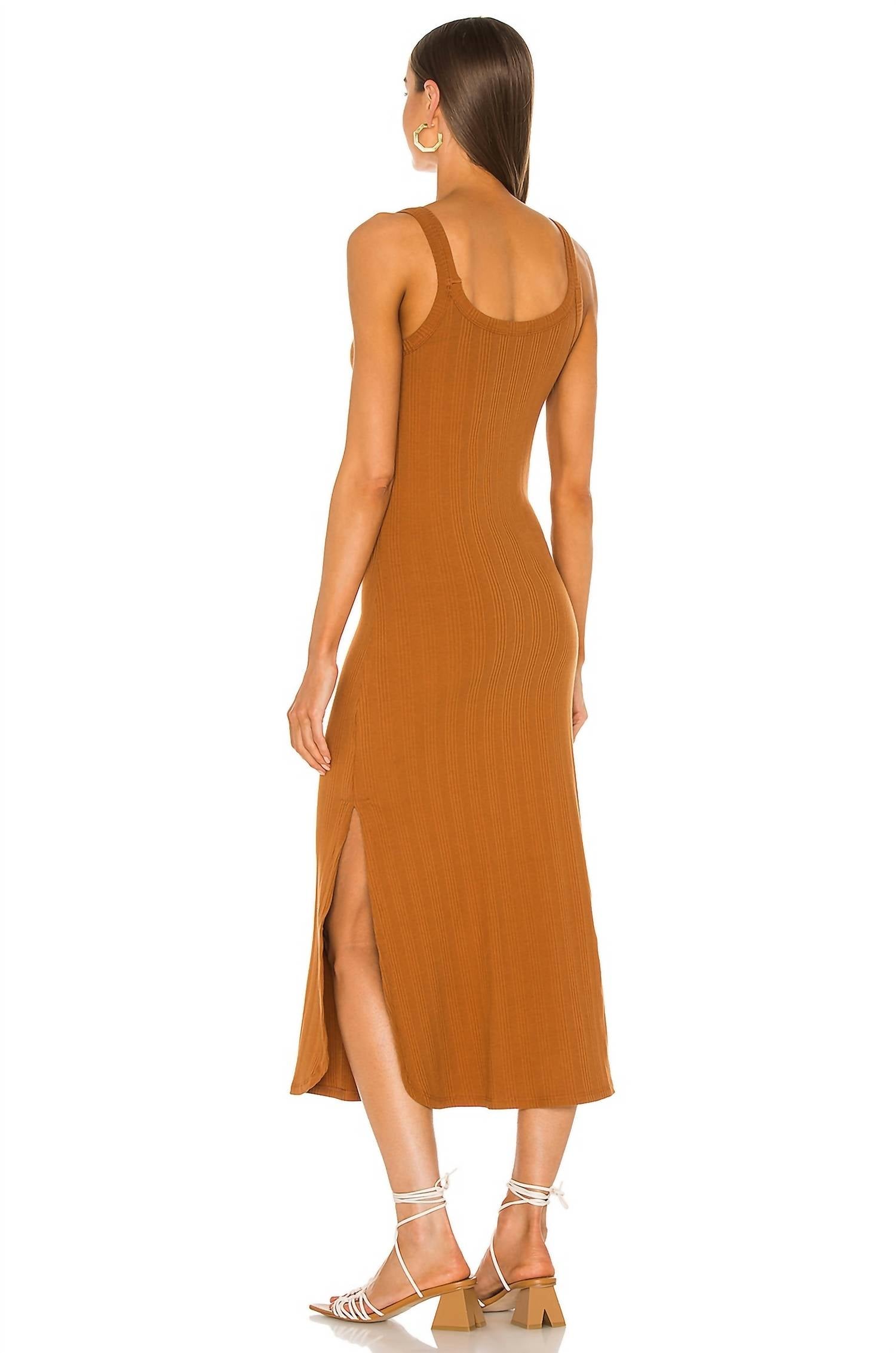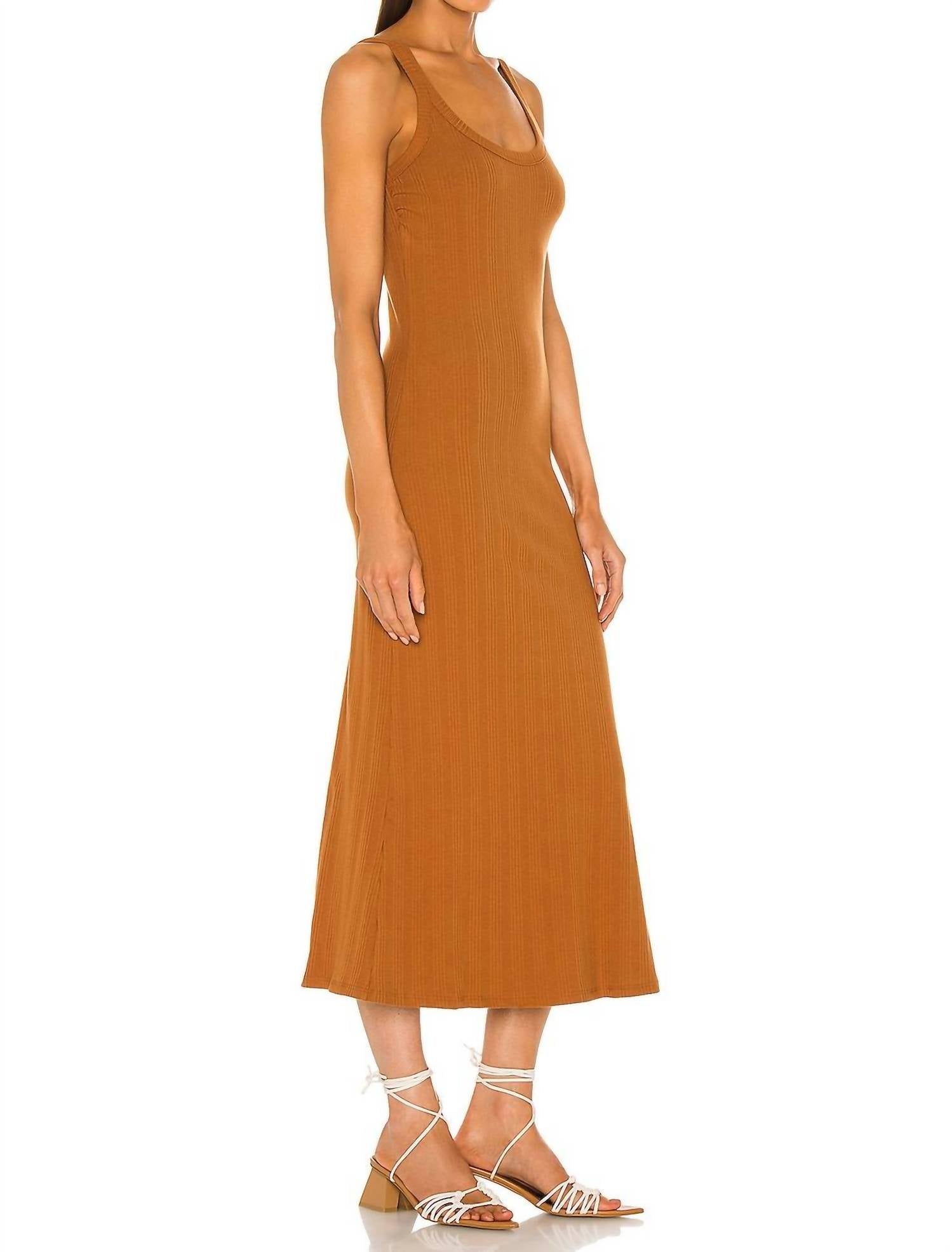 Style this maxi with your favorite statement necklace and sandals for the perfect look. The West Dress by Vitamin A is an eco-friendly choice, crafted with 66% tencel, 26% recycled cotton, 8% lycra. Made in the USA, this sleeveless, scoopneck maxi dress embodies effortless style with a ribbed texture and side seam slit, designed to flatter with a fit and flare silhouette. Its pull-on closure ensures comfort and ease, while maintaining an environmentally conscious approach. Caring for this piece is simple with a cold hand wash, and with a length of approximately 48.8 inches from shoulder to hem.