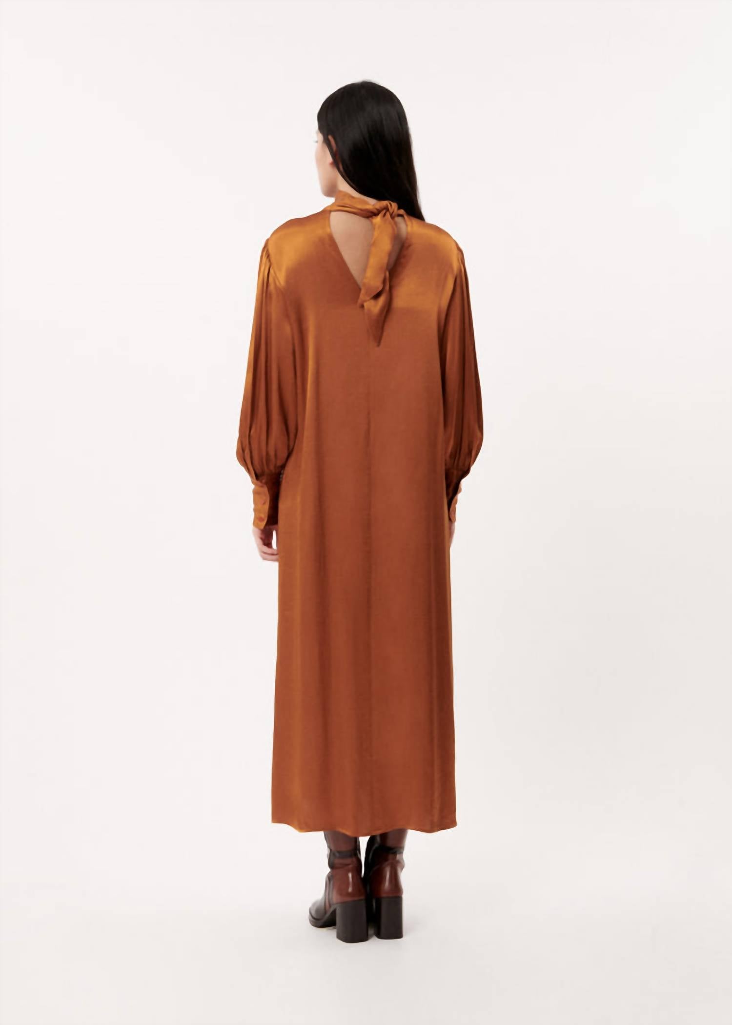 Paris Noir Golden Silk Long dress Dress features a Round collar. Long sleeves and balloons. Abegail is 1m72 tall and wears a size S. The dress has a side length of 129.5 cm, a shoulder width of 10 cm and a chest measurement of 49 cm. Sleeve length is 63.5cm. 100% Viscose. MADE IN CHINA