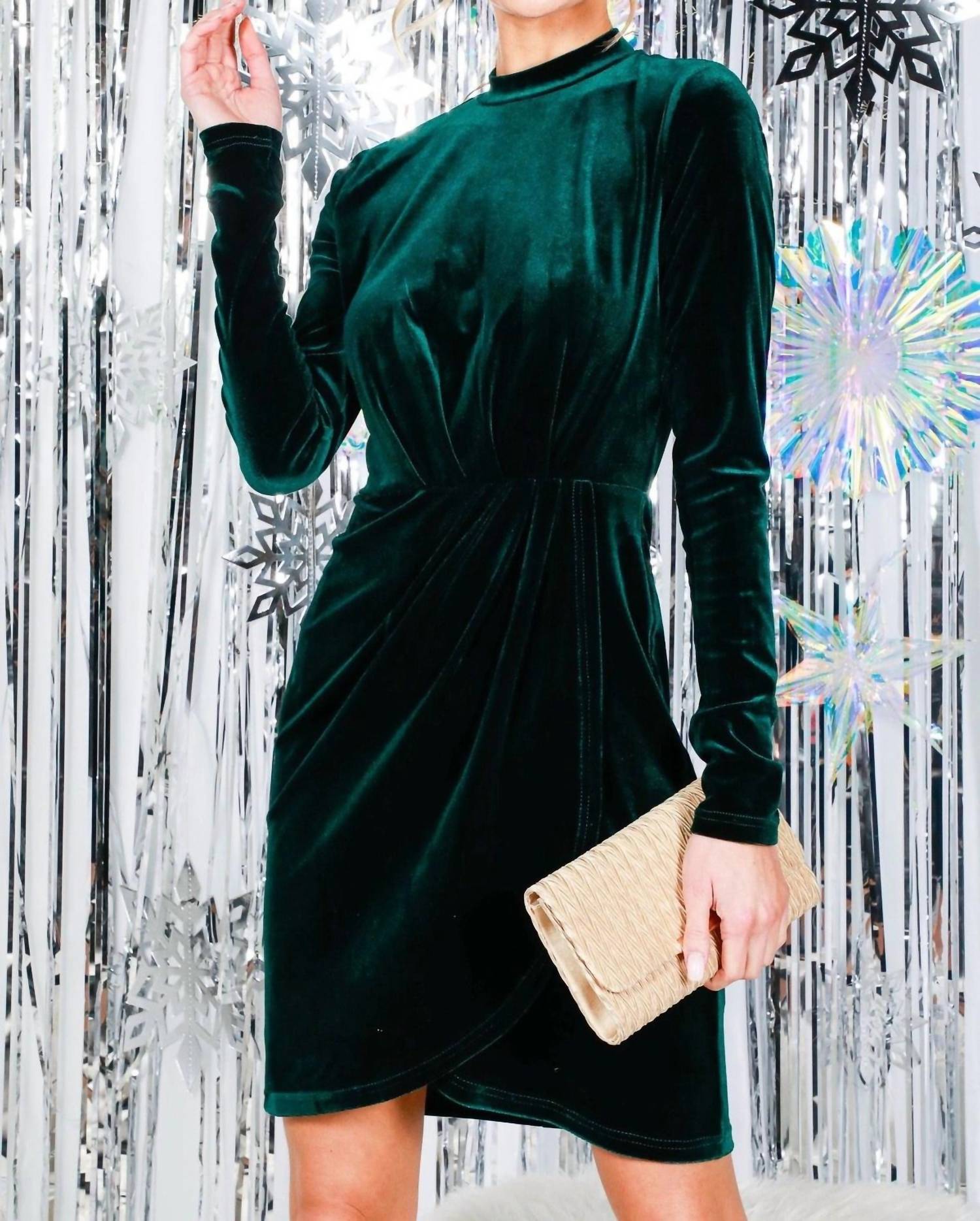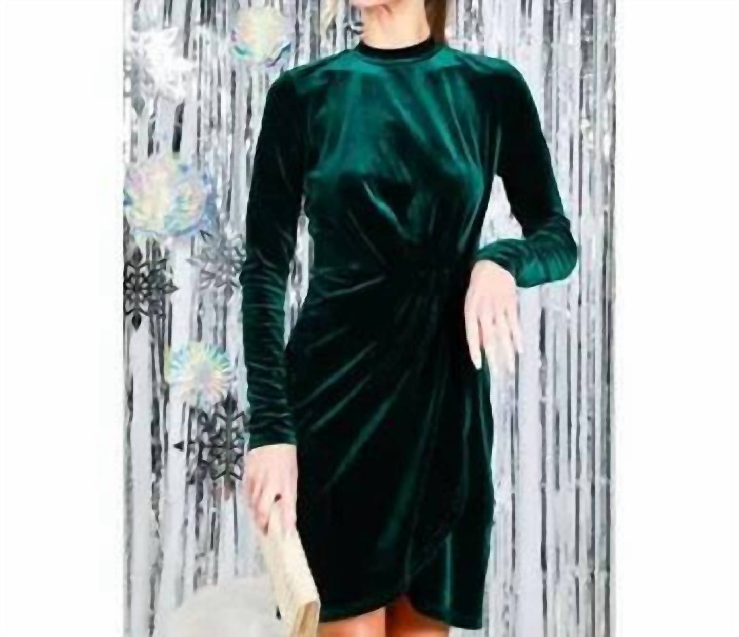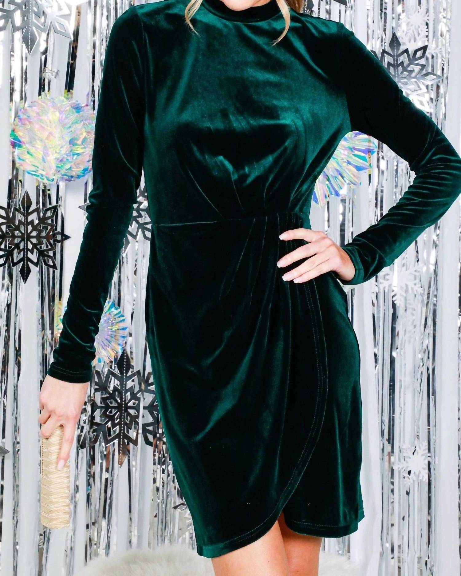 A flattering yet comfortable dress you'll be reaching for season after season. The Bodycon Faux Wrap Dress by Vine & Love in hunter green is an exquisite choice for elevating your holiday wardrobe. This dress features a mock neck and long sleeves that beautifully offset its mini length, making it ideal for a range of occasions. Composed of a velvet material, it provides a rich texture and comfort, with a pull-on closure for easy wear. The sheath silhouette highlights your curves, while the bust measurements range from small 34", medium 36", to large 38", and length from small 36", medium 37", to large 38".