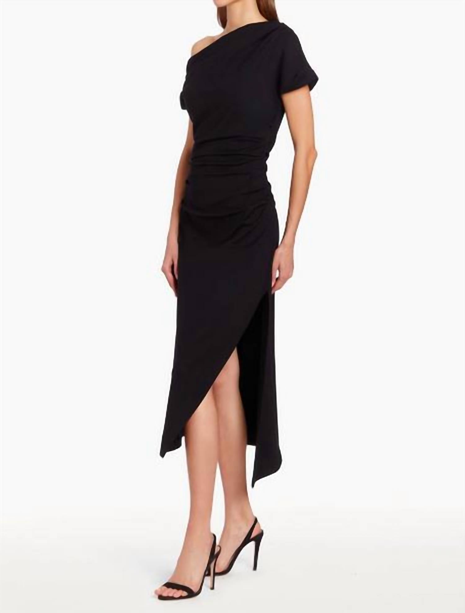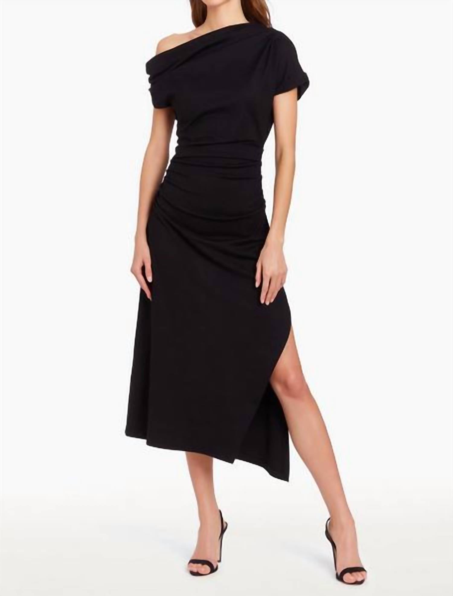 A midi dress so versatile, your options for wearing it are endless. Chic sporty midi dress in solid black. Features short sleeves and an off-the-shoulder neckline with a stylish side slit and side gathers for added flair. Crafted from a blend of 60% rayon, 33% nylon, and 7% spandex. Offers a comfortable fit. Made in US. Features a convenient pull-on closure. Easy care with machine wash instructions.
