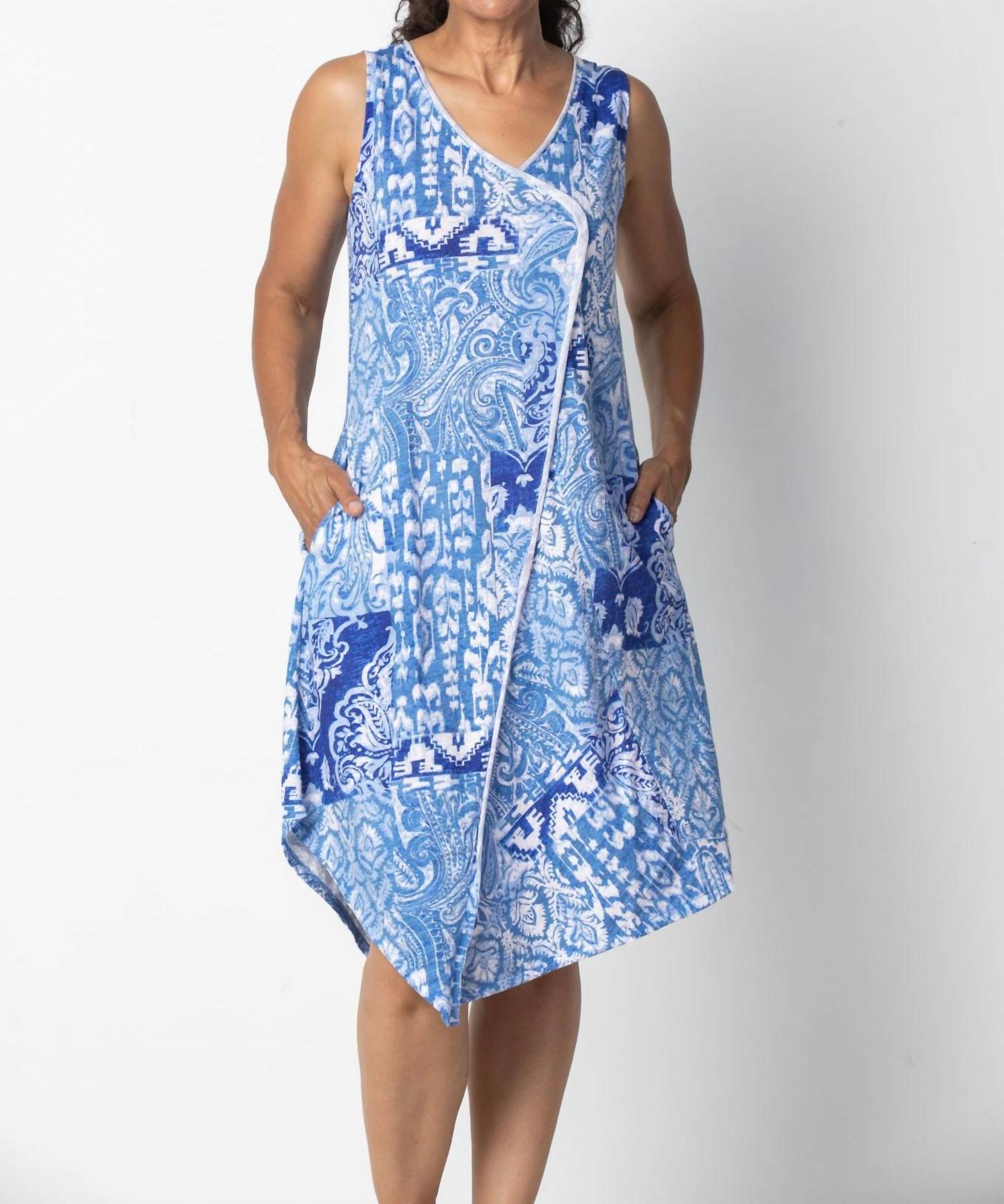 A dress you'll be reaching for season after season. Pair it with your favorite denim jacket for a more laid-back look. Great sleeveless cotton tank dress with sharkbite hem. Beautiful blue print.