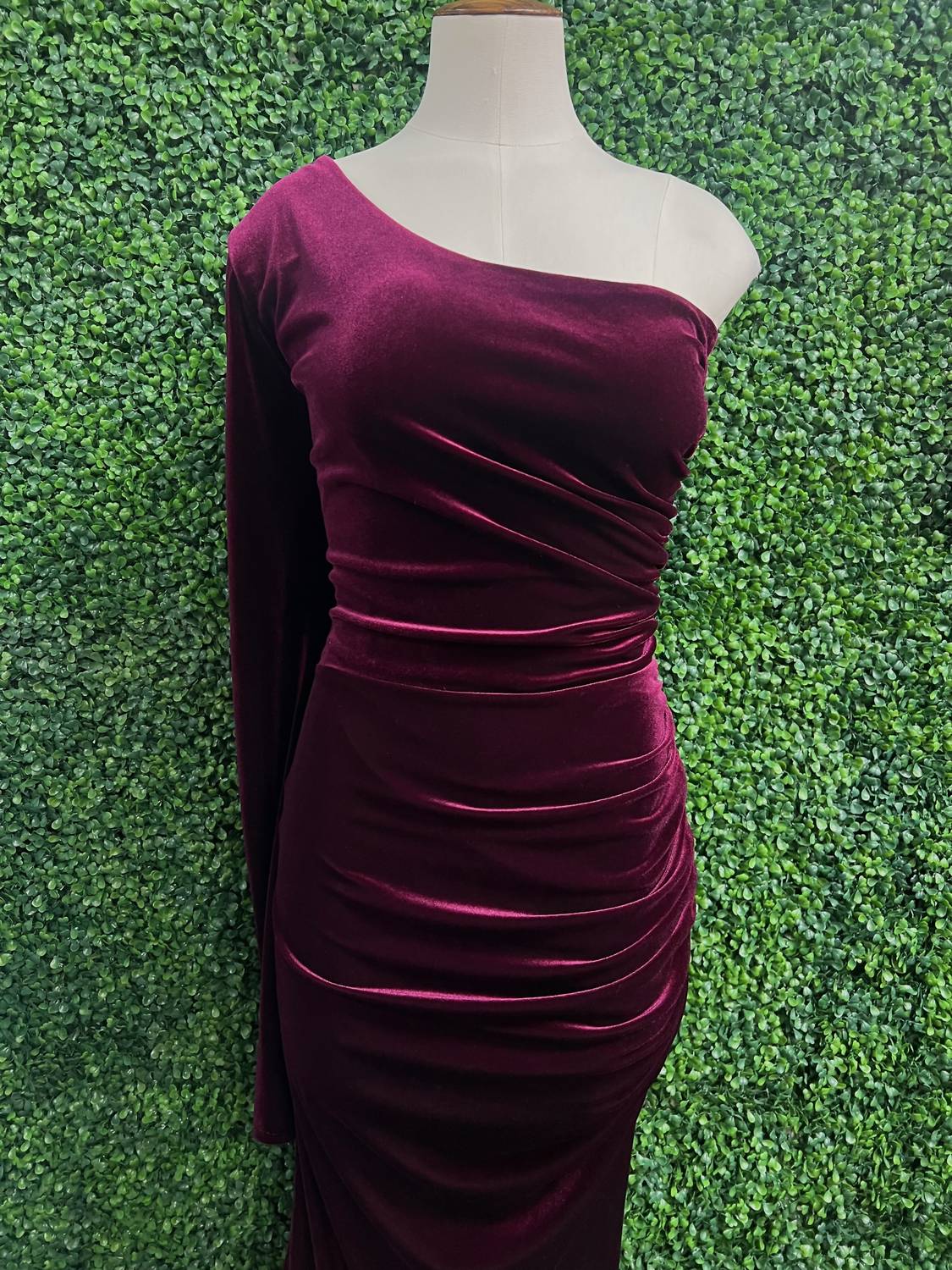 Show just the right amount of skin in this one-shoulder dress. Meet the Jessica Angel Side Slit One Sleeve Dress, a stunning choice for any formal event. This luxurious bodycon dress comes in a rich burgundy hue, featuring a one-shoulder neckline and long sleeve design. Made with soft velvet, it showcases elegant ruching and a striking cutaway side slit. Closure: Side zipper.