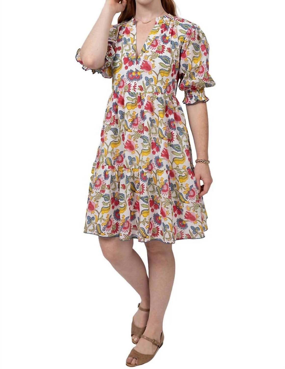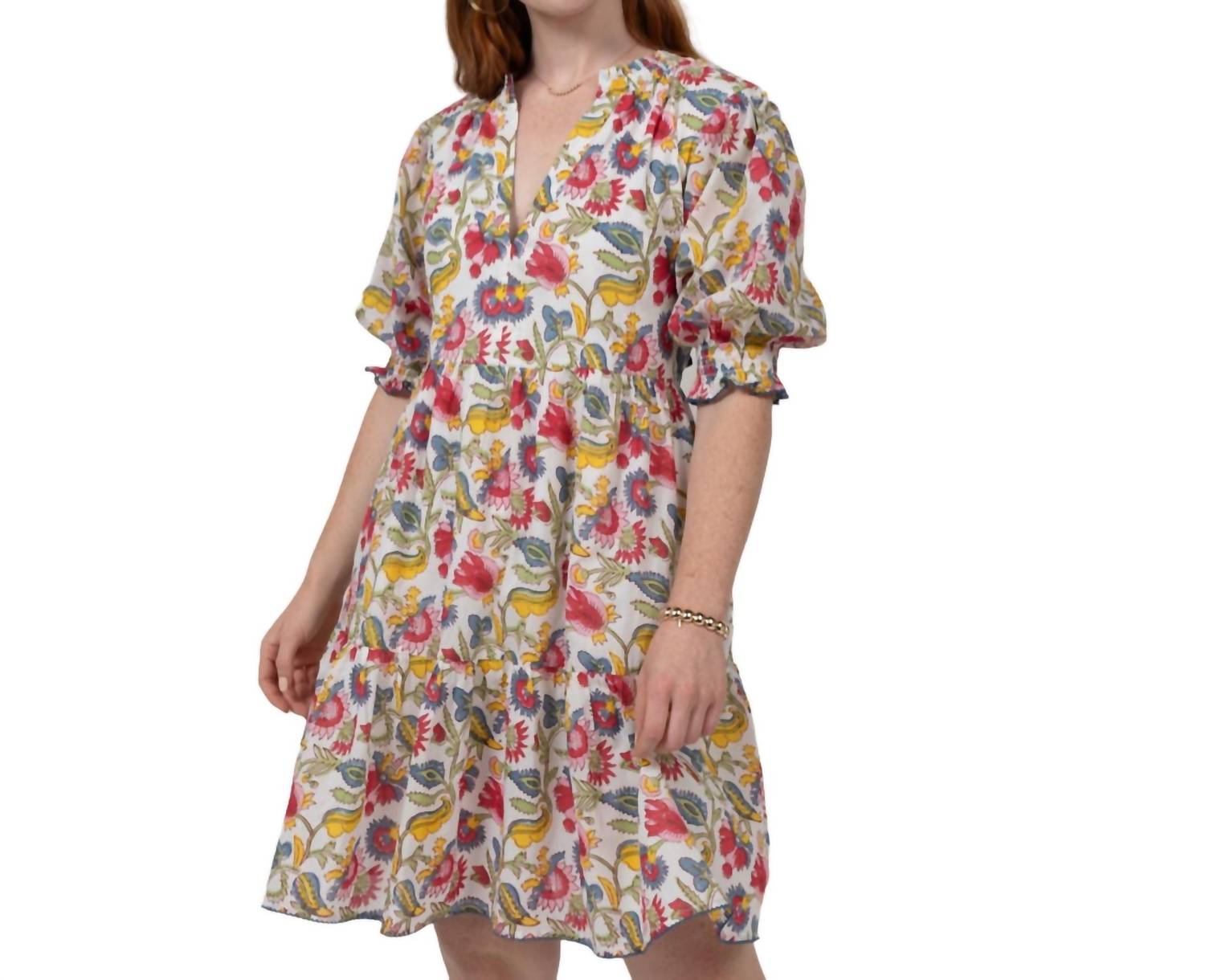 The kind of easy and flattering dress you'll be reaching for all season long. This mini dress features an intricate paisley print and a flattering silhouette crafted from luxurious 100% cotton. It has a relaxed fit and includes a smocked V-neckline, inseam pockets, half sleeves with elasticized trim, and a tiered construction. The dress is fully lined and designed in a pullover style.