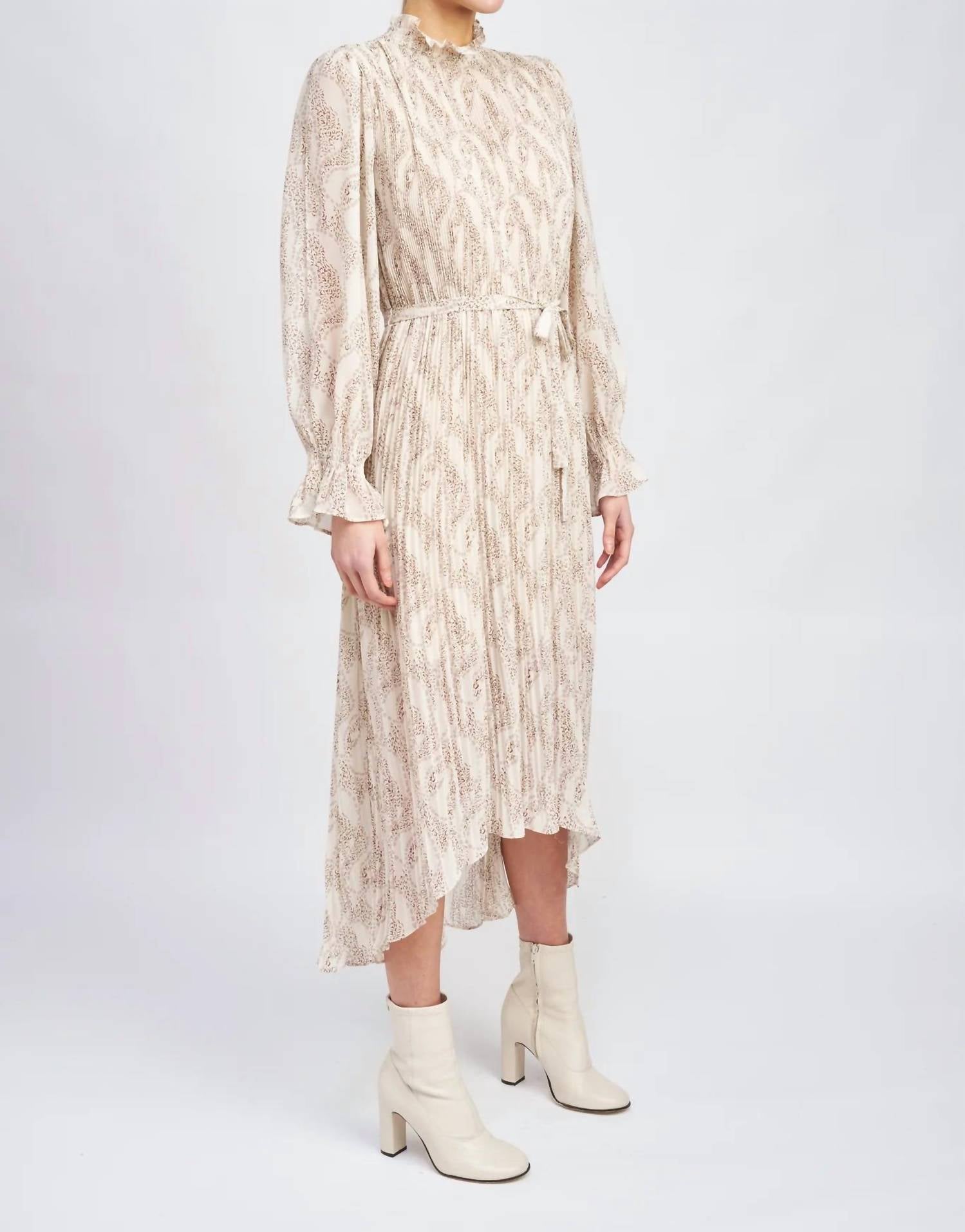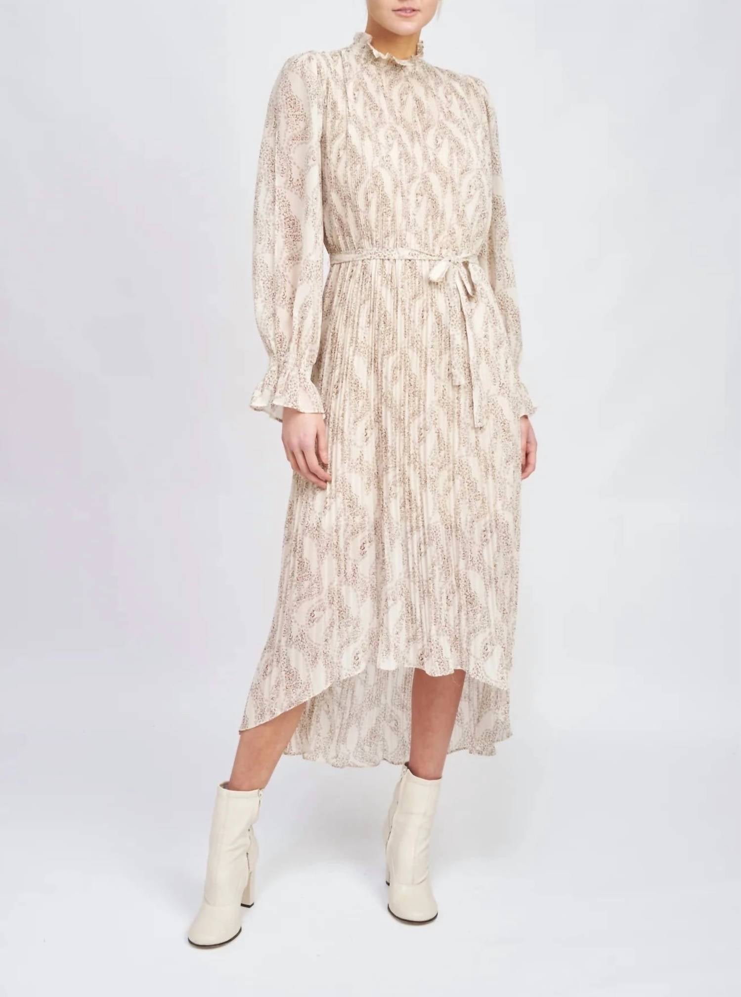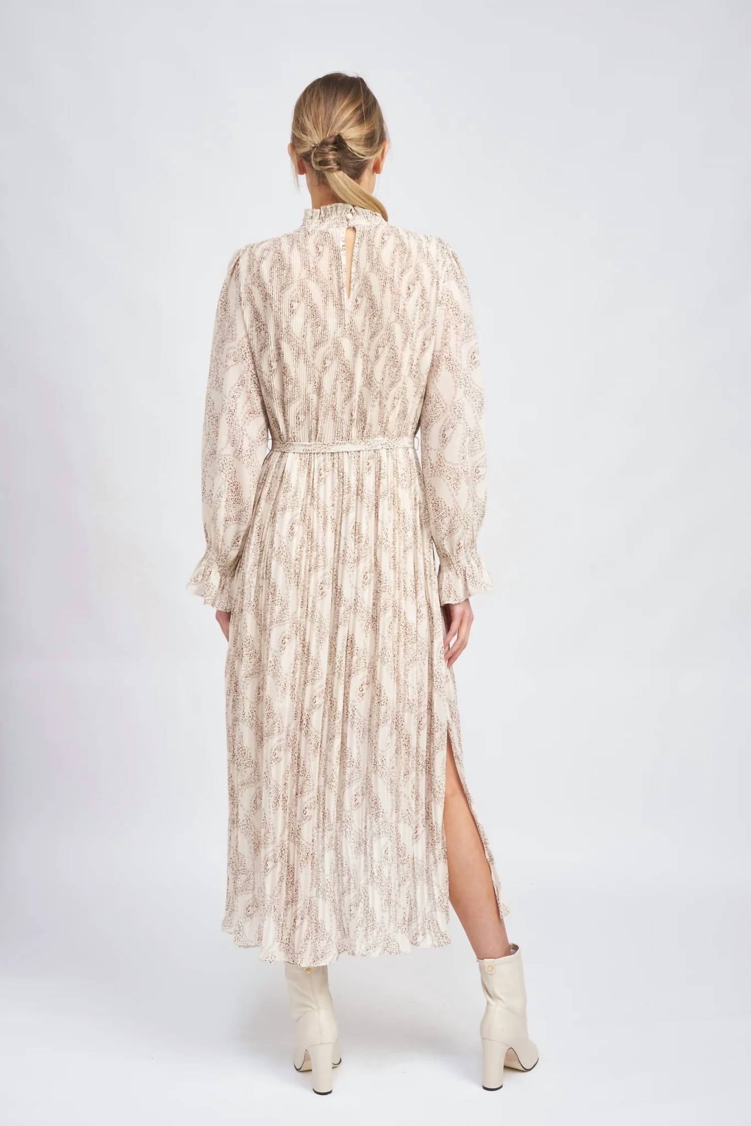 The pefect high-low dress for those transitional seasons. The Ever Pleated Dress by En Saison is a romantic, oat-colored midi dress perfect for any special occasion. This elegant piece features delicate elbow-length sleeves and a mockneck, with a thoughtful tie waist that accentuates its A-line silhouette. Crafted from 100% polyester, both the dress and lining speak to the sophistication of pleated chiffon, and it includes a slip for a complete look. Closure: Button closure. Care instructions recommend hand washing for longevity. Model is 5'9" and wears a size small.
