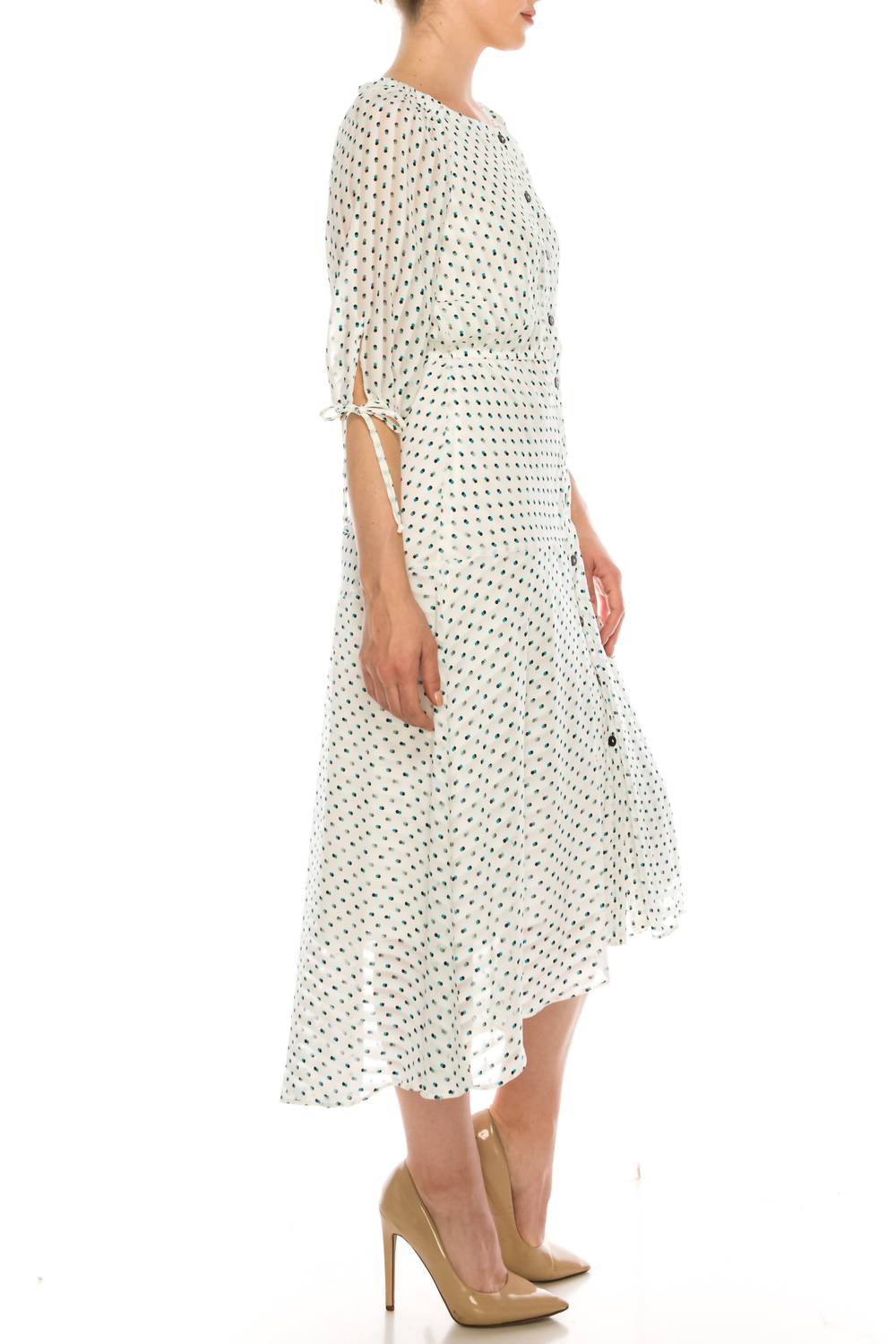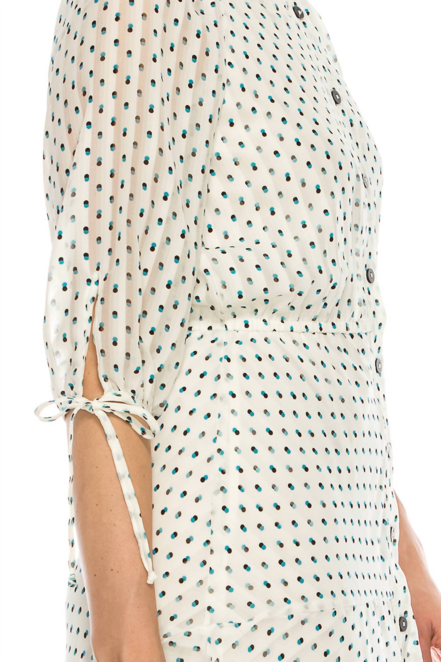 When you can't decide between length, the high-low dress is the way to go. Introducing the Polkadot Hi-lo Dress by Maison Tara, a chic and playful piece in an ivory, teal, and black polka dot pattern. This dress boasts semi-sheer three-quarter sleeves with a tie hem, an A-line silhouette, and a stylish hi-lo skirt. Crafted from crepe chiffon (100% polyester) with a matching polyester lining, it features elastic shoulder detail and a button closure. Care: Delicate wash and lay to dry.