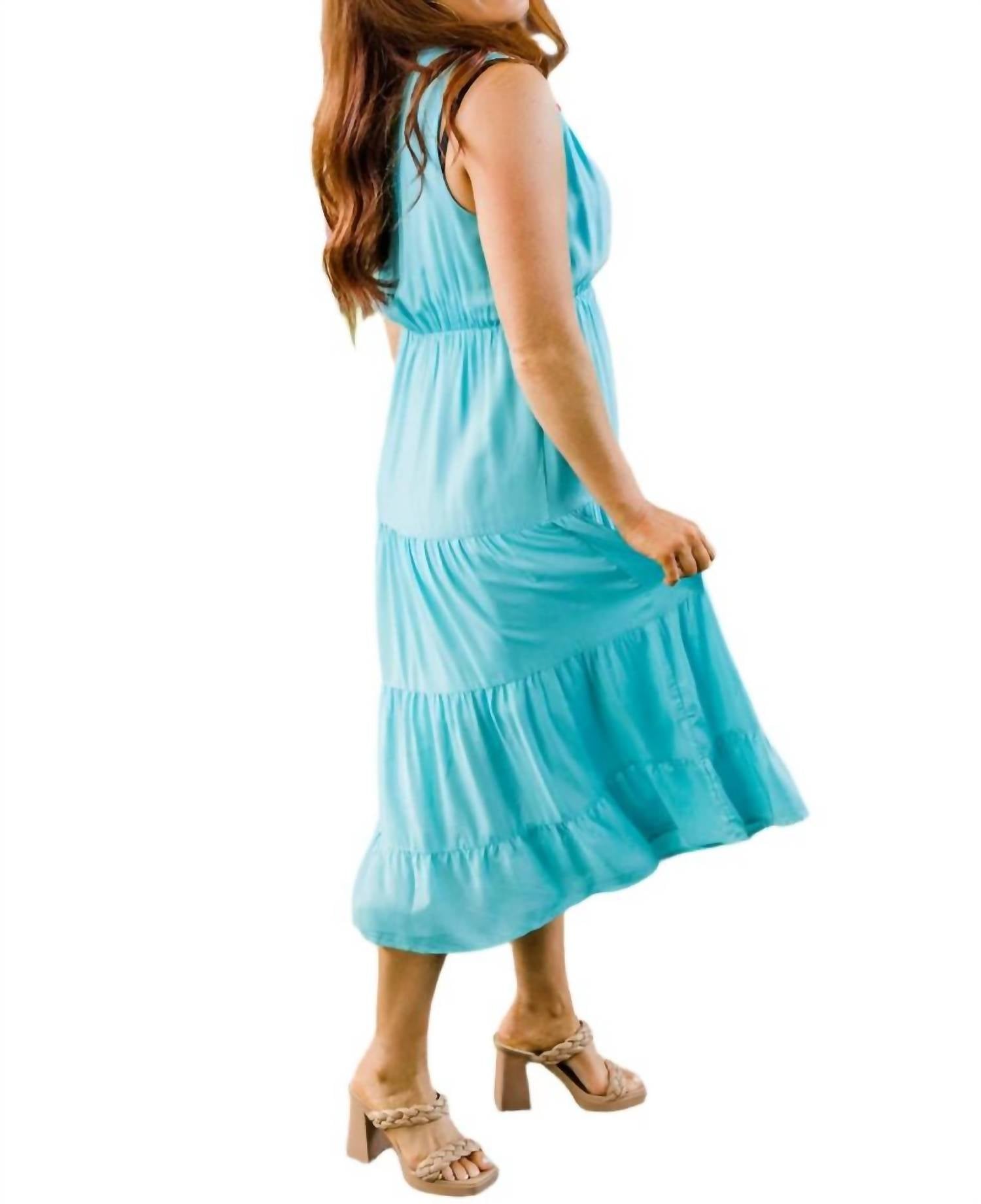 The perfect length dress does exist. Elevate your wardrobe with the Embroidered Midi Dress by Layerz Clothing, a chic choice for any occasion. This sleeveless dress, crafted from 100% Rayon, showcases vibrant embroidery on a turquoise background and features a stylish split V-neckline. Designed with a flattering tiered bodice and a midi silhouette, it comes with a convenient pull-on closure. Care instructions: Hand wash, hang dry, and do not bleach. Available sizes offer precise bust and length measurements for a perfect fit.