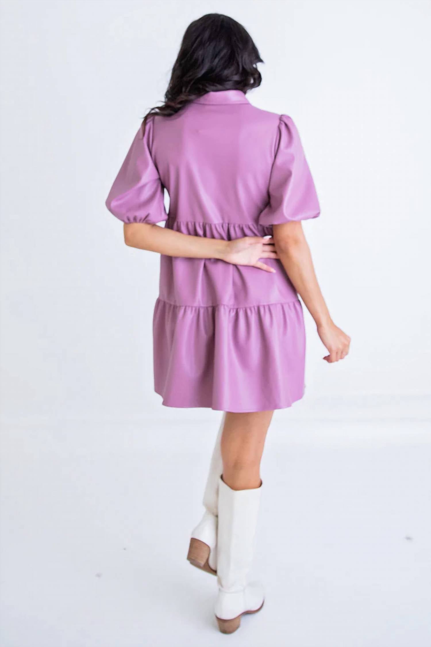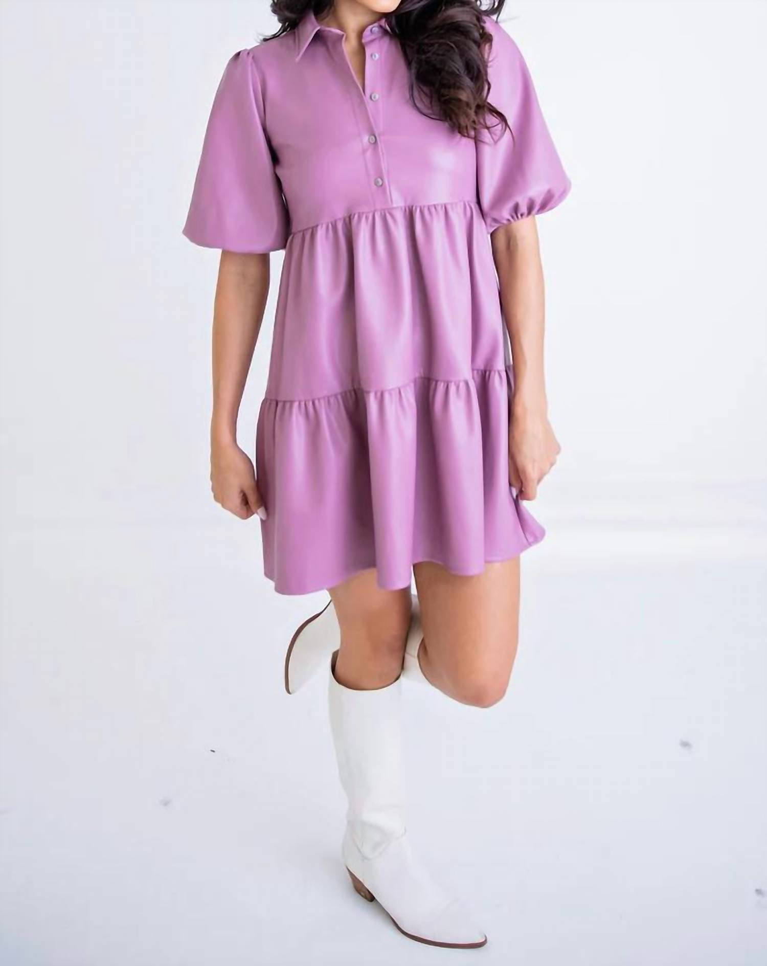 A short and breezy dress for those warmer days. Meet the Faux Leather Tier Dress by Karlie, a striking piece in vibrant purple perfect for any occasion. This mini Empire Waist dress boasts a solid pattern with short sleeves and a classic collar. Made from durable faux leather, it features a convenient button closure. Model is 5'10" and wears a size small.
