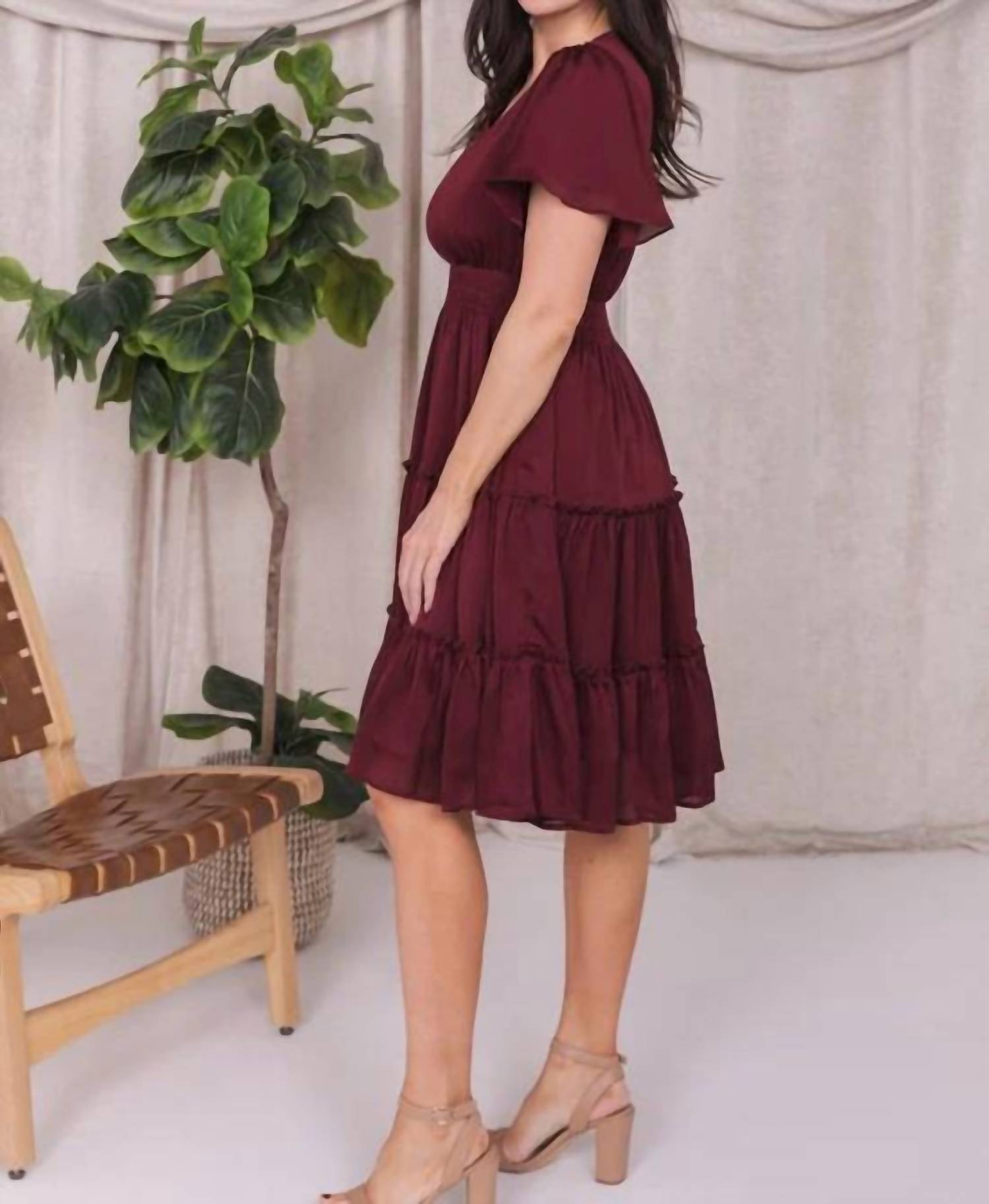 A short and breezy dress for those warmer days. Introducing the Sophia Zinfandel Dress by Mikarose, a refined choice in a rich maroon hue perfect for your wardrobe. This dress features short flutter sleeves and a V-neckline, complemented by a smocked waistline and a tiered A-line silhouette that falls to a knee length. Crafted from 100% Polyester, it offers both style and comfort with its pull-on closure. Care: Hand wash only. Model is wearing a size XS.