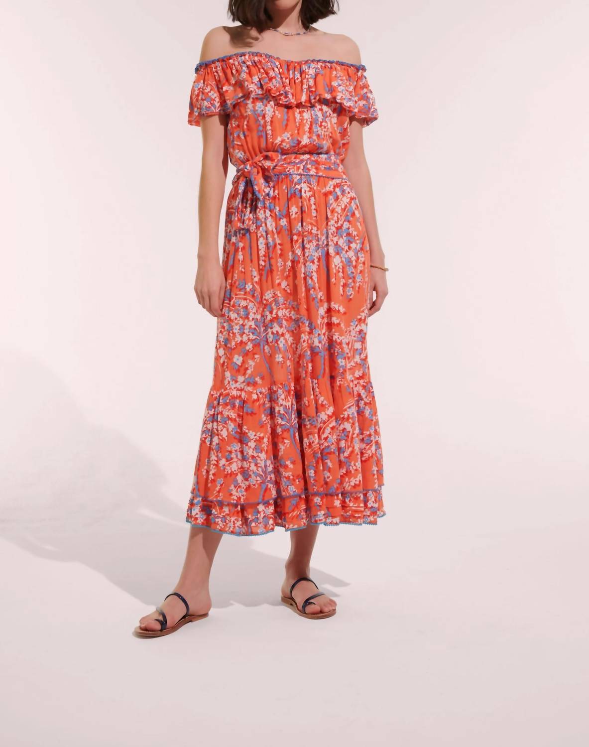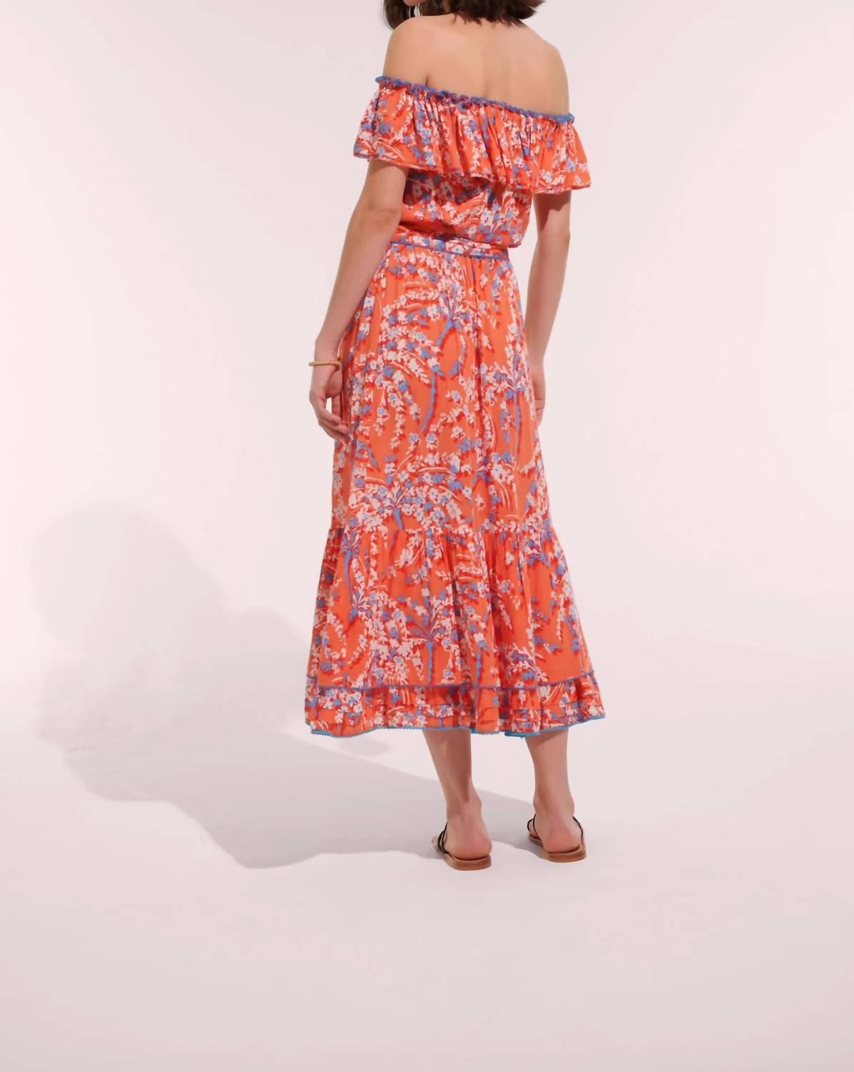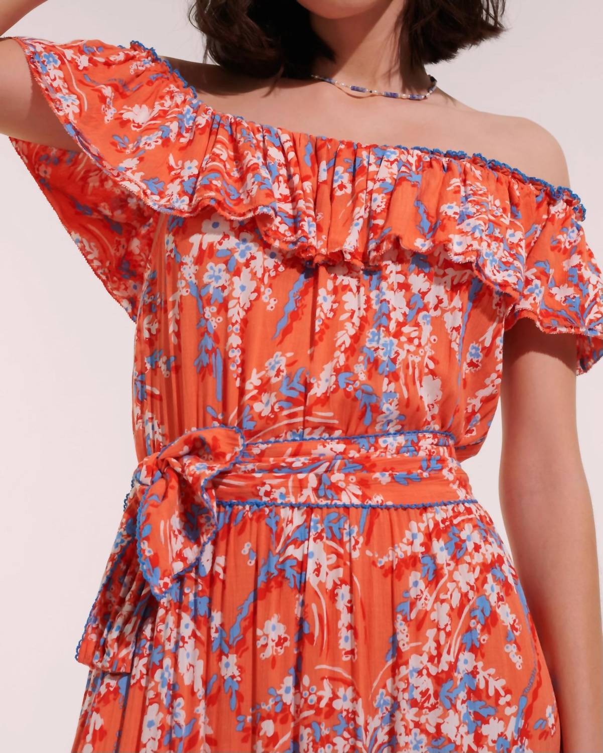 A maxi dress that is just as cute as it is comfortable. Discover timeless elegance with the Bella Ruffled Off Shoulder Belted Long Dress by Poupette St Barth in a captivating Orange Palmery floral pattern. Crafted from 100% Viscose, this maxi dress features a graceful A-line silhouette and textured ruffled shoulders for added flair. Designed with a casual pull-on style, it offers effortless sophistication perfect for any summer occasion. Care for this exquisite piece by hand washing and laying flat to dry.
