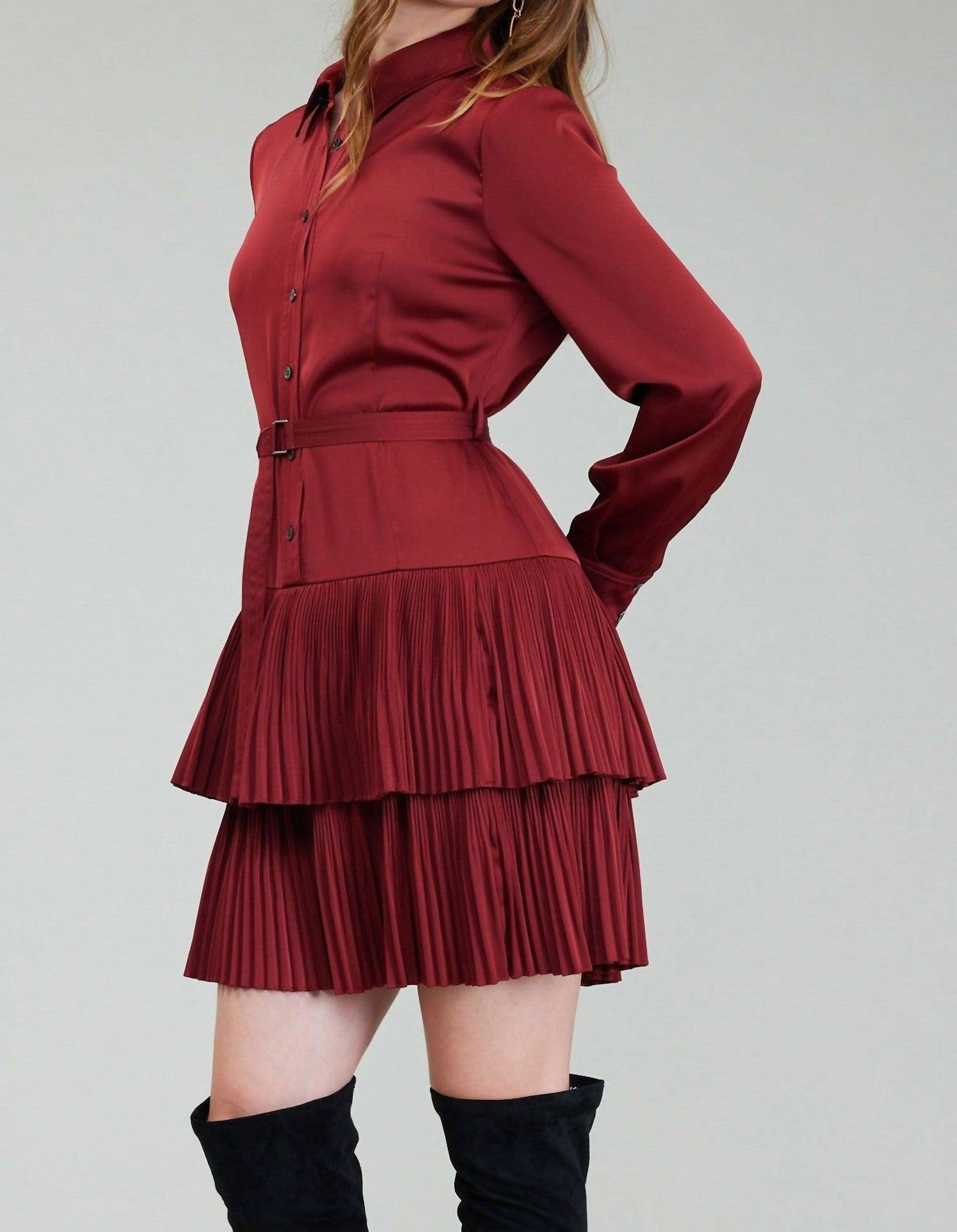 The perfect mini dress for those warmer months. Introducing the Nyland Saffira Shirt Dress in a striking Burnt Umber hue, designed for the modern woman. This mini-length dress features long sleeves and a classic collar, crafted from durable polyester for a solid, sleek look. The pleated tie detail adds a touch of elegance, while the convenient button closure and practical pockets ensure functionality. Care for this stylish piece with ease, as it is machine washable.