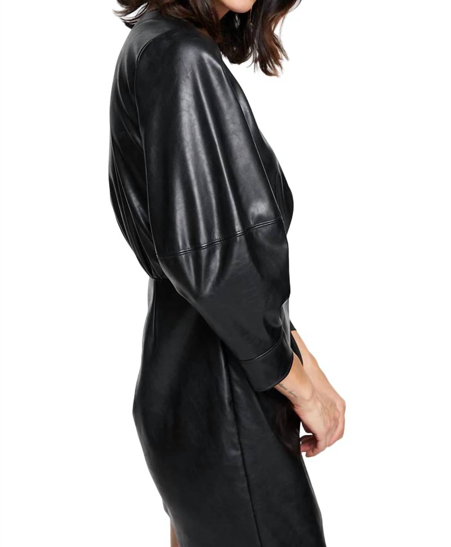 A short and breezy dress for those warmer days. This vegan leather mini dress features a wrap-inspired silhouette and long sleeves. Made from 100% polyurethane, it is dry clean only. Made in the USA.