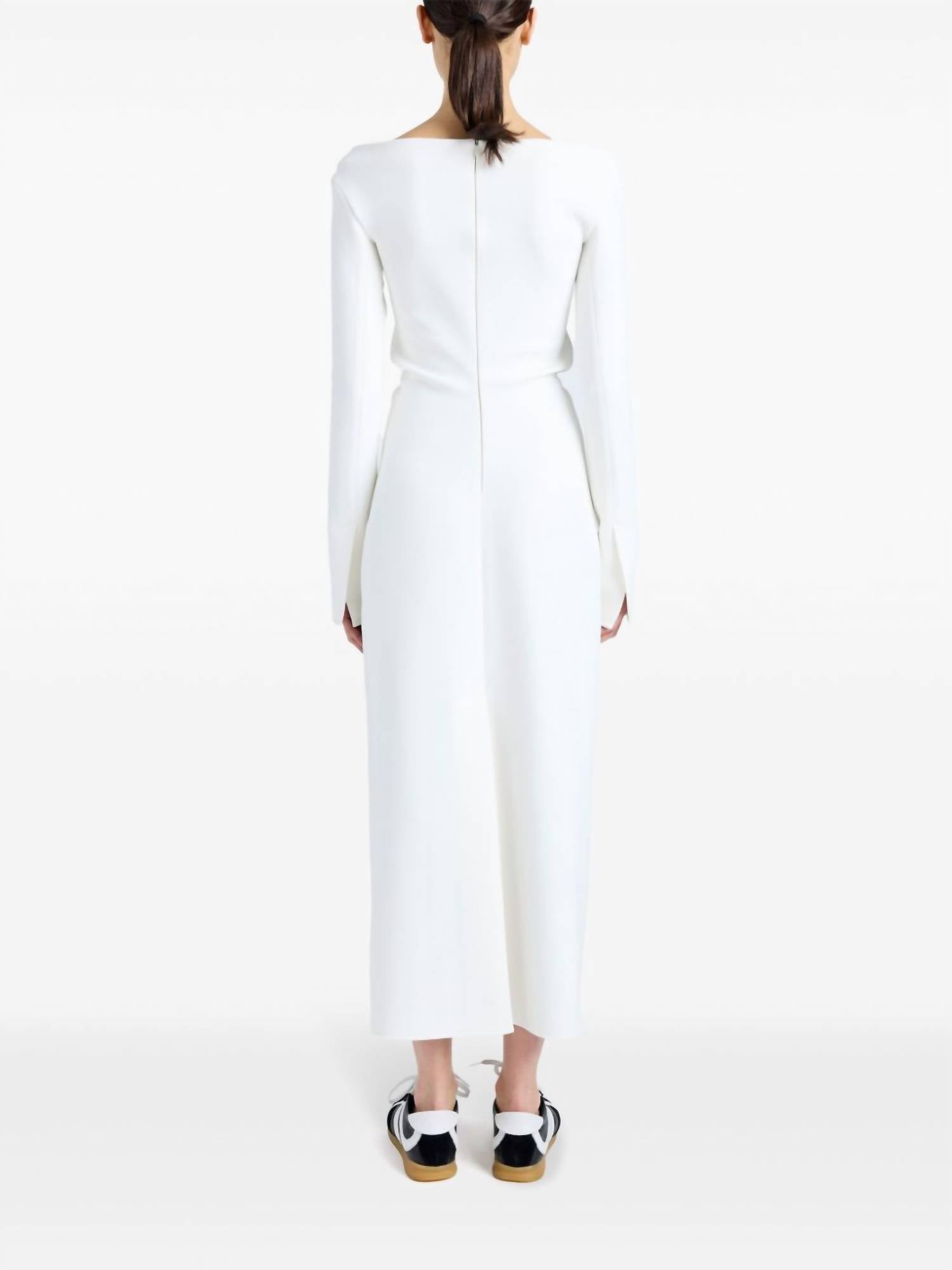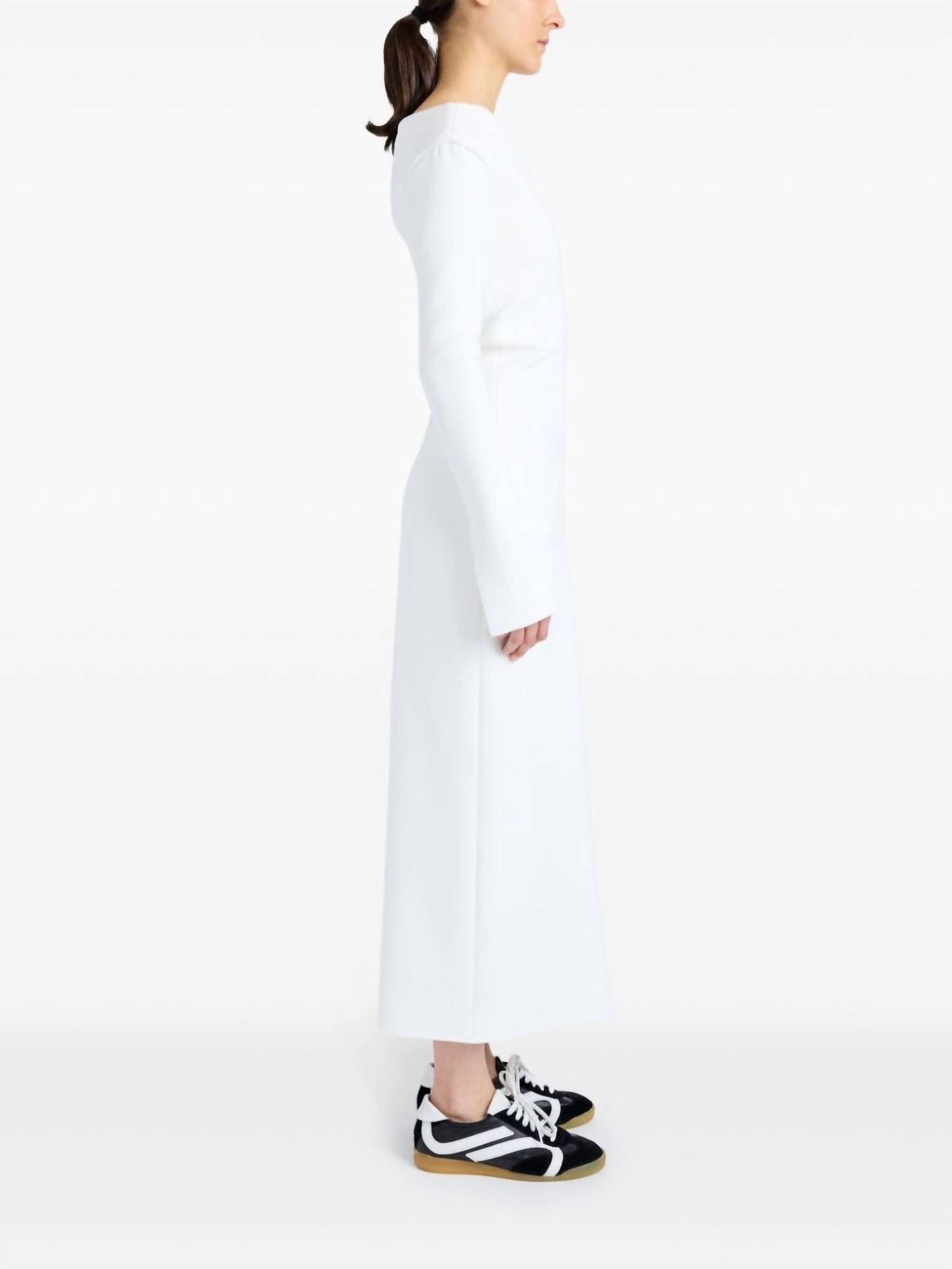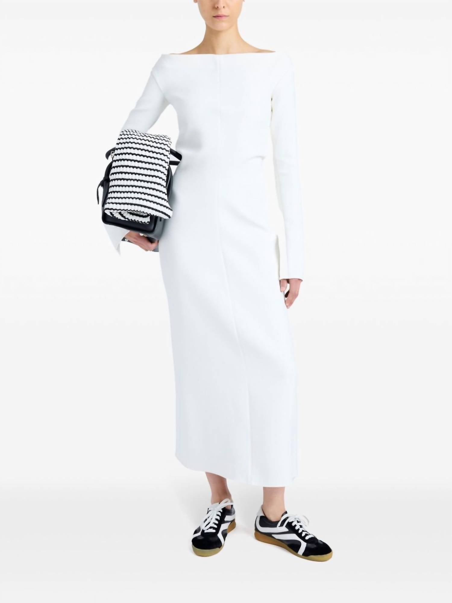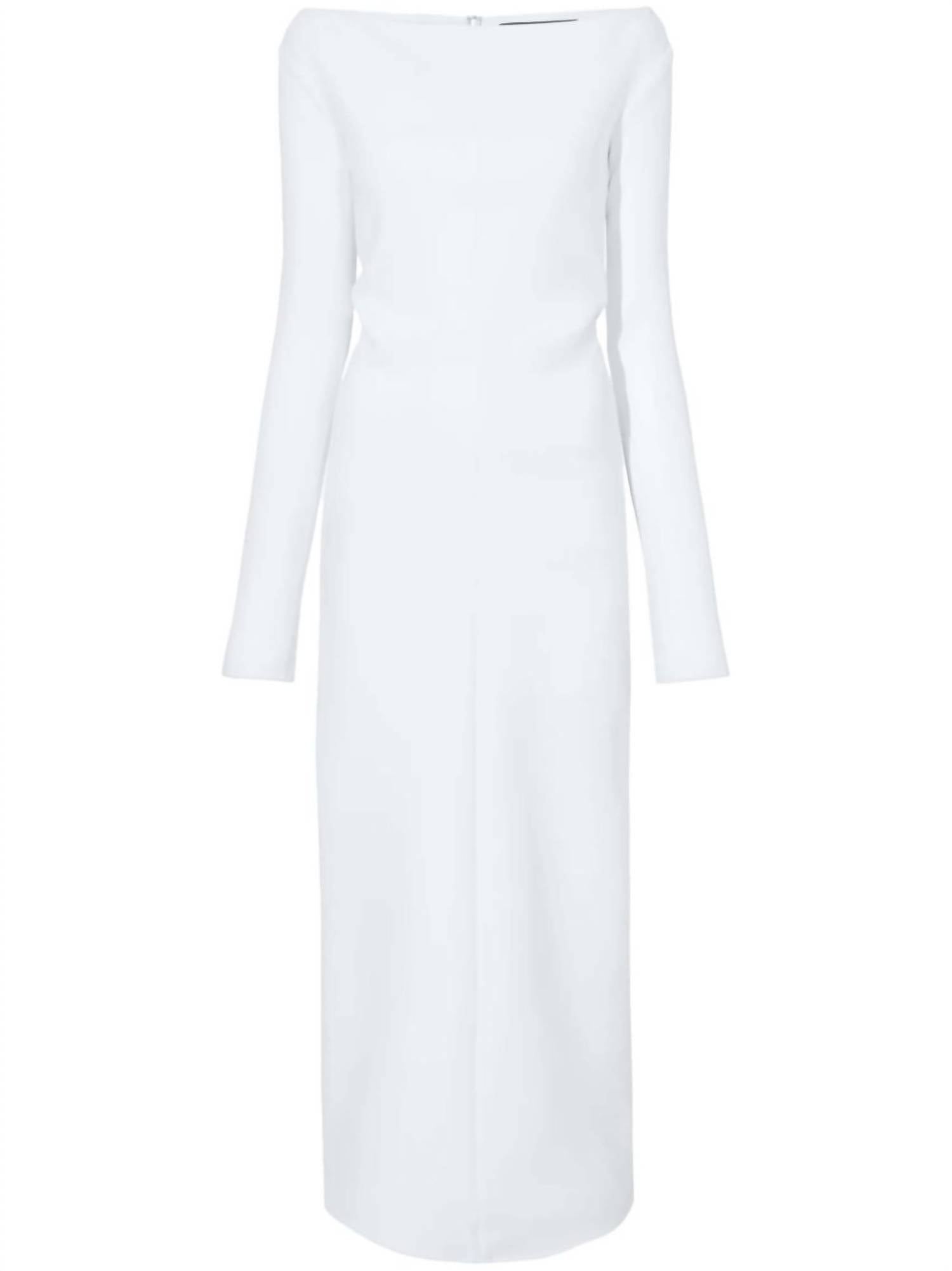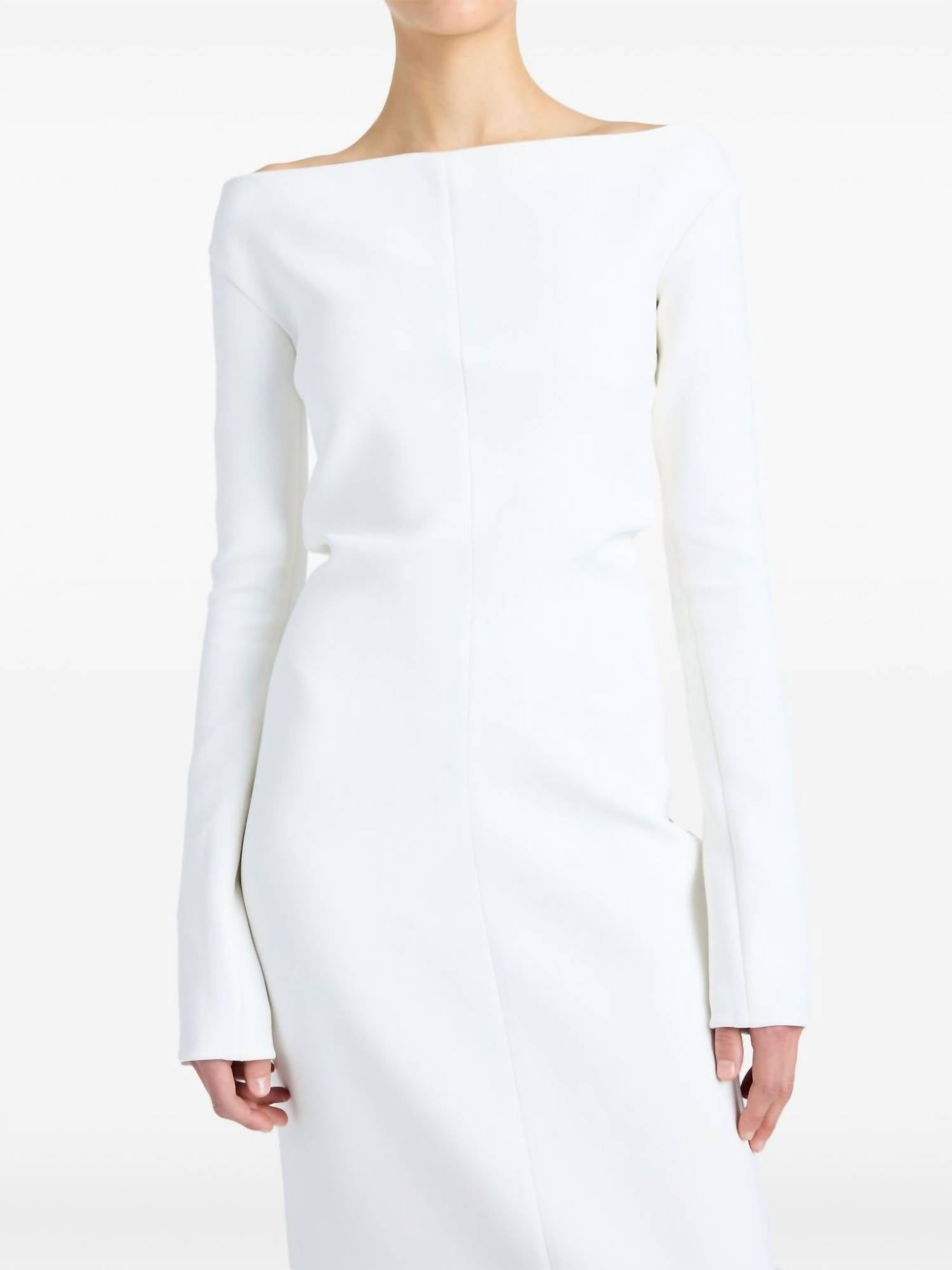 The pefect long sleeve dress for those cooler months. Introducing the Tara Dress by Proenza Schouler, a sleek gown in Off White designed for sophistication. This long sleeve sheath dress features an elegant off-the-shoulder neckline and bi-stretch suiting for a flattering fit. Crafted with 92% viscose and 8% elastane, it includes a convenient zip closure for easy wear. Care: Dry clean only.