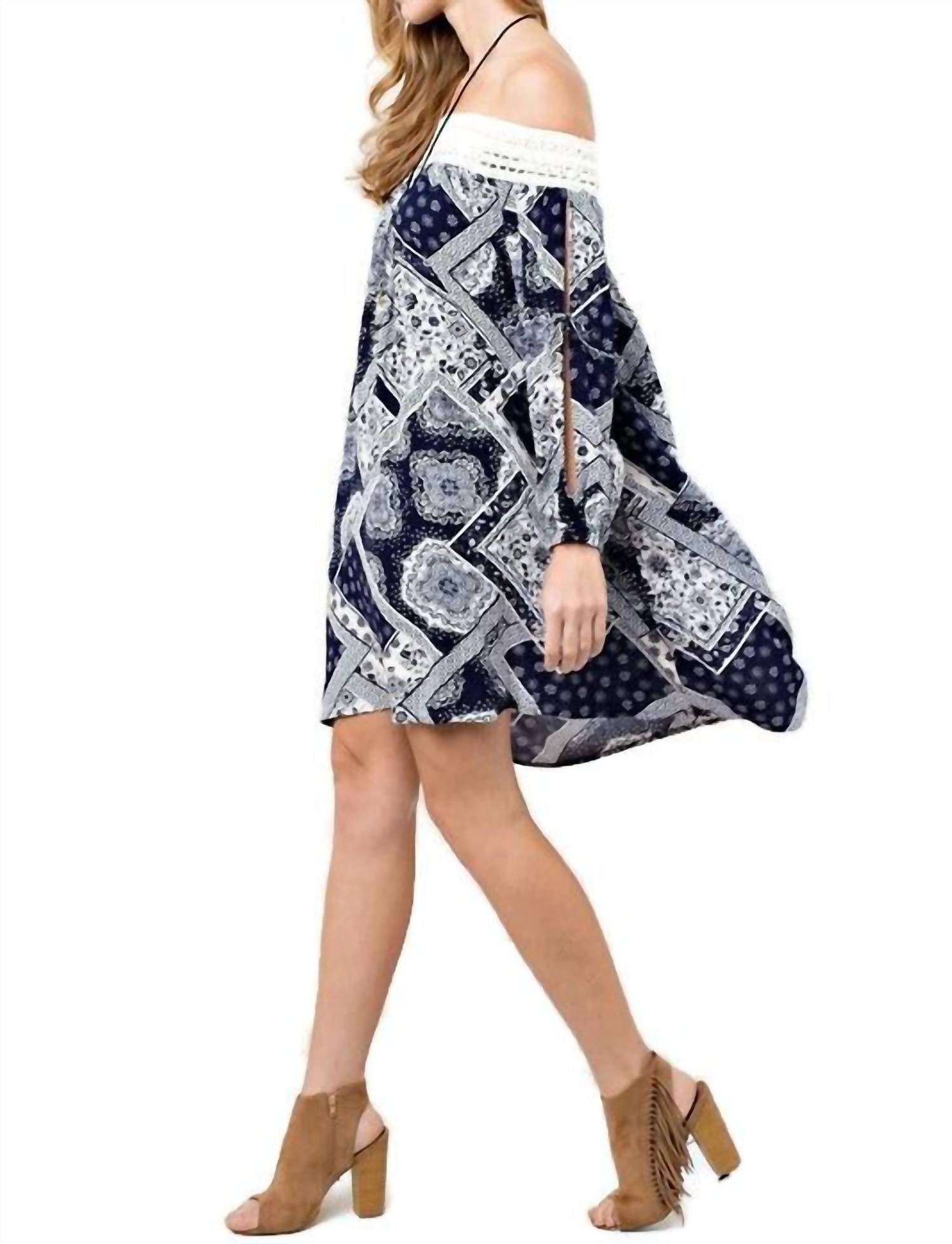 Comfortable and cute, this casual day dress has it all. Step into style with the Batik Patchwork Off the Shoulder Dress by KORI, a perfect casual piece in a sand hue. This long sleeve dress boasts a chic crochet off-the-shoulder elastic neckline, open sleeves with elastic at the hem and ties, and a flattering A-line silhouette. Constructed from 100% Rayon, it offers breathable comfort and effortless charm. Closure: Pull on. Care: Hand wash or dry clean. Sizes available: Small (Bust 38", Length 31"), Medium (Bust 40", Length 31"), Large (Bust 42", Length 31").