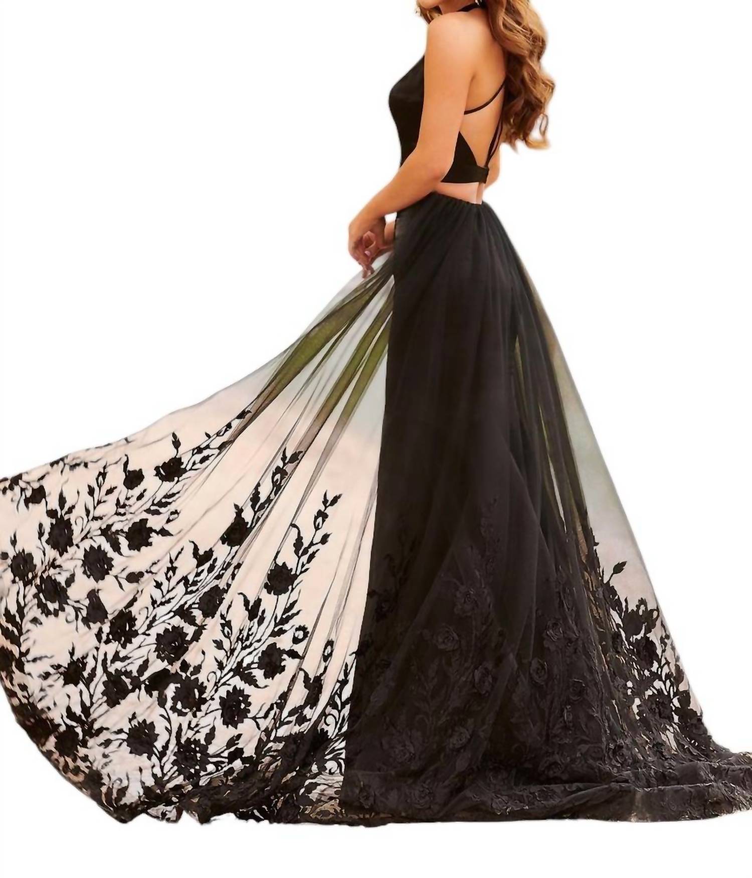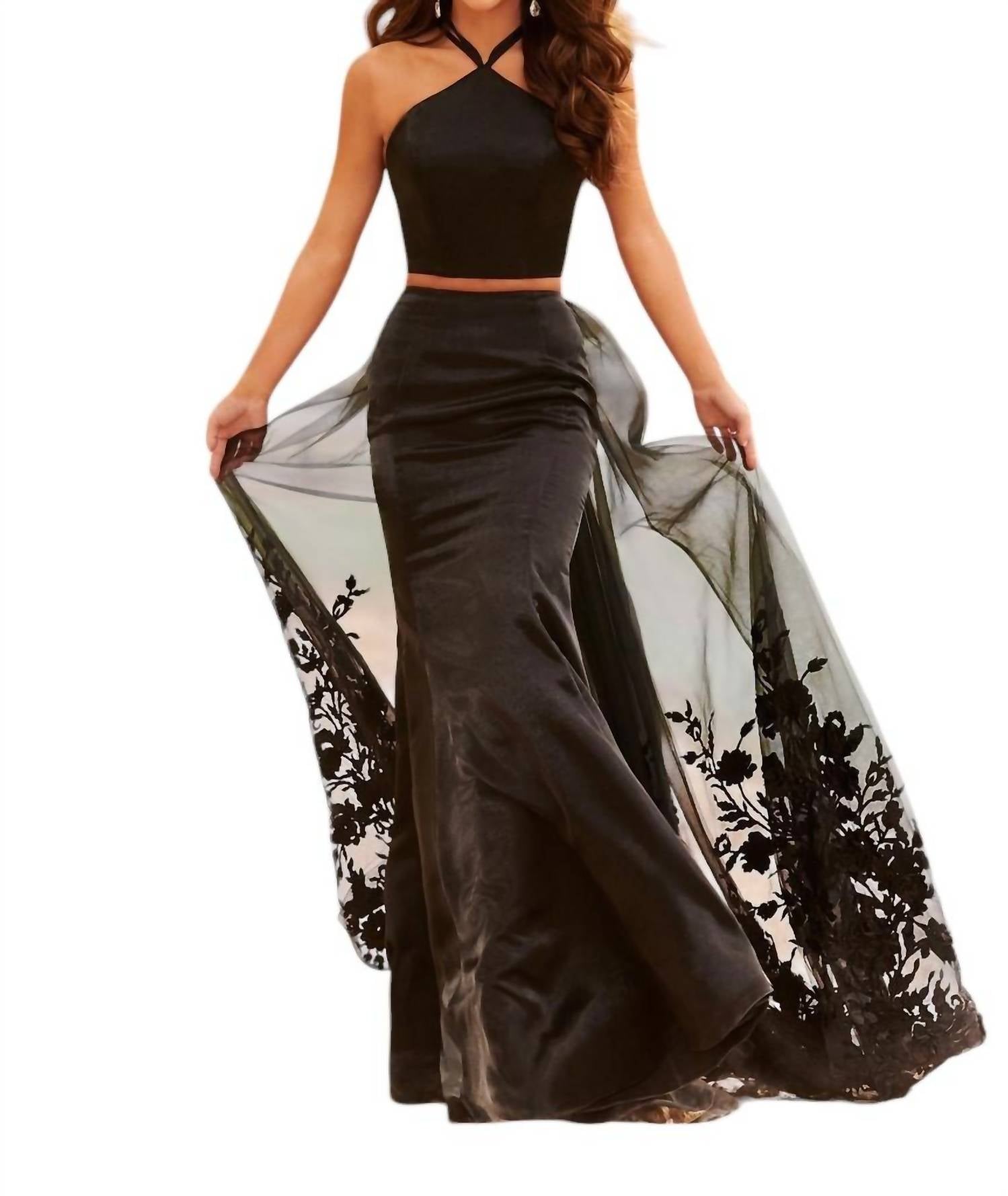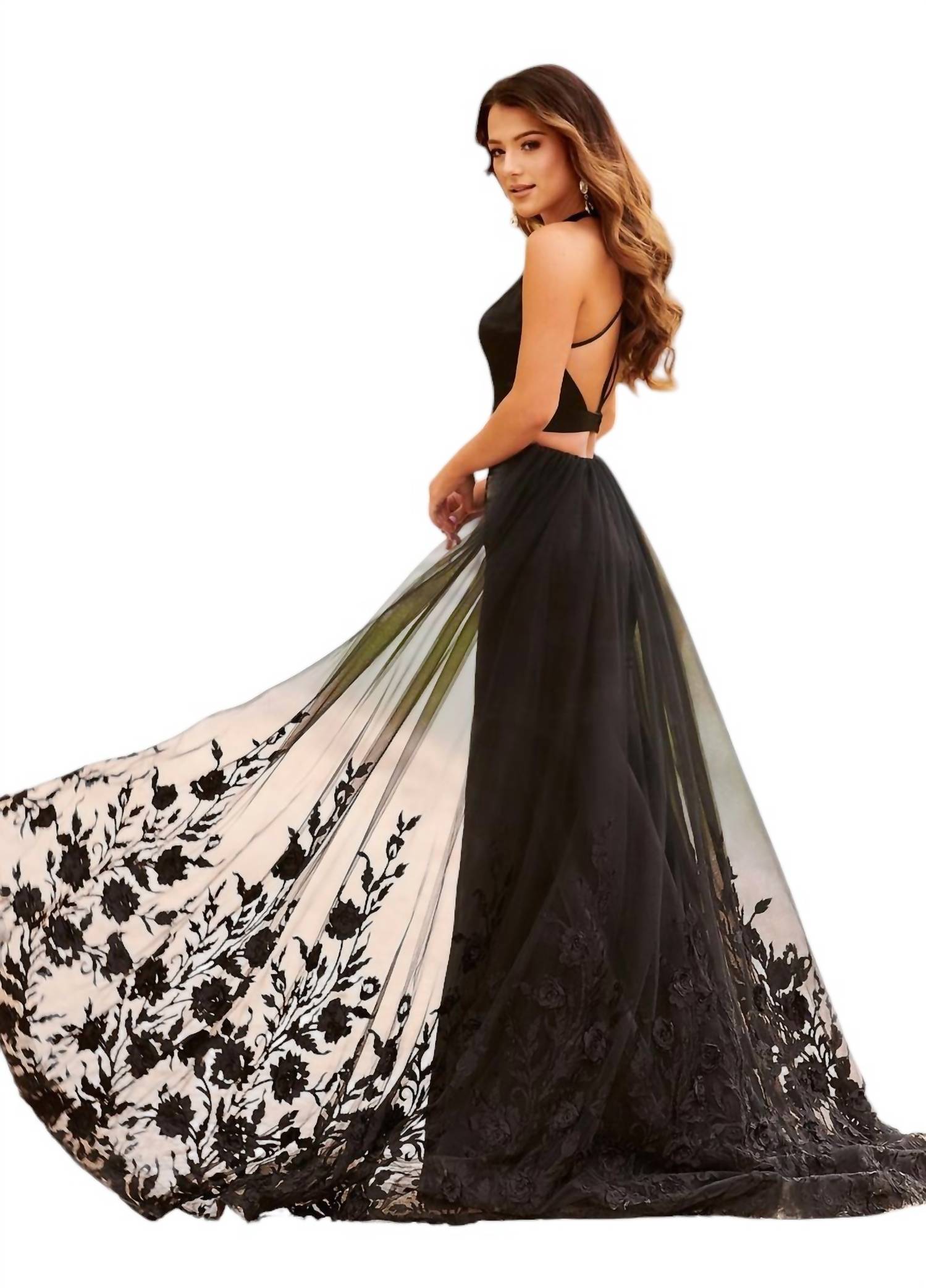Looking for that perfect event dress? Look no further... Discover the elegance of the PROM DRESS by RACHEL ALLAN, perfect for making a statement. With its sleeveless satin top, this ensemble exudes sophistication with a halter neckline featuring criss-cross back straps. The mermaid silhouette is enhanced by a tulle embroidered overlay, creating a dramatic flair. Material: Satin. Color: Black. Occasion: Prom.
