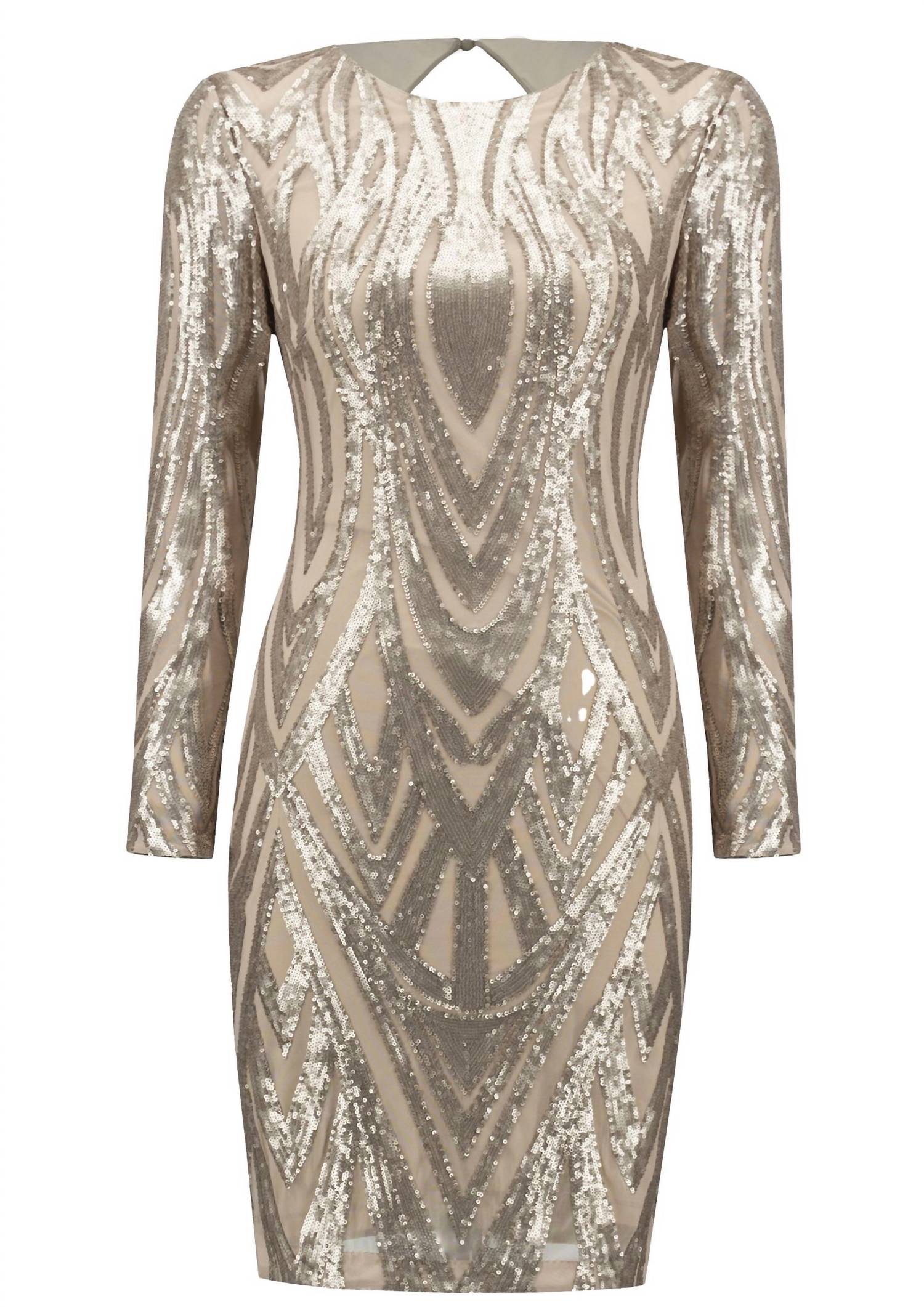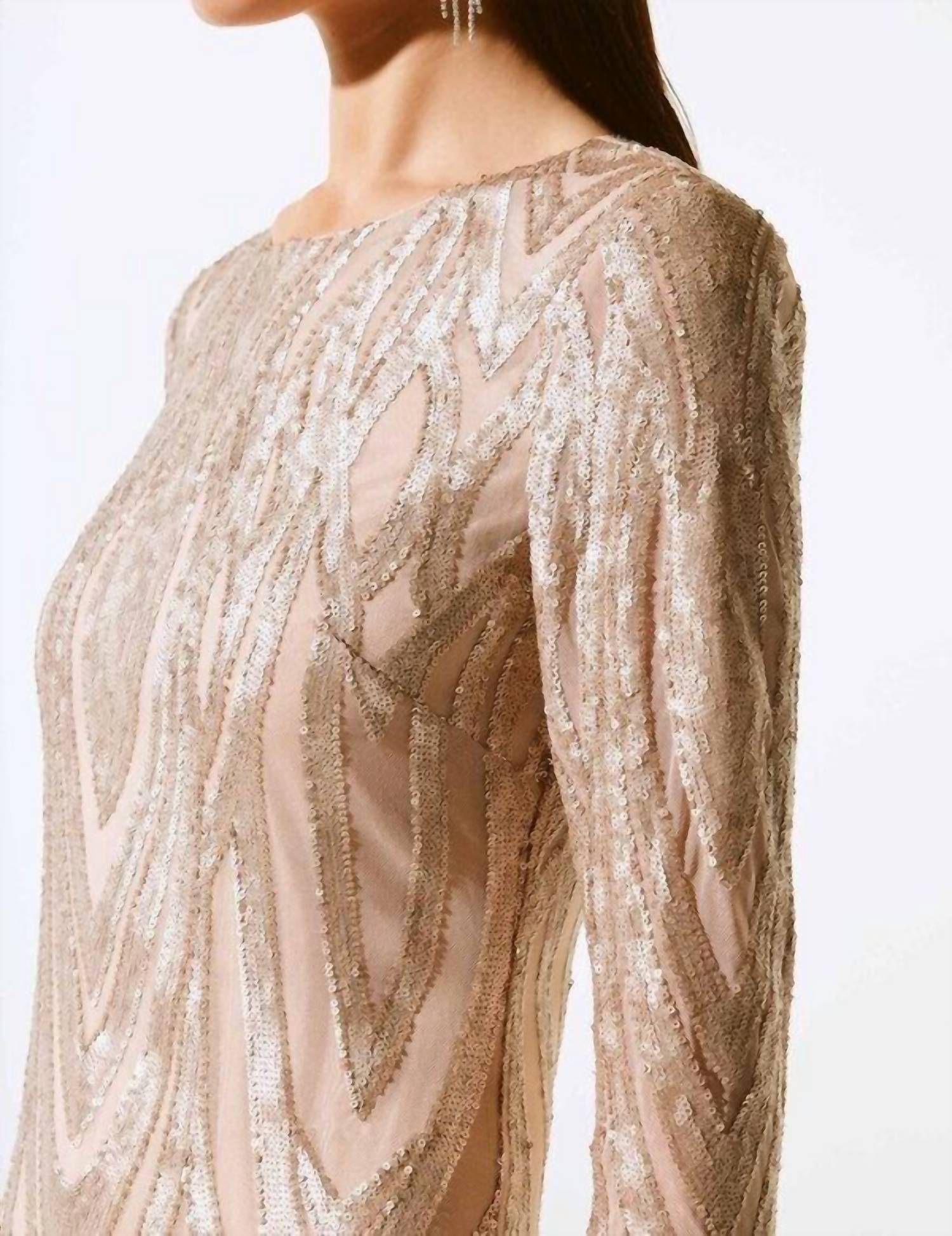 A short and breezy dress for those warmer days. Featuring long sleeves and crafted from 95% Polyester and 5% Spandex, this matte gold dress offers a mesmerizing sequined pattern. Falling gracefully to the knees with an approximate length of 41", it includes a keyhole detail at the back and shoulder pads for added structure. Made in Canada, this A-line dress is lined, with a zip closure for easy wear. Model is 5'9" and wears a size 6.