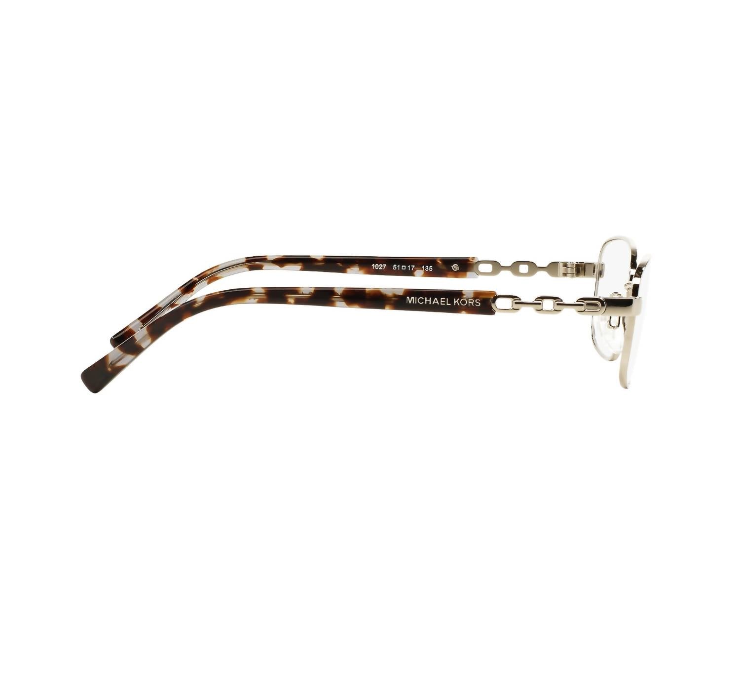 Blending fashion and practicality, these stylish shades are chic and mandatory. Stand out from the crowd and safeguard your vision with these stand-out sunglasses. Elevate your eyewear collection with the Women's Sabina Vi Eyeglasses by MICHAEL KORS, a chic choice in a sophisticated rectangle style. Crafted from stainless steel, these eyeglasses boast a 53 mm lens width, a 135 mm arm length, and a 17 mm bridge width. The silver metal frame with a chain link on celluloid staffs in brown havana and an engraved logo adds a modern and elegant touch. Perfect for a polished and contemporary look, these eyeglasses are a testament to refined design.