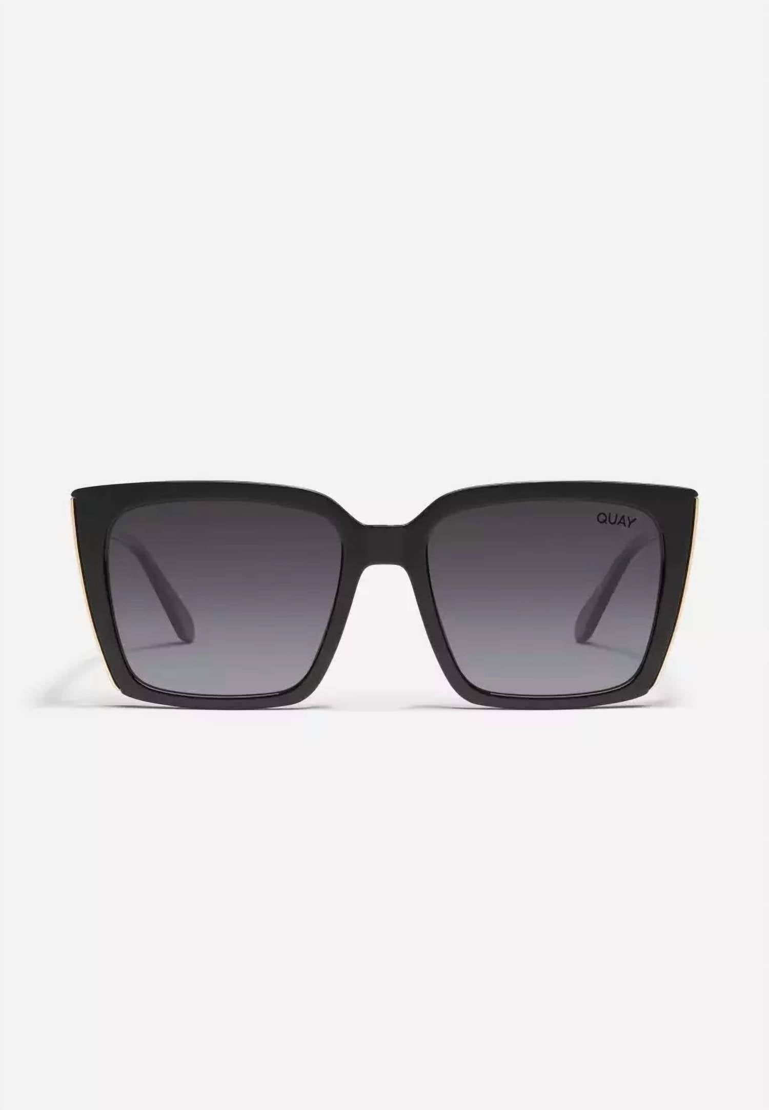 Make a statement and shield your eyes in these fashionable, yet practical sunglasses. Grab these adorable shades for your next vacation and elevate your accessory game. Elevate your style with the Women's Front Cover Sunglasses by QUAY, featuring oversized square frames in sleek shiny black. These sunglasses boast gradient smoke polarized lenses for superior eye protection. They are adorned with luxurious gold bar accents on the sides and come with a thin arm design, showcasing the Quay name in gold at the temples. Each pair includes a Quay black canvas sunglasses case and lens cloth, ensuring your eyewear remains in pristine condition. Lens width: 55mm, Bridge: 19mm, Temple: 148mm.